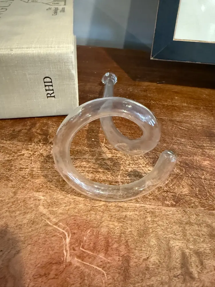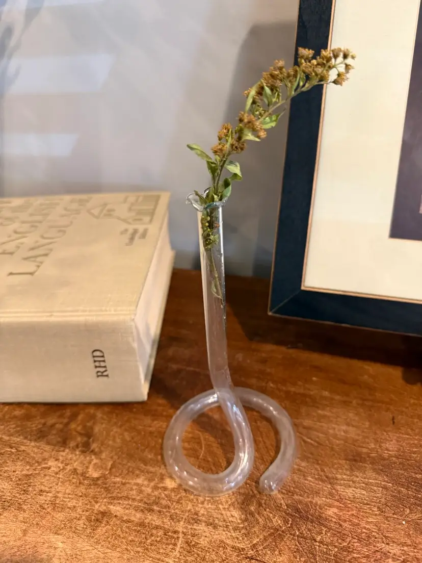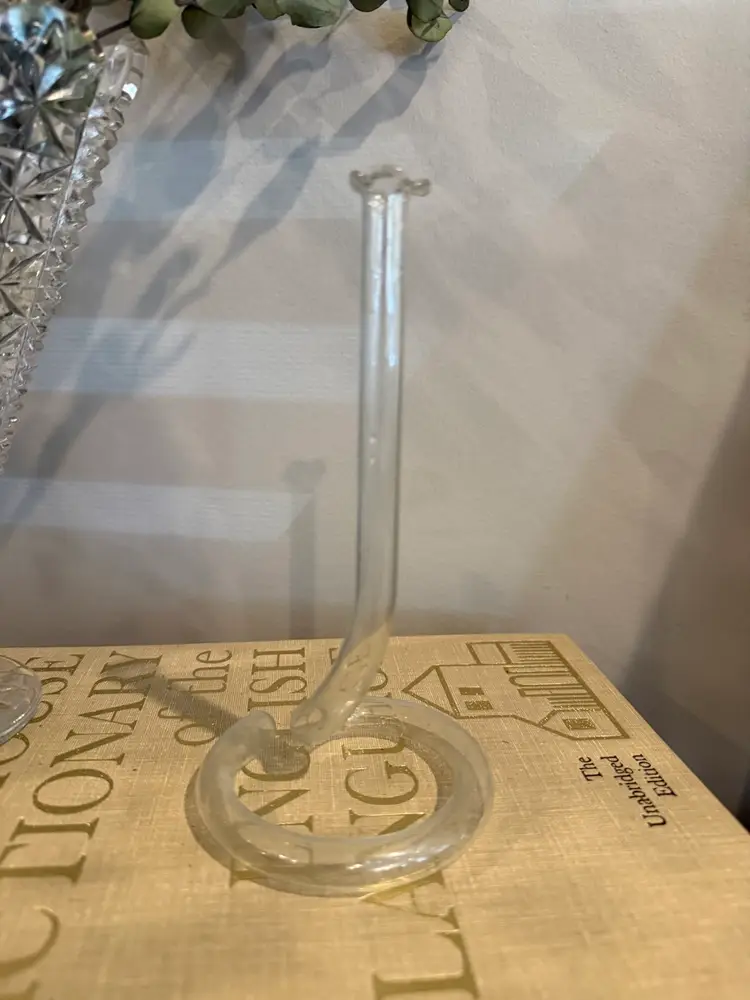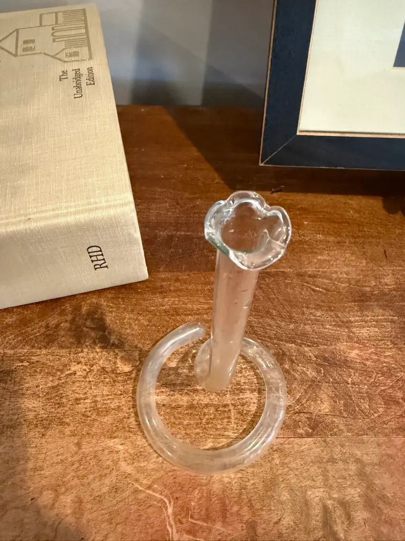 Vintage Clear Glass Stem Twisted Bud Vase. This unique piece features a clear glass construction with a distinctive stem and twisted design, perfect for showcasing small floral arrangements or single buds. Its sculptural form makes it a beautiful decorative object even when empty. Excellent pre-owned condition with no chips or cracks. An ideal addition to any vintage decor collection or as a standalone art piece.