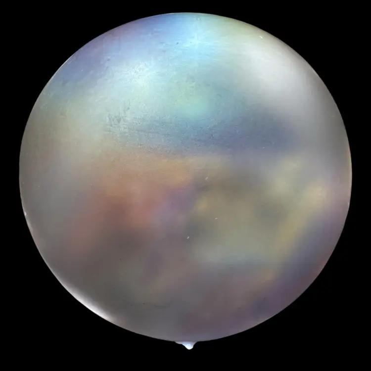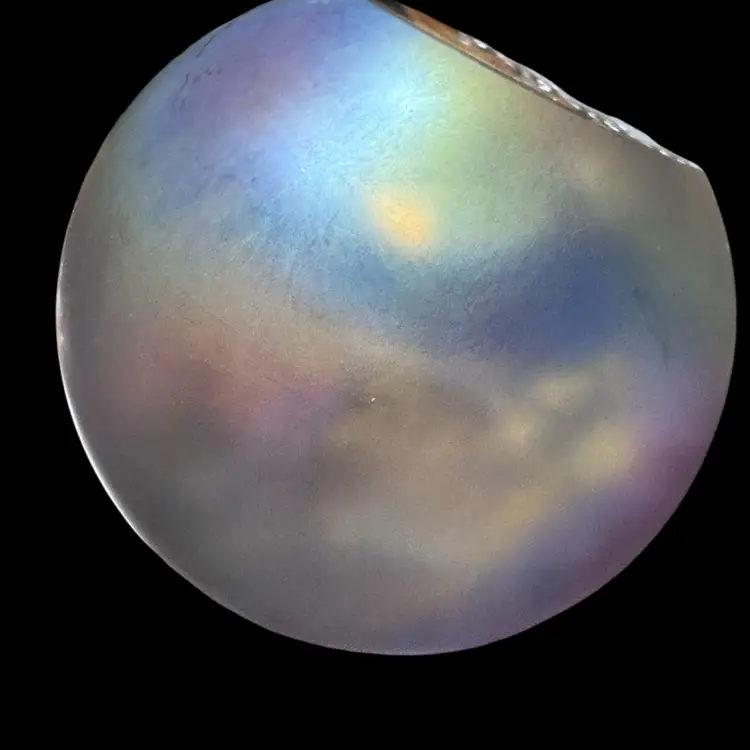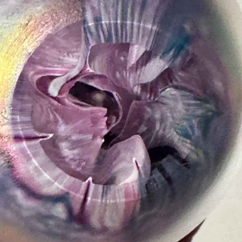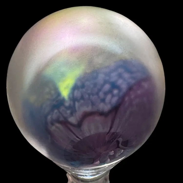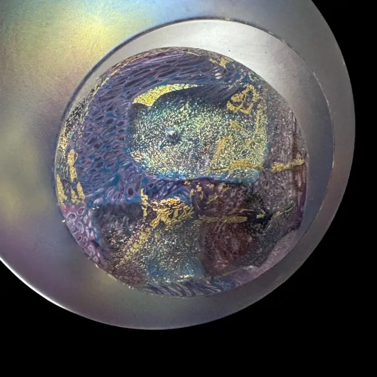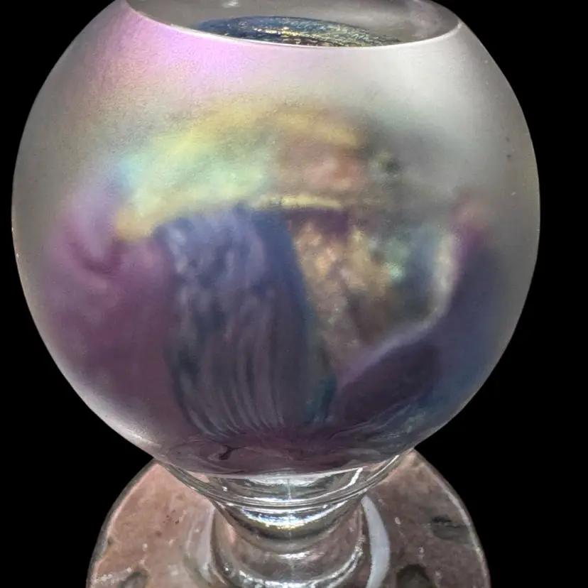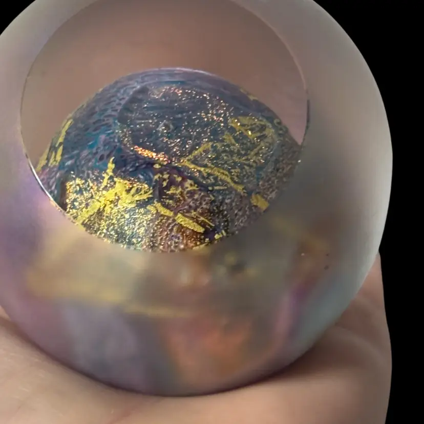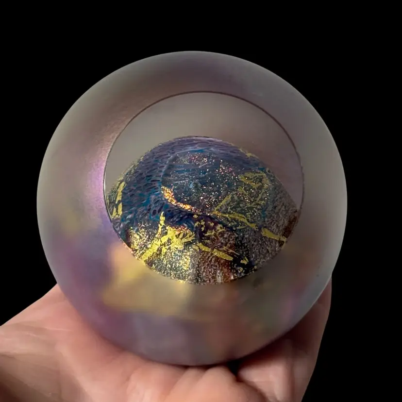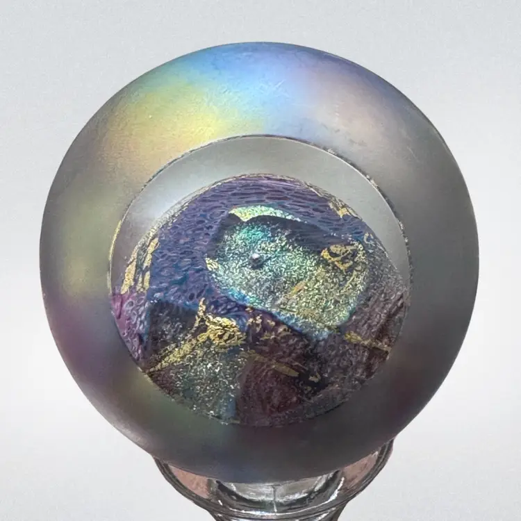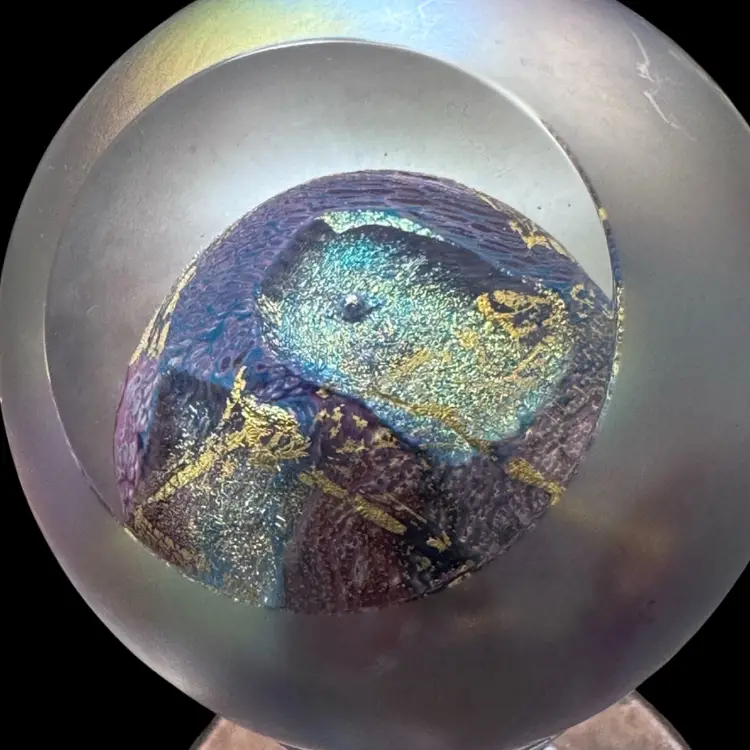 I love this GES paperweight and the dichroic glass is beautiful with the iridescent color shifts in gold, blue, purple. Heavy art glass sphere with multi colored shimmery planet visible through a flat cut 'window'. Outside sphere is a frosted iridescent finish. Measures approximately 3" in diameter. It is clearly marked GES 98. Excellent condition, no call outs.