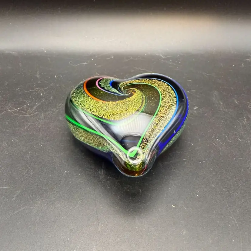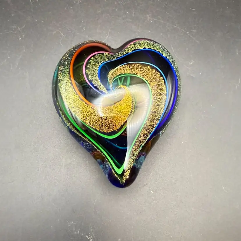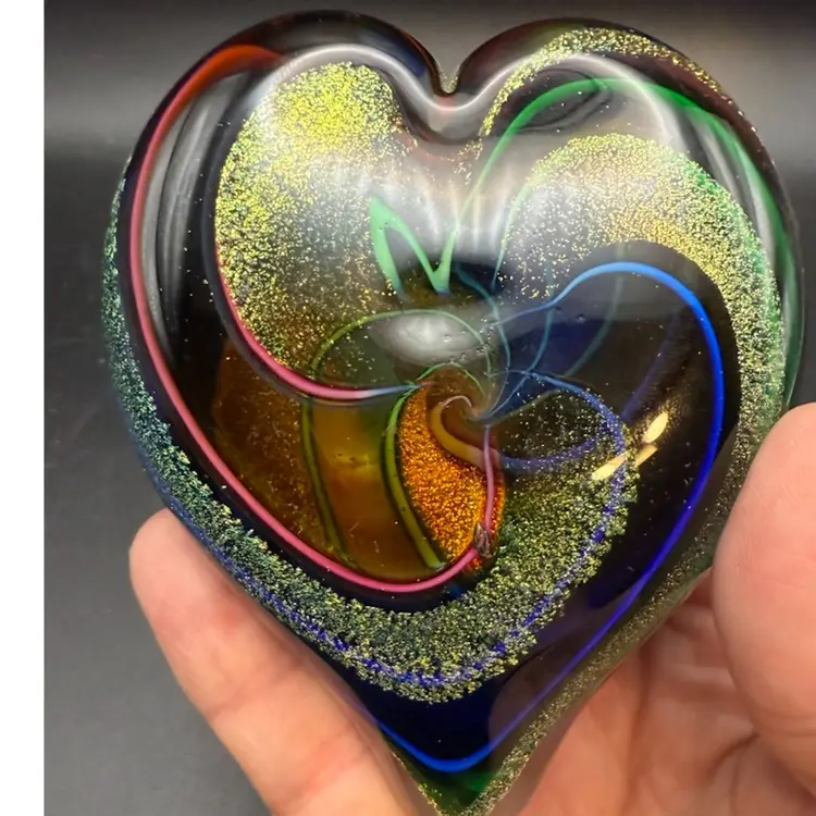 From Glass Eye Studio, a heart-shaped glass art piece, likely a paperweight or decorative object. It features a dark, possibly black or deep blue, base color with vibrant, swirling patterns embedded within the glass. These patterns include iridescent lines in colors such as blue, green, orange, and pink, which coil around a central area. A prominent feature is the sparkling gold-flecked material, possibly aventurine glass, which forms a large spiral within the heart, creating a sense of depth and movement. A white, translucent swirl also emanates from the center, contributing to the dynamic design.