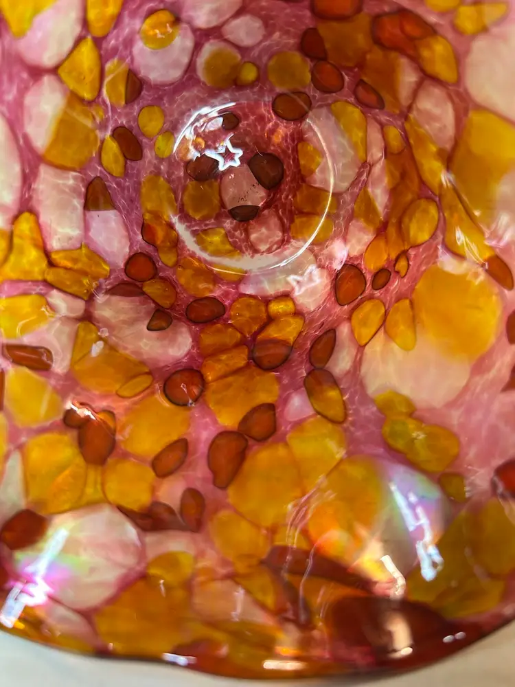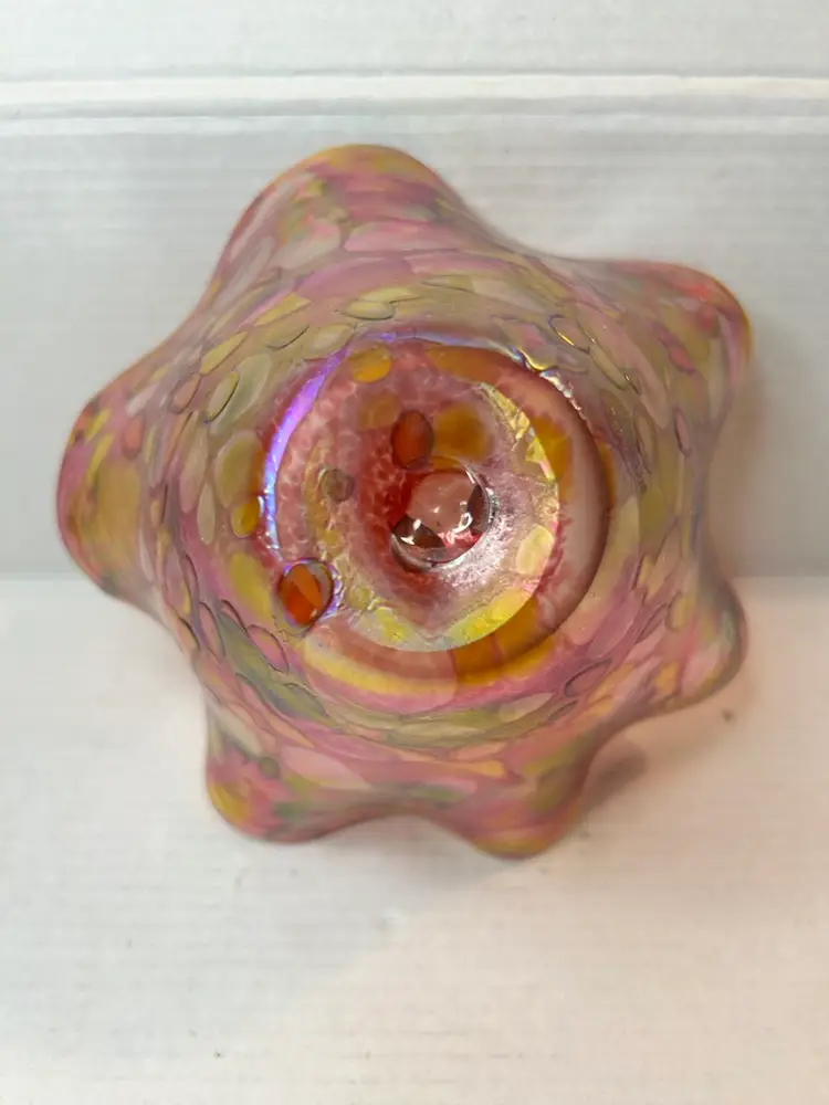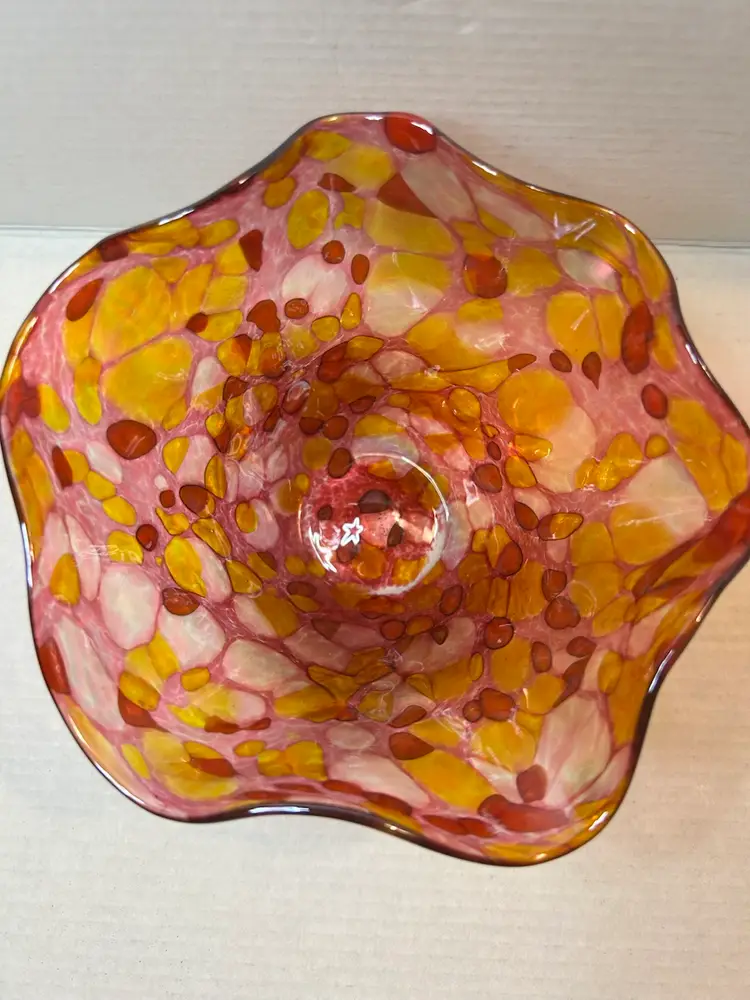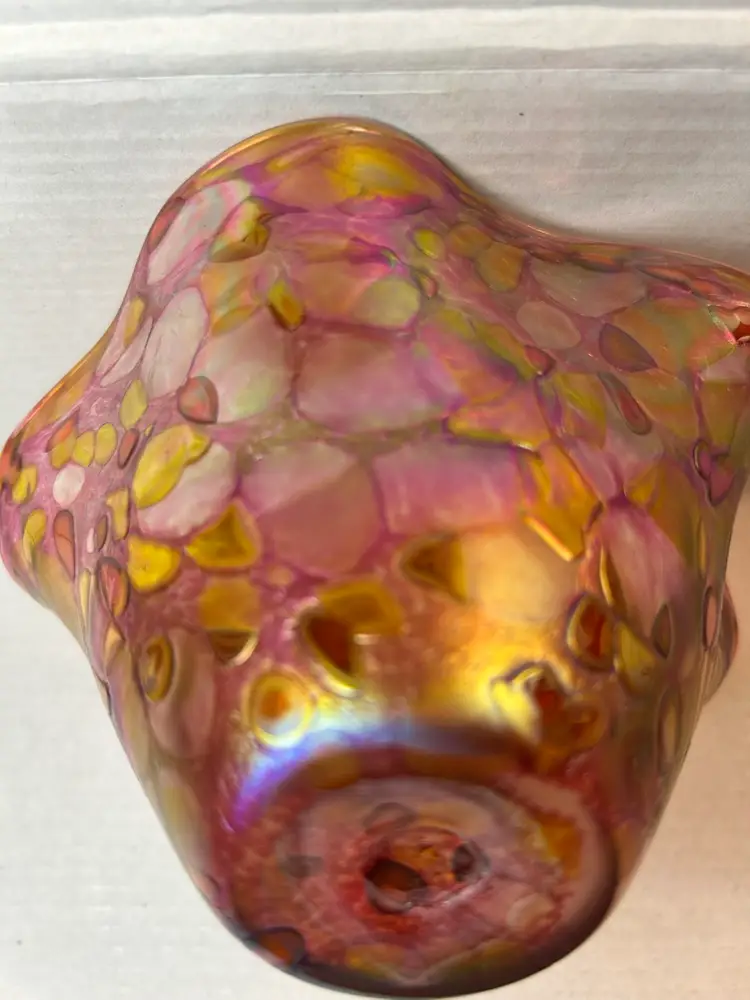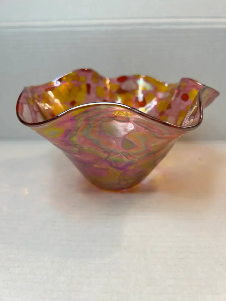 The free-form, ruffled edge and iridescent finish are characteristic of the studio's style.