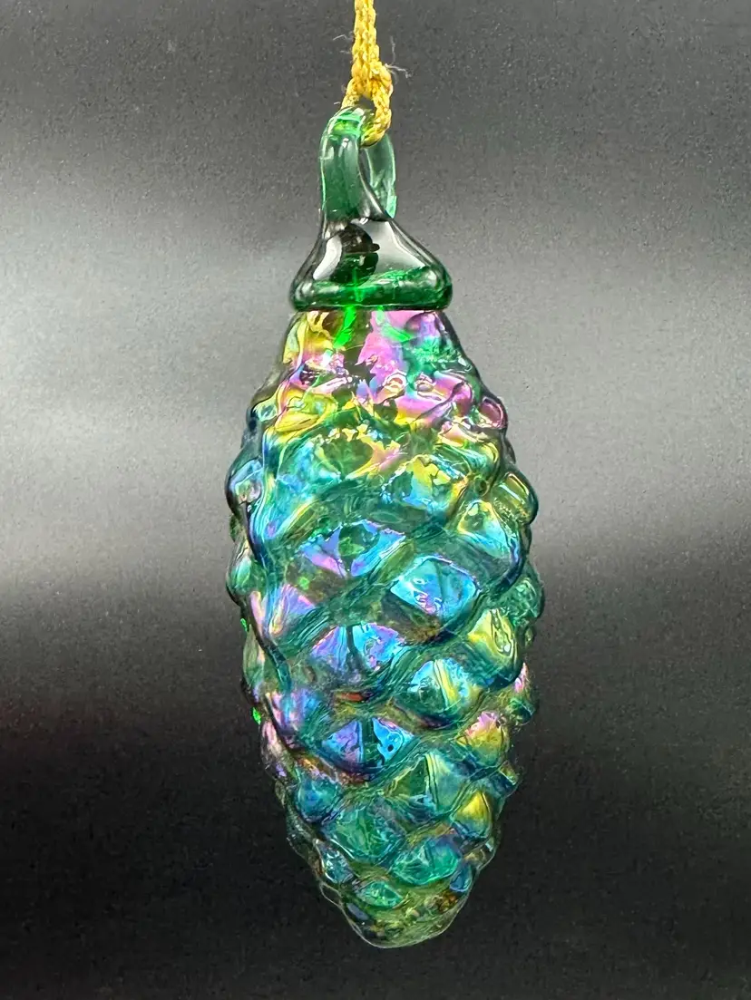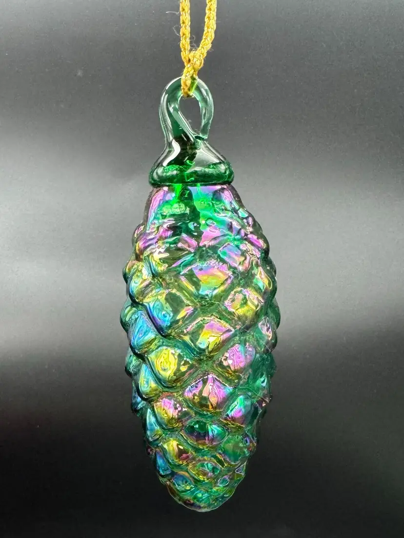Beautiful artisan blown glass pinecone ornament in iridescent green. Approximately 4.25" long.