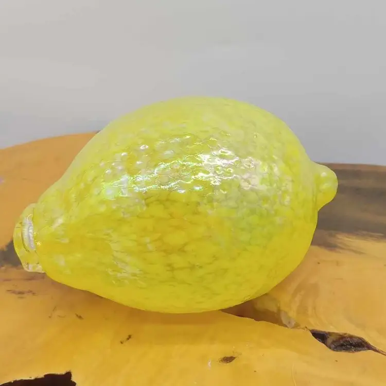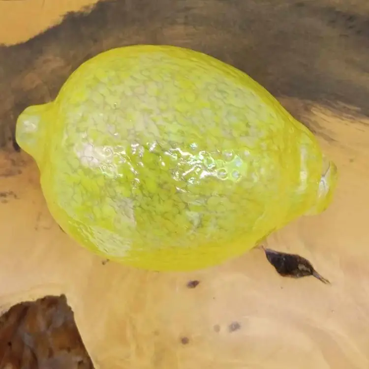 Here's another Glass Eye Studios glass fruit. It's an iridescent yellow lemon with speckles. It's 3 7/8 inches long and has no chips or cracks.