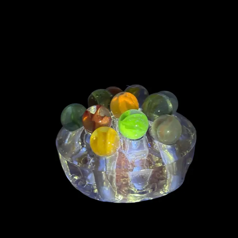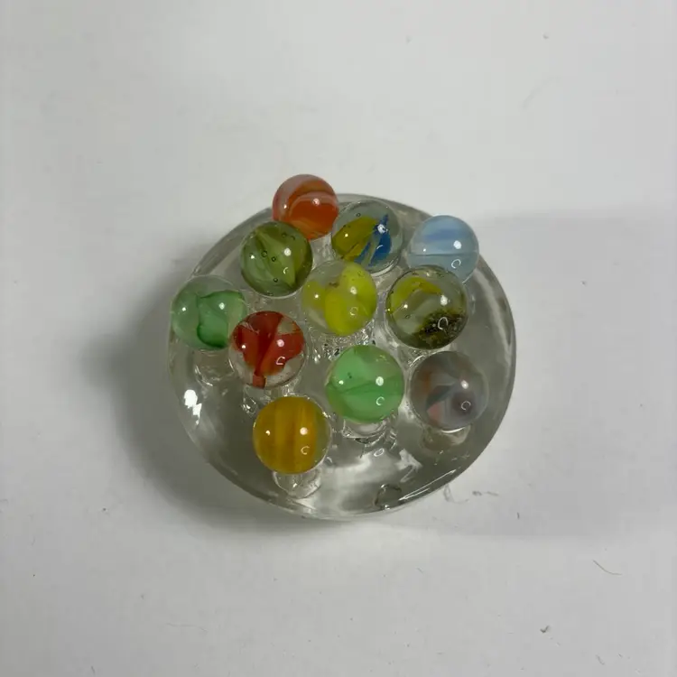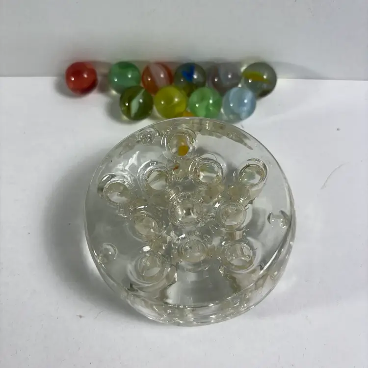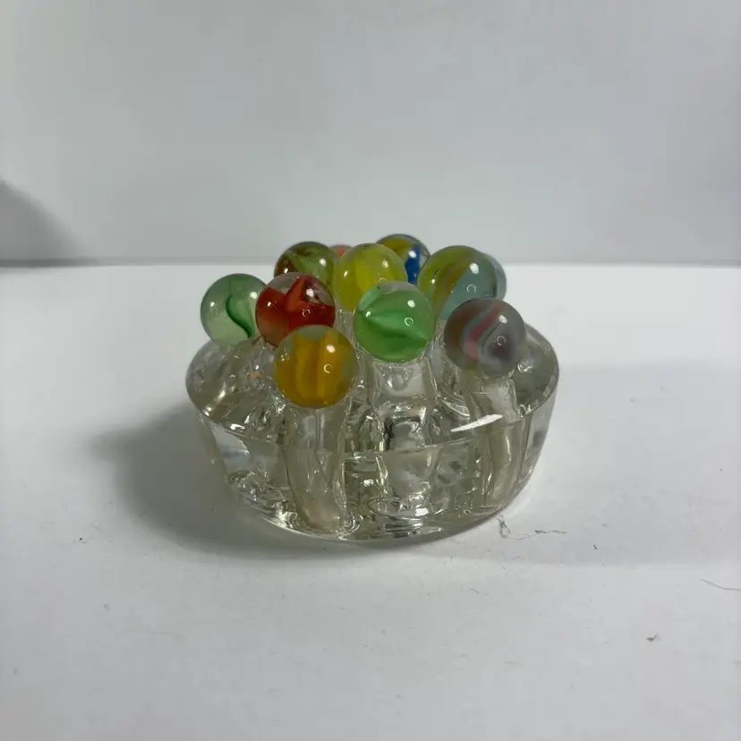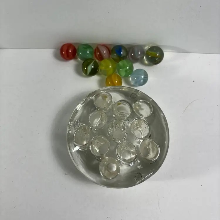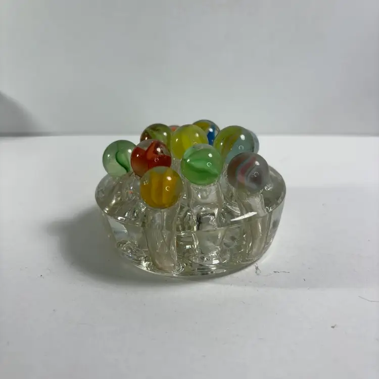Flower frog is 3.25” with 11 holes. In good condition with no chips or cracks. Some marbles glow under up light.