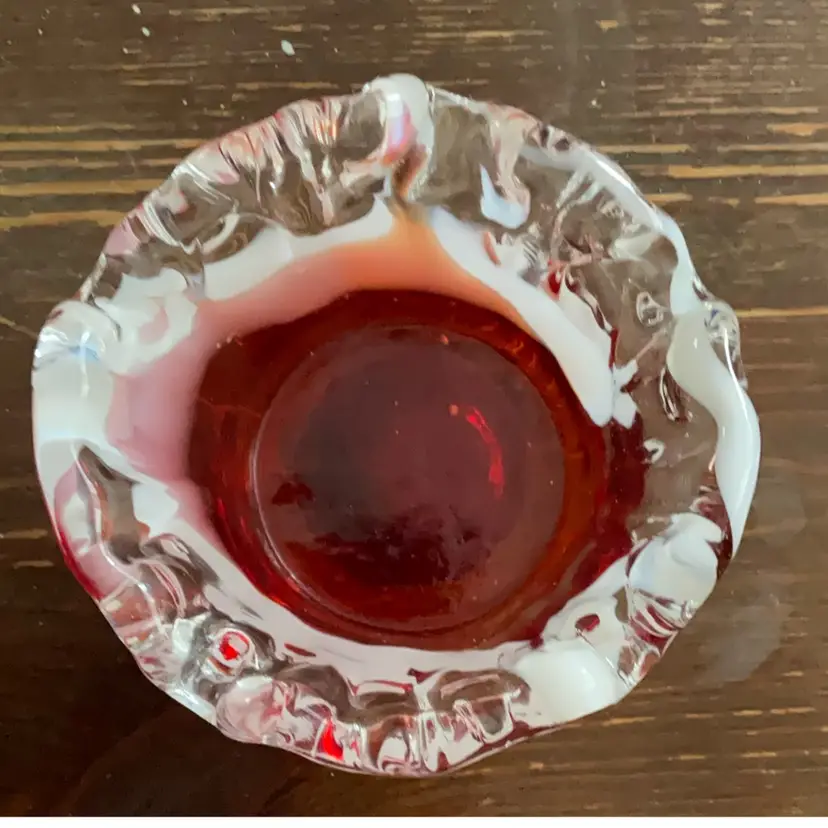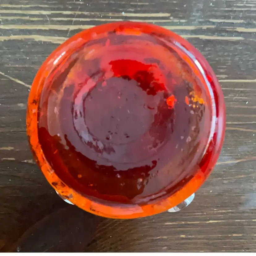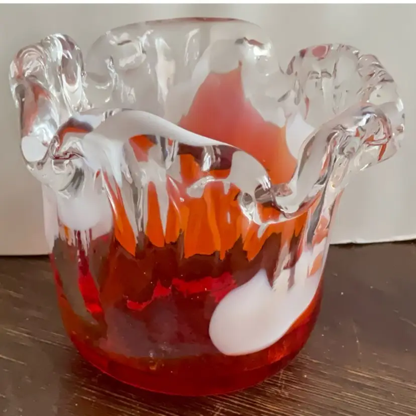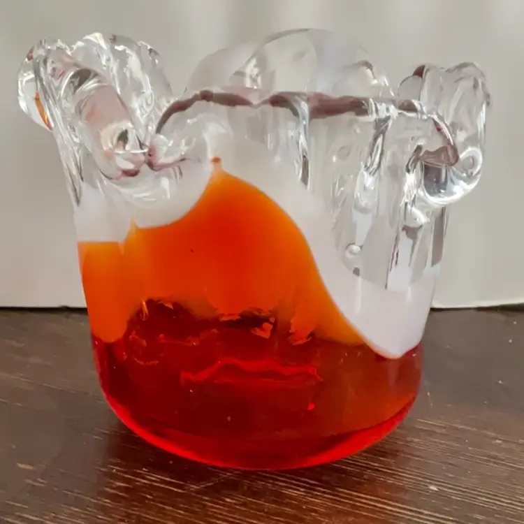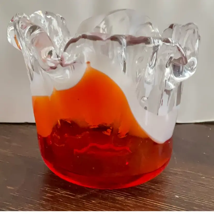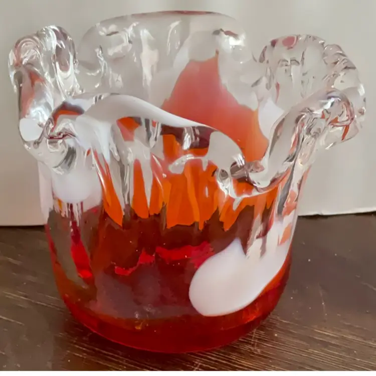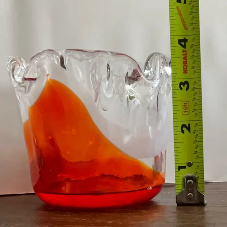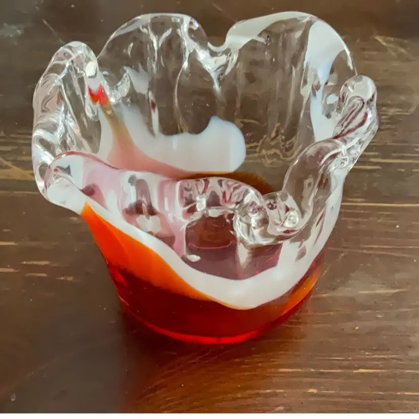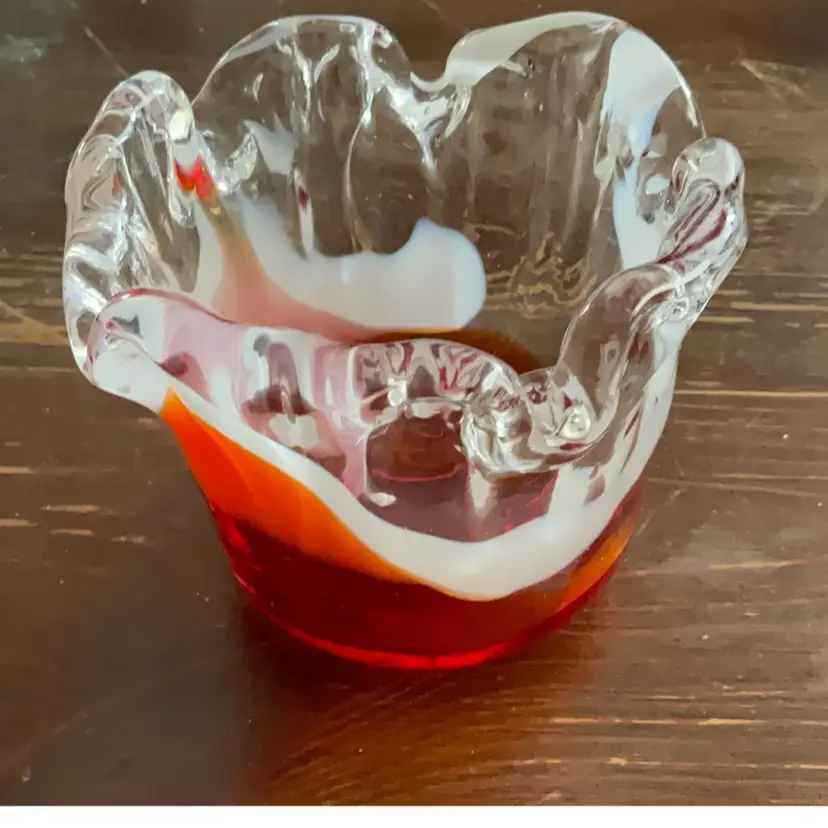 Approx 3.5” x 4.5” Beautiful glass!! Clear white orange red Has some bubbles which add to the charm of this piece in my opinion!
