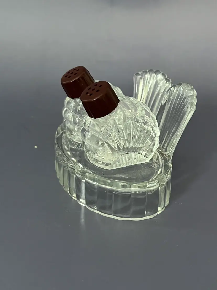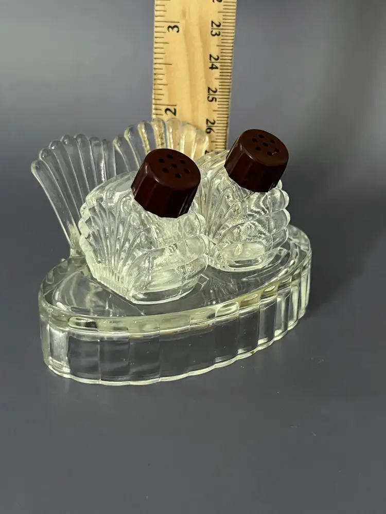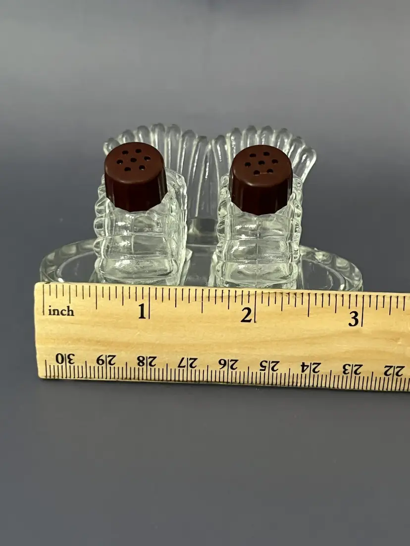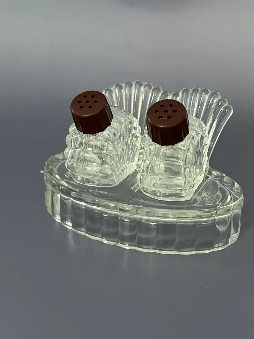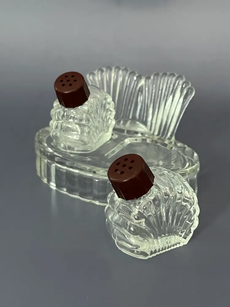 Vintage Hazel Atlas clear glass salt and pepper shakers with brown top feature a 3-piece set with tray.