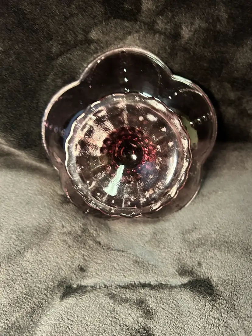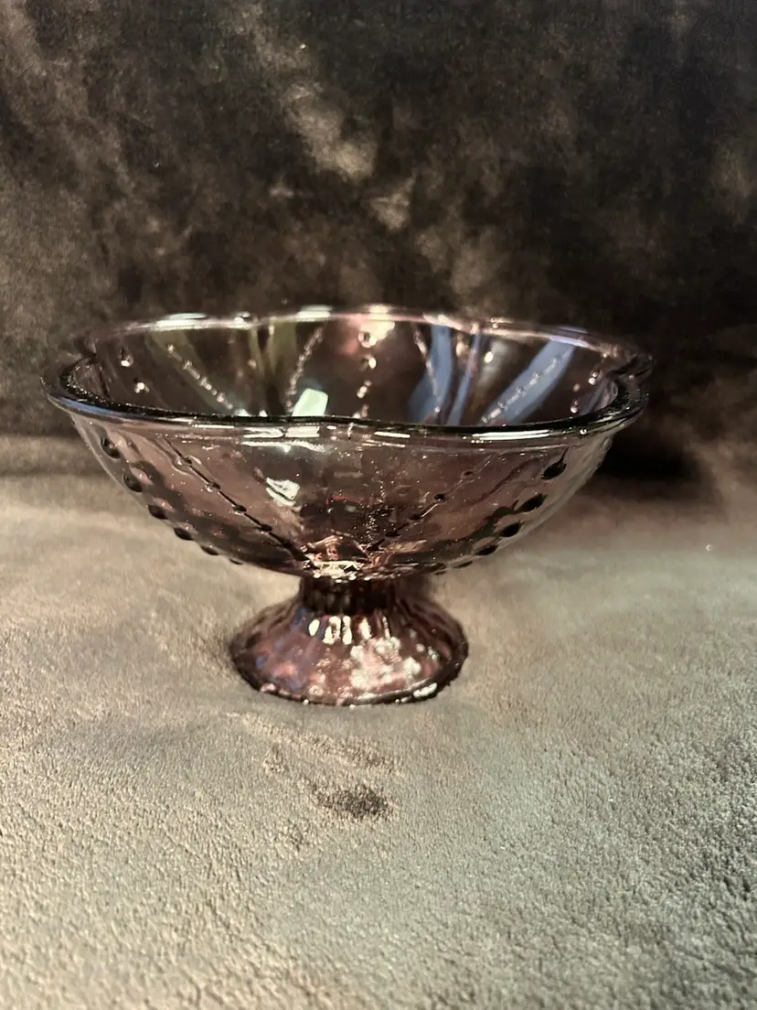 The top of the bowl features five flower-like petals, adding a touch of elegance to the piece. The bowl is made of high-quality glass and is perfect for use for dinner or as a decorative item. This Hobnail Retro look Amethyst Bowl is a must-have for anyone who loves vintage and retro style