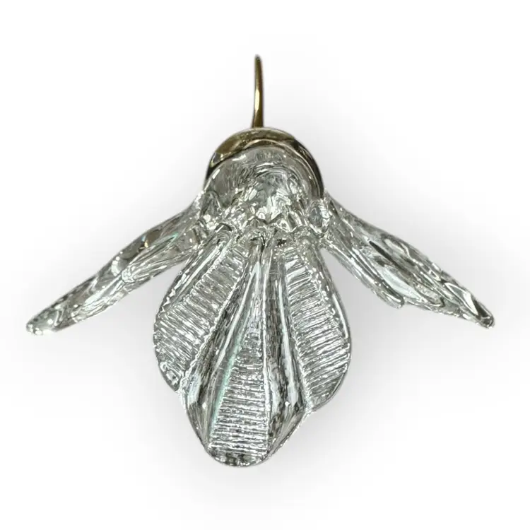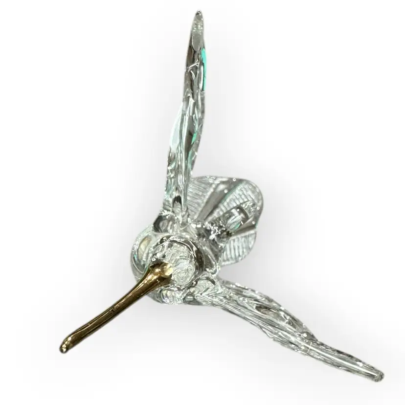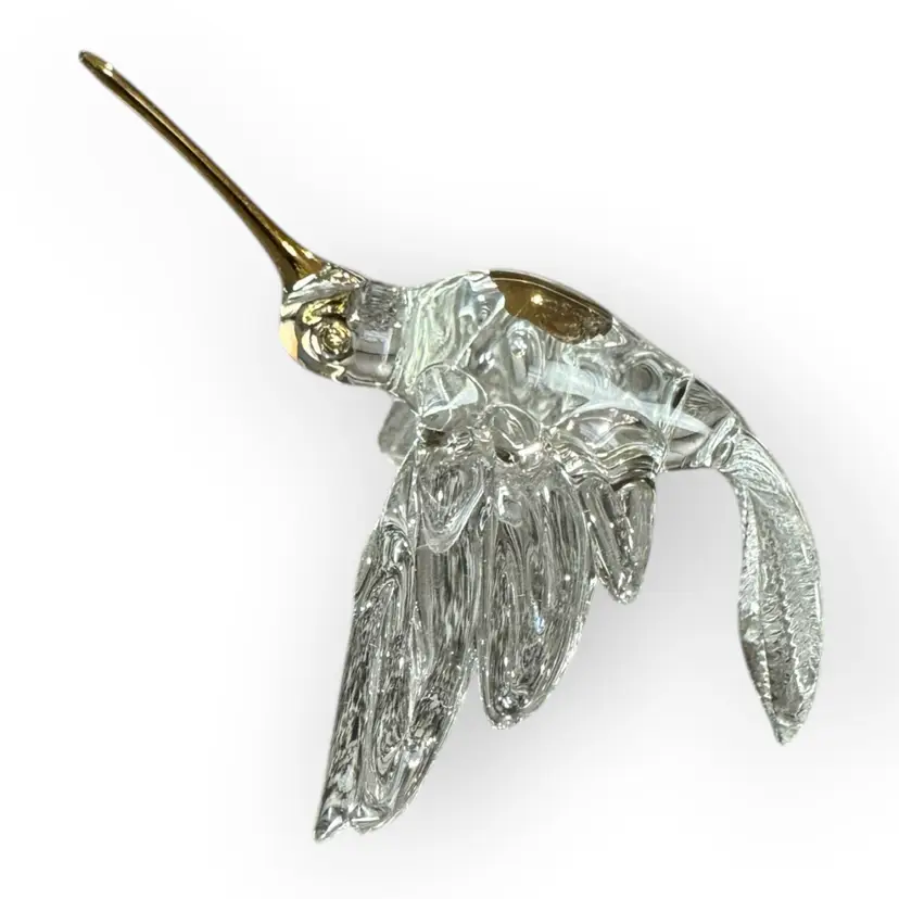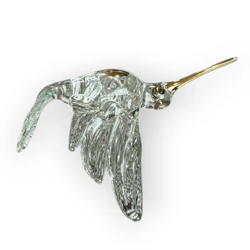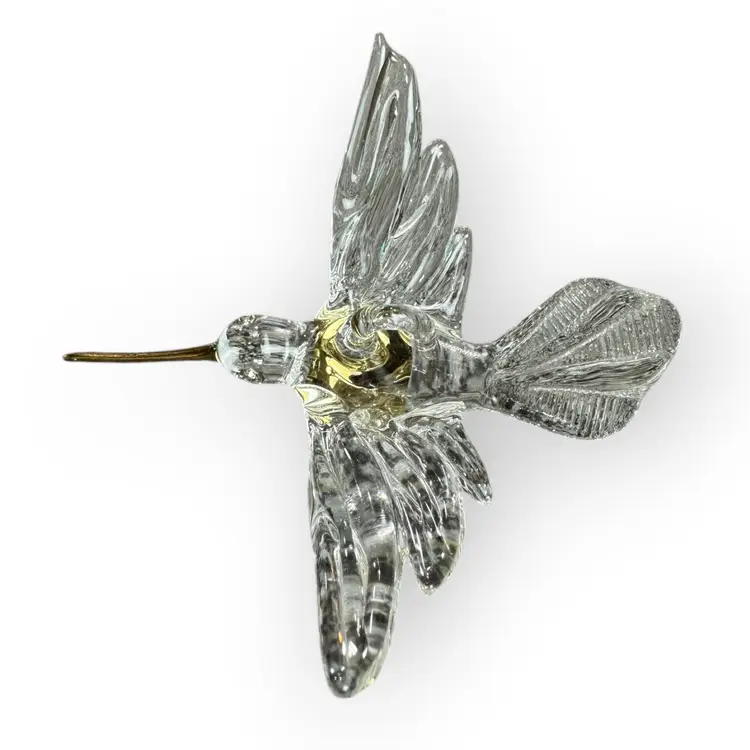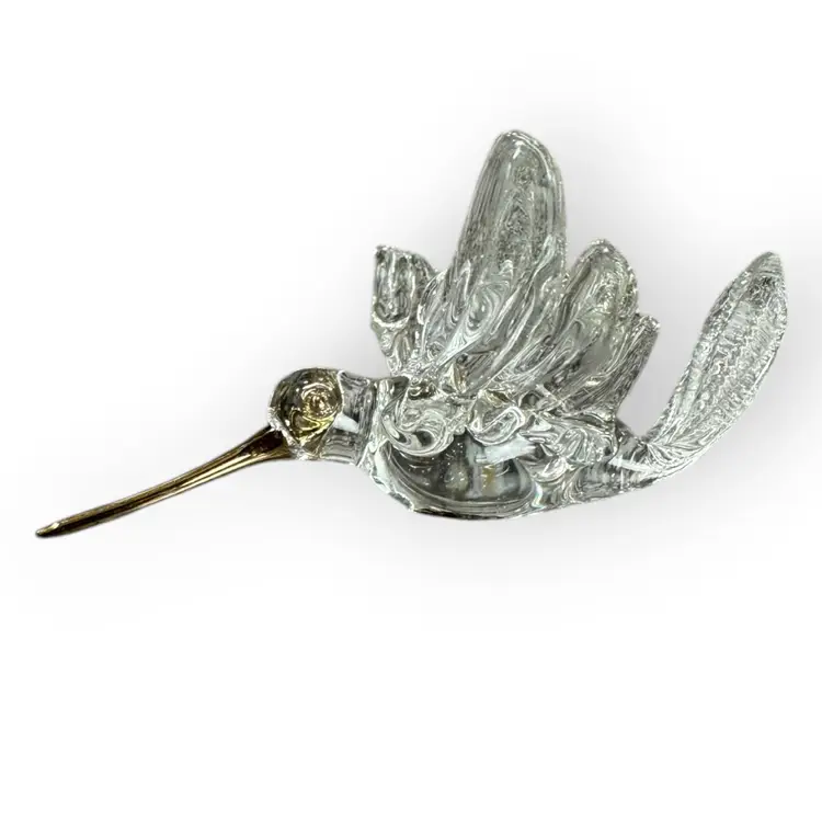 Beautiful and intricate glass hummingbird figurine with a gold-dipped beak, gold-rimmed eyes and a gold chest. There is also a glass loop on the bird’s back for hanging. In perfect condition. Measures 3” long from the top of the beak to the top of the tail. Wingspan measures 2.5” across.