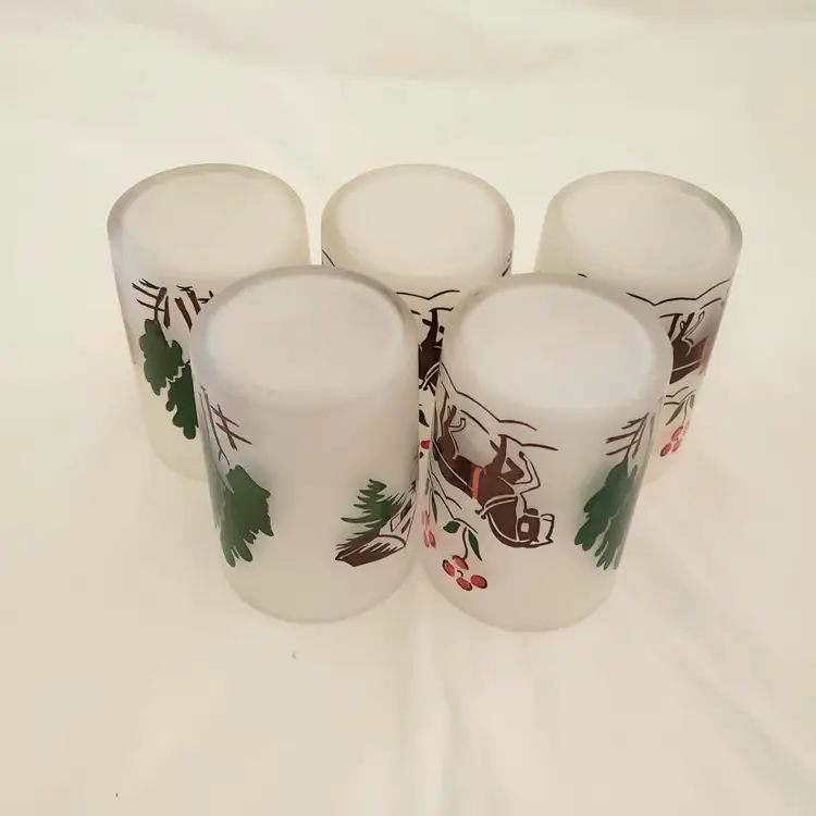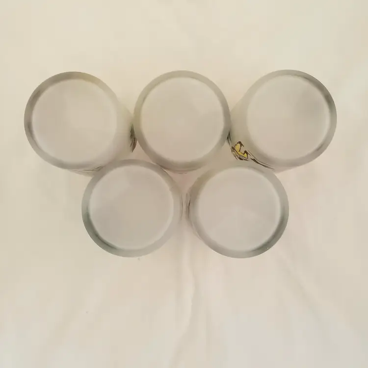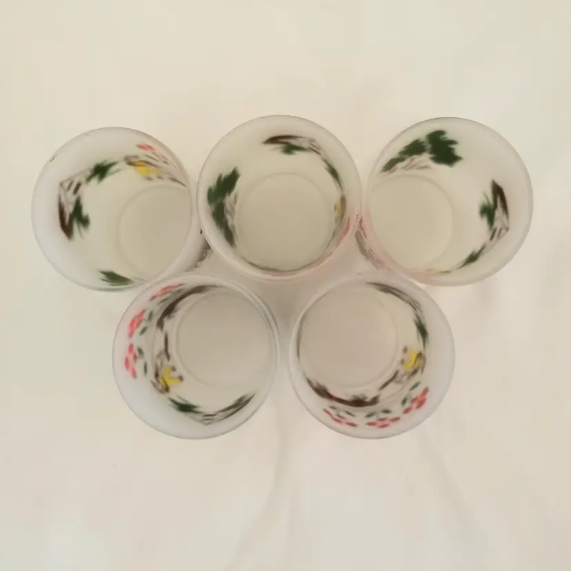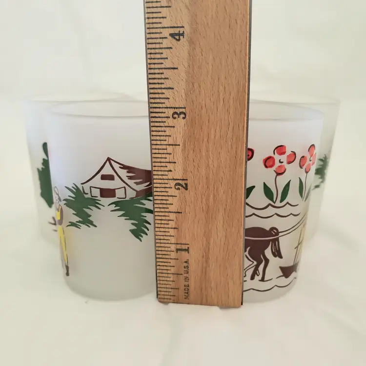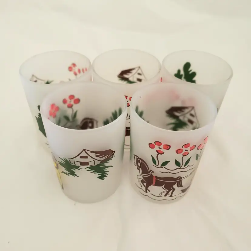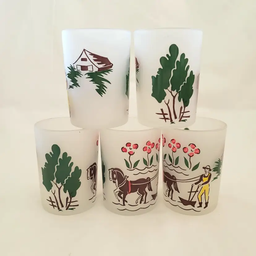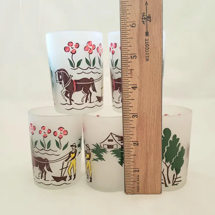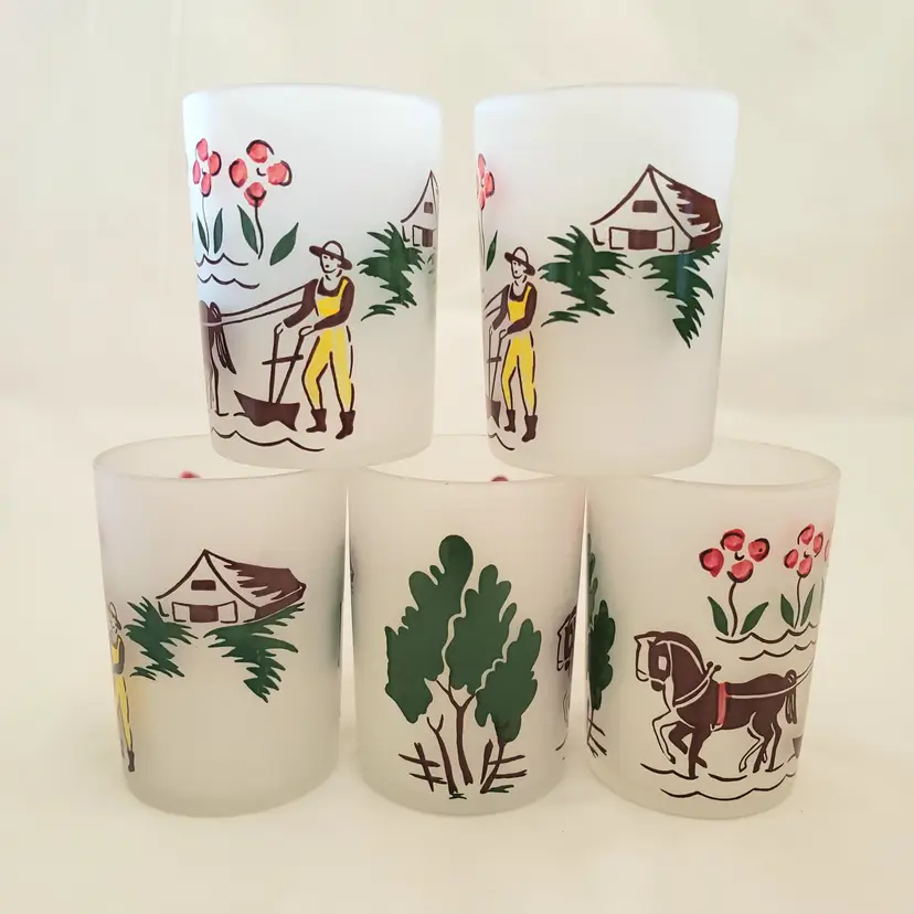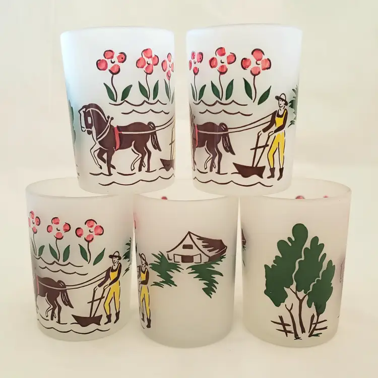 Glass Juice Illustrated Farm Theme 5 Small Glass Cups 2⅞" Tall Unbranded. Used condition with spots of missing color, dirt, manufacturer flaws. Please view all the photos and read the entire item description and please ask any questions prior to purchase when possible.