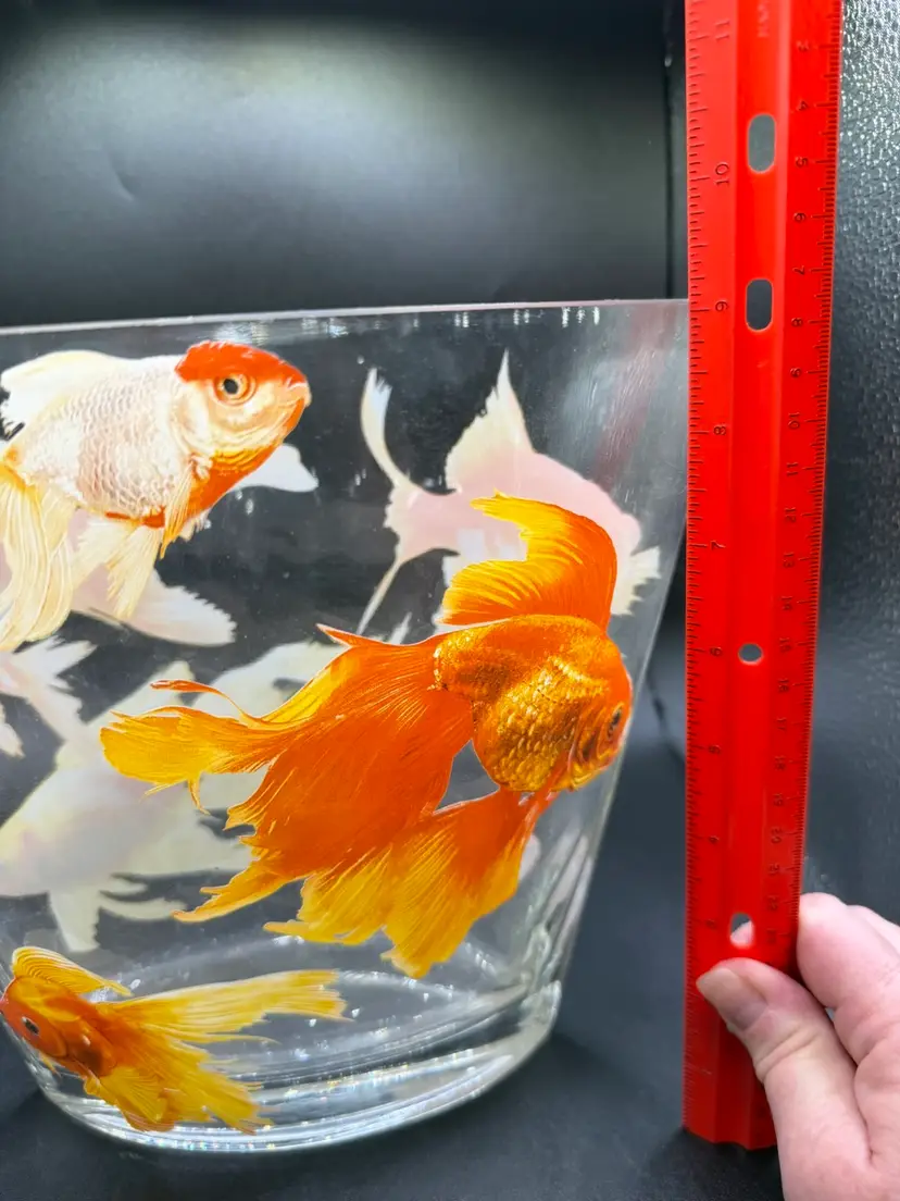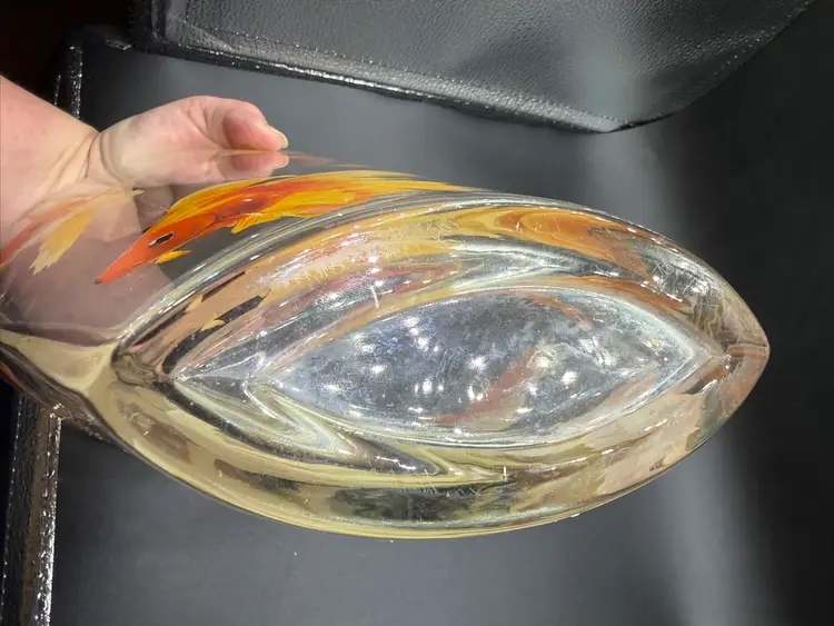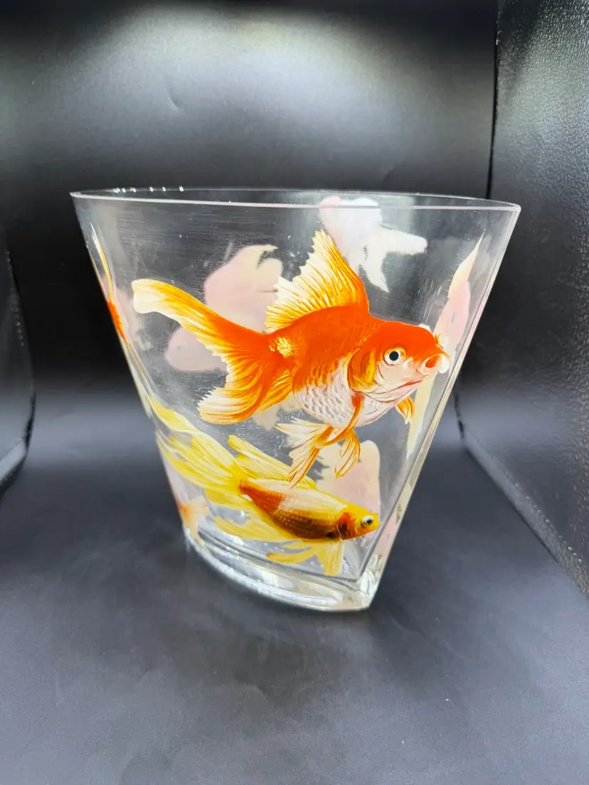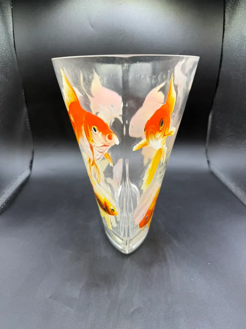 This Glass Koi Goldfish Oval Vase is a stunning piece of pop art, standing at 9 inches tall. The clear glass vase features an all-over pattern of fish, specifically koi goldfish, making it a perfect decorative item for any fish-themed space. The glossy finish and hand-blown production style add to the artistic flair of the piece, while its heavy weight of approximately 5 pounds ensures durability and stability. Whether placed on a table or shelf, this unique vase is sure to make a statement in any home decor setting.
