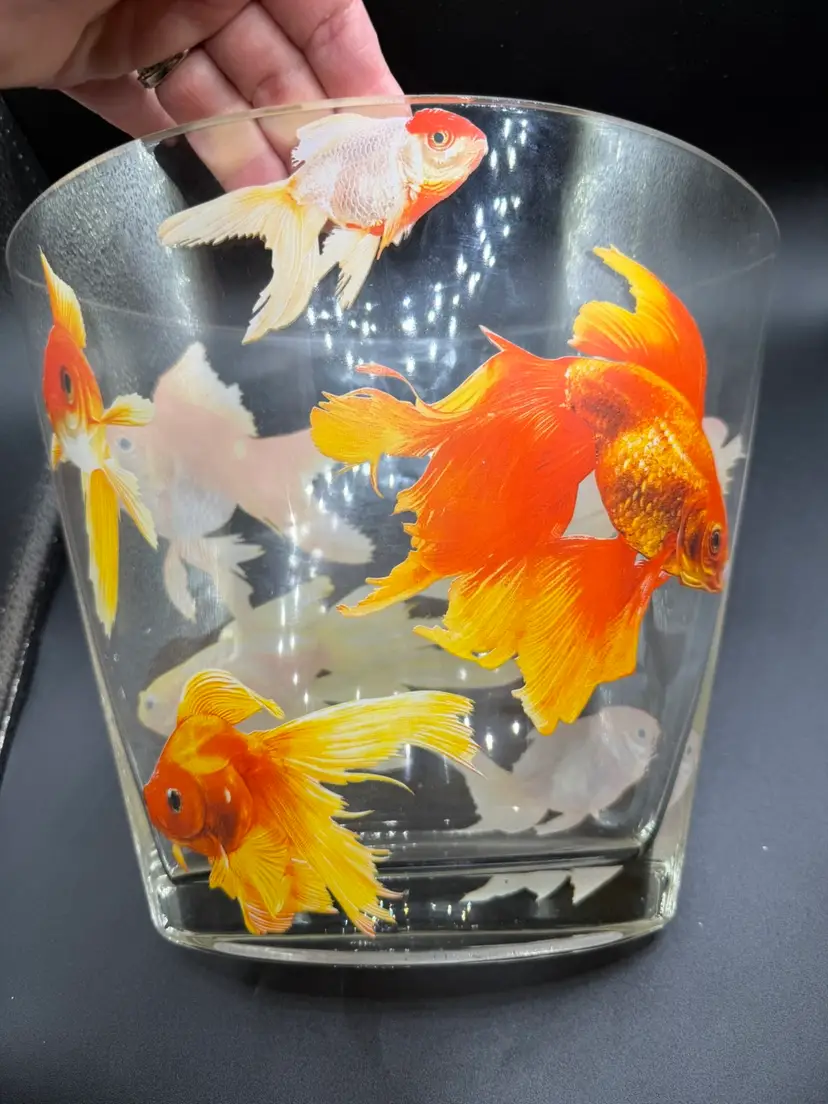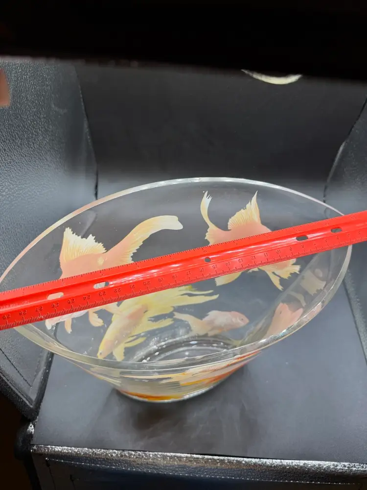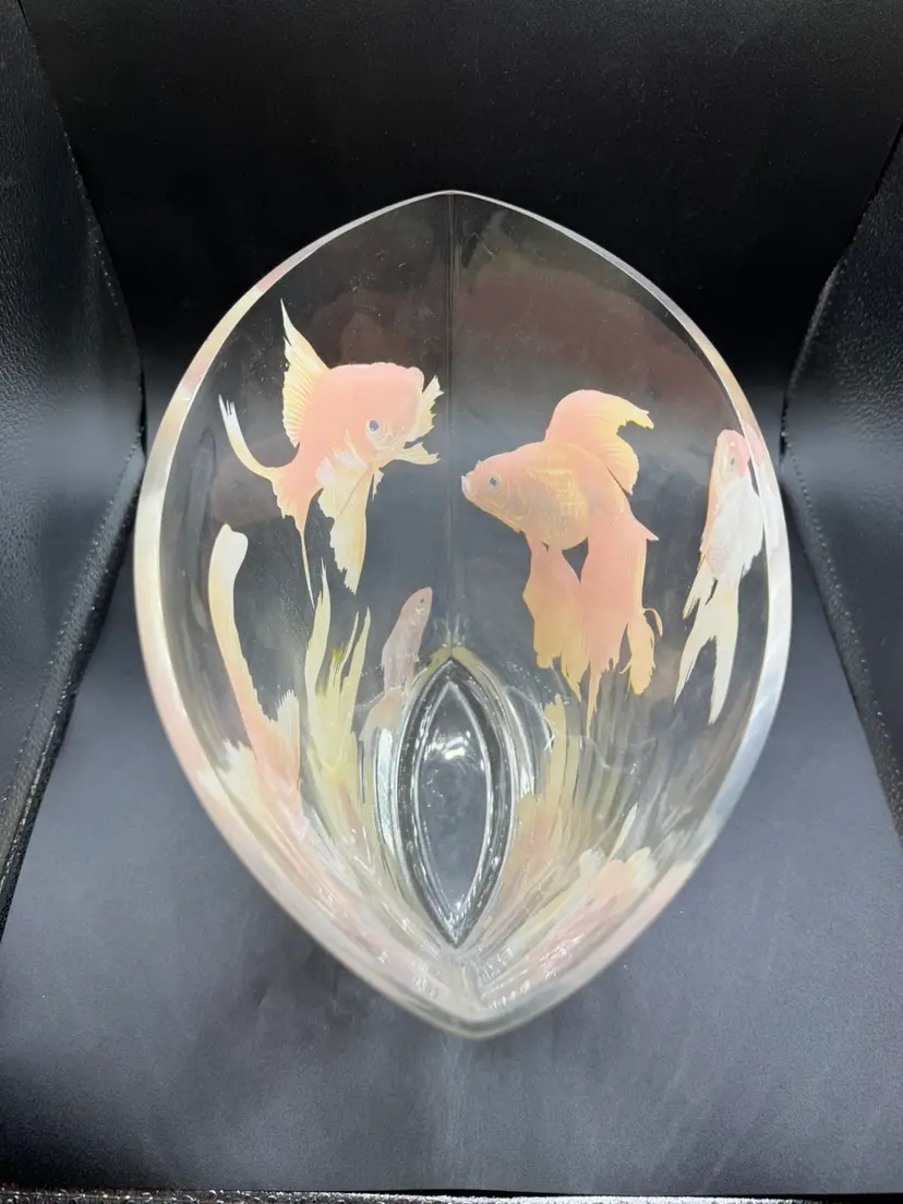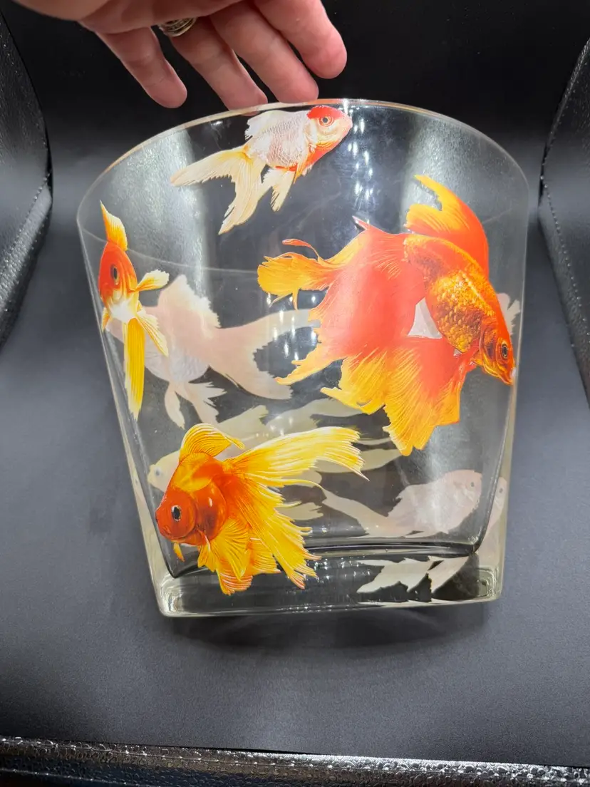 This Glass Koi Goldfish Oval Vase is a stunning piece of pop art, standing at 9 inches tall. The clear glass vase features an all-over pattern of fish, specifically koi goldfish, making it a perfect decorative item for any fish-themed space. The glossy finish and hand-blown production style add to the artistic flair of the piece, while its heavy weight of approximately 5 pounds ensures durability and stability. Whether placed on a table or shelf, this unique vase is sure to make a statement in any home decor setting.