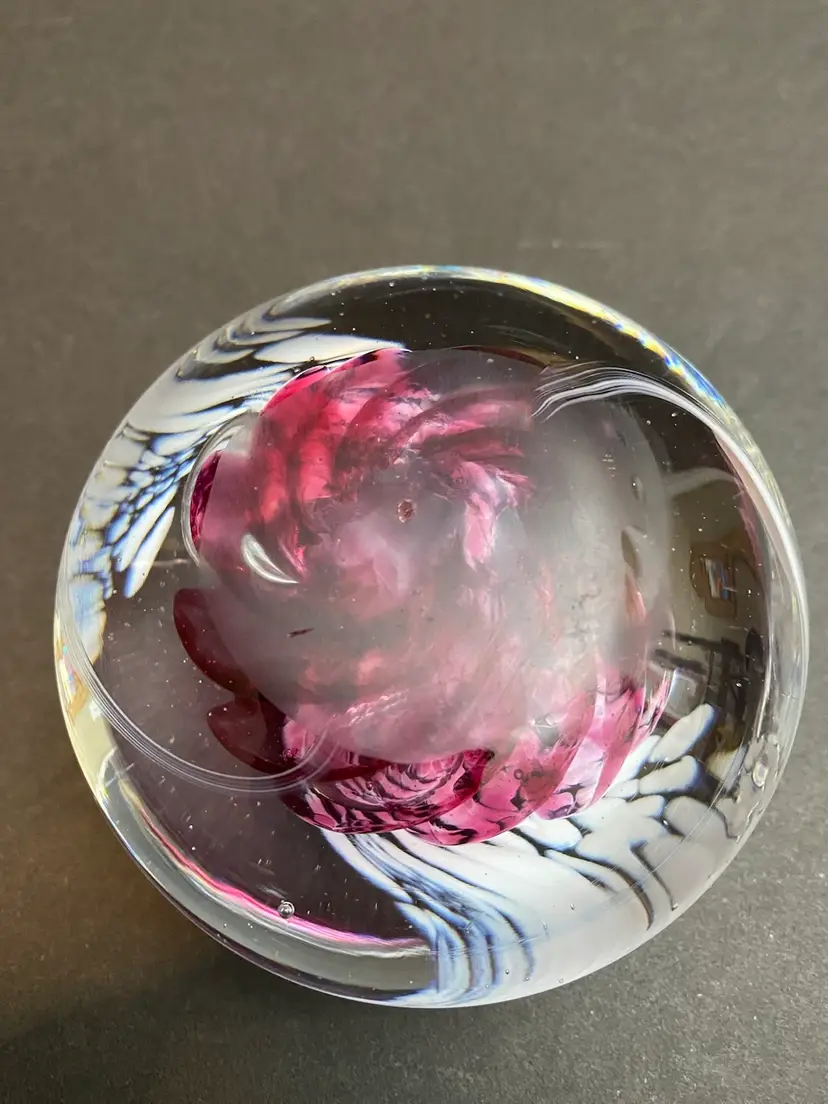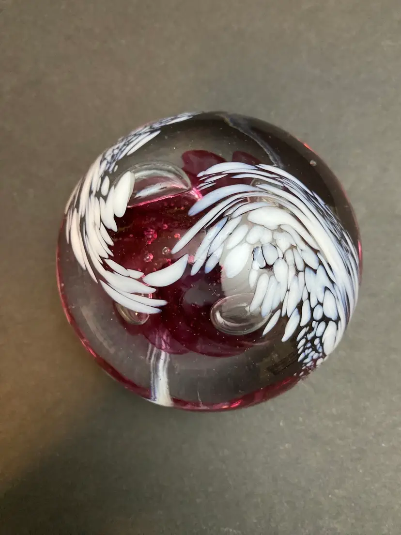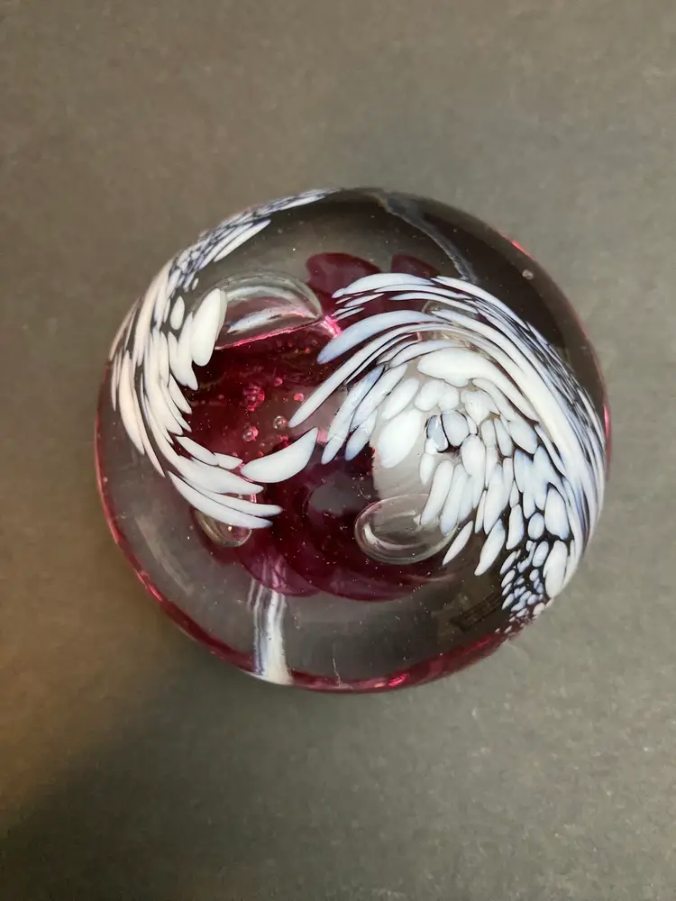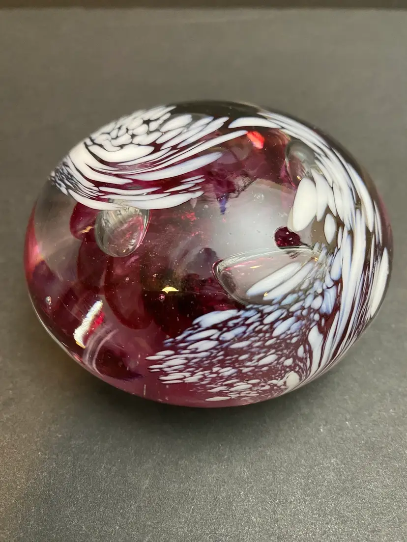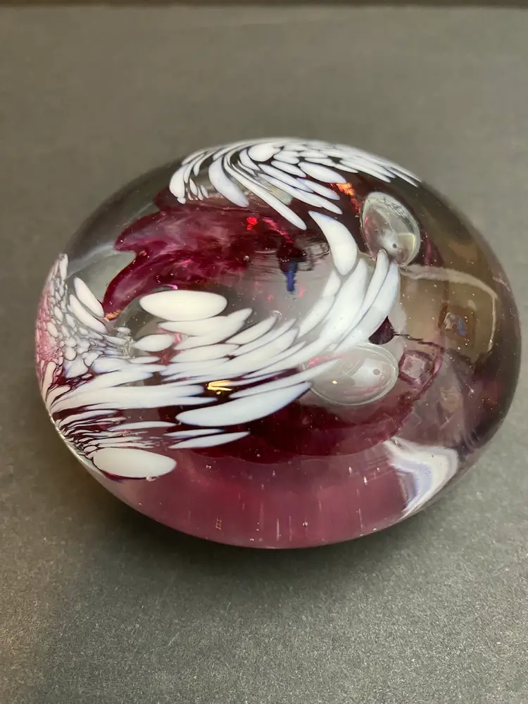 Glass Paperweight Red Magenta Floral Shape Inside W/ Painted White Design Outside. 3.5” wide and 1.5” tall. See pictures.