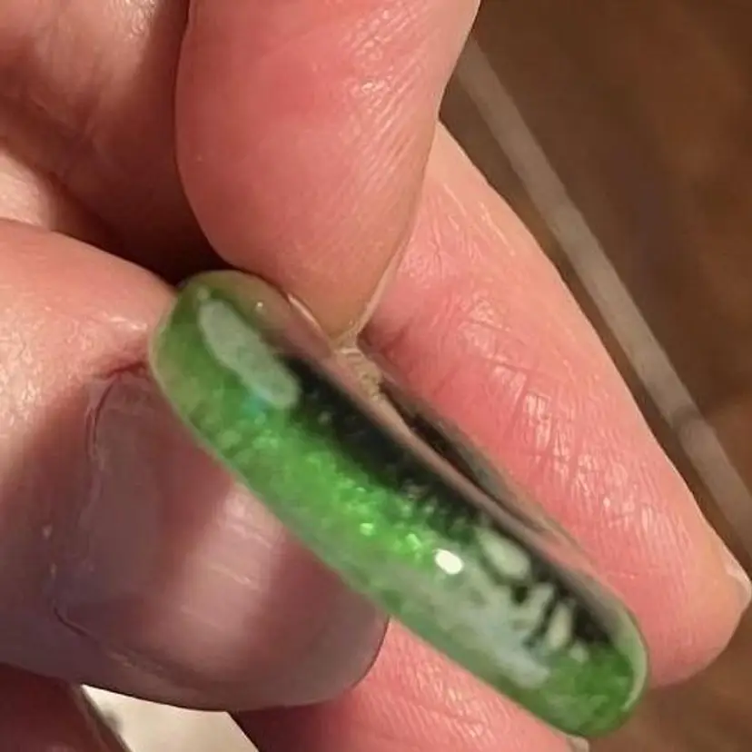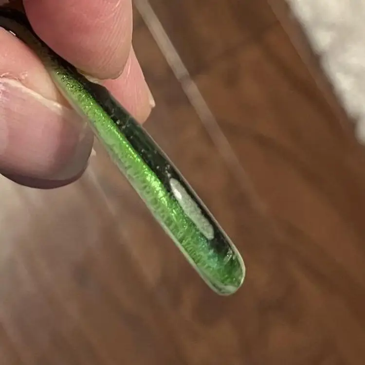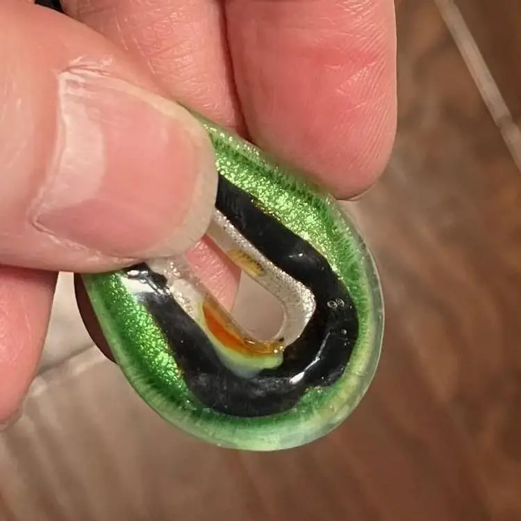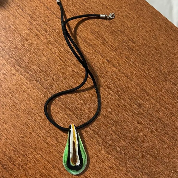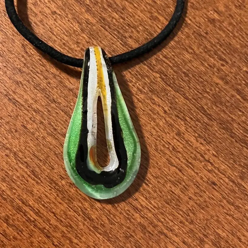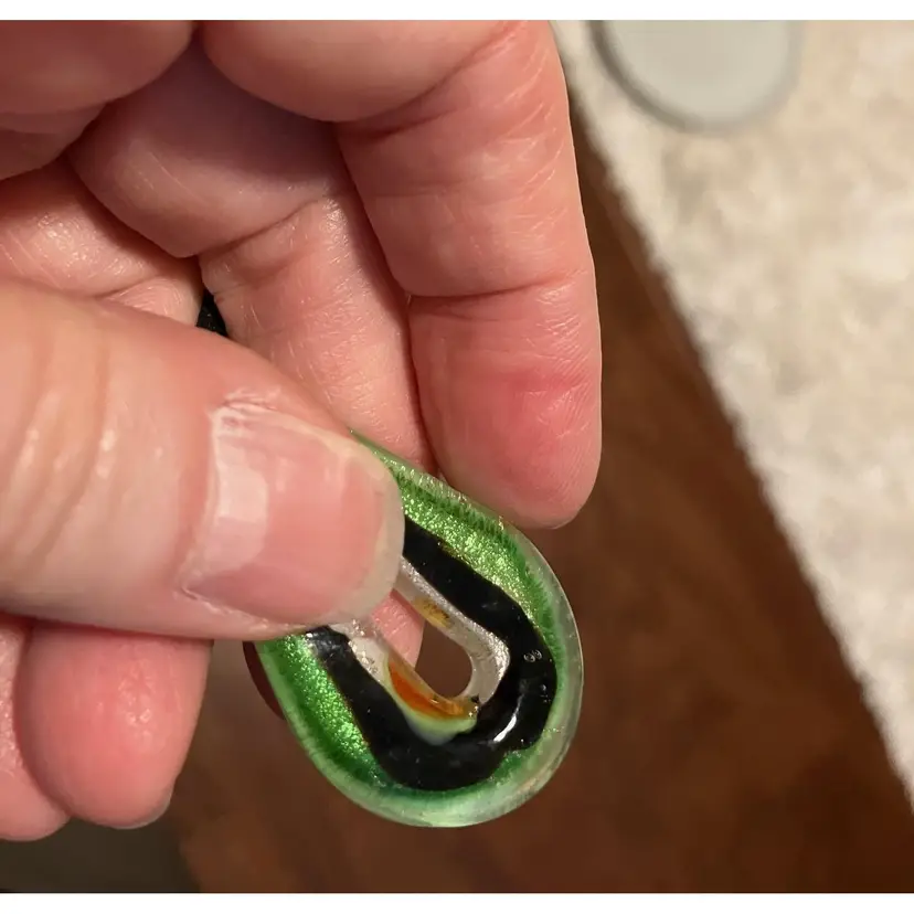 Cord/Chain is smooth and flexible. The Glass pendant is almost 2 inches in length and 1 inch wide. There are some white areas in the pendant (see photos) that I never knew were there. The glass is smooth with no defects so I don't know if the white area was there from the start. A couple of small closed bubbles - no roughness to the glass. I think I never saw it because it cannot be seen when worn. It is a beautiful pendant.