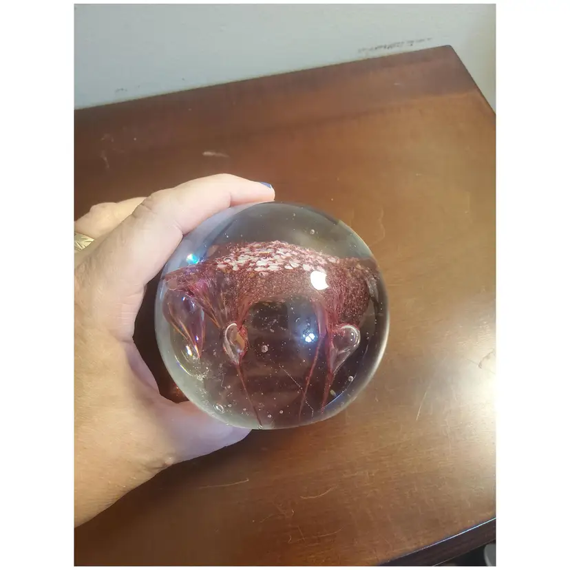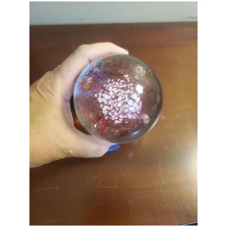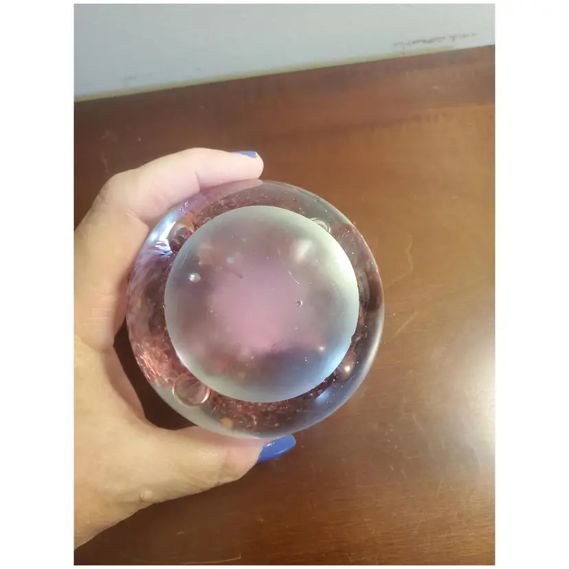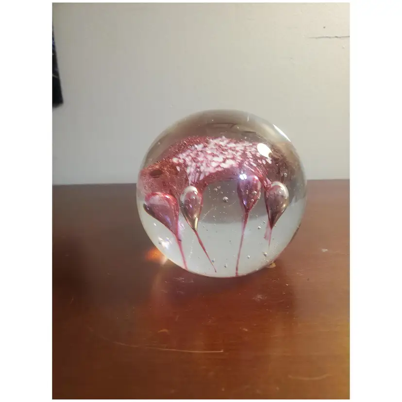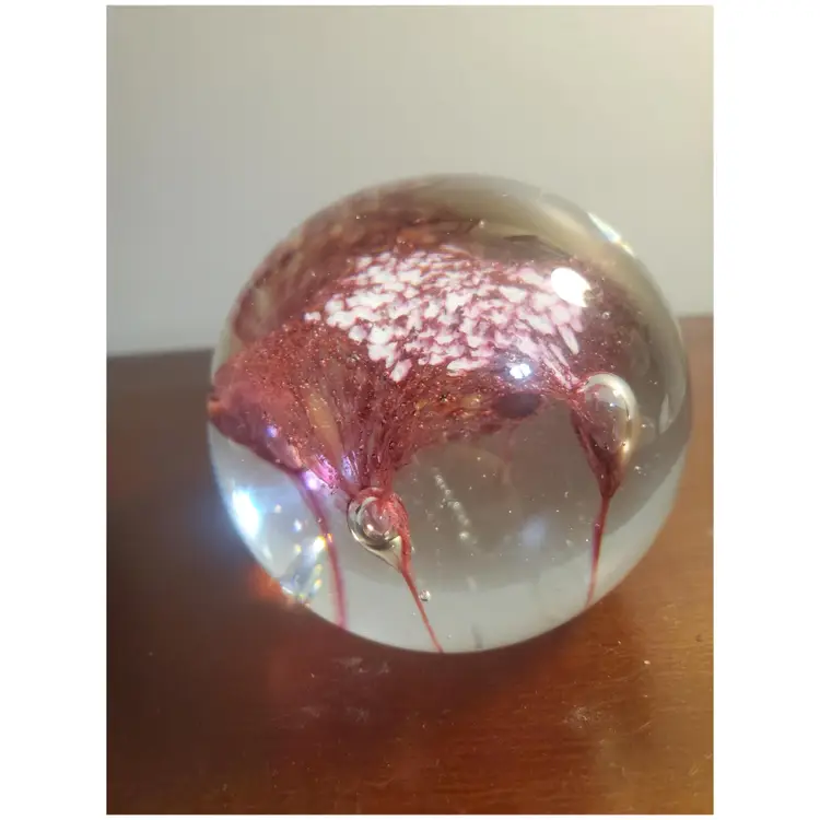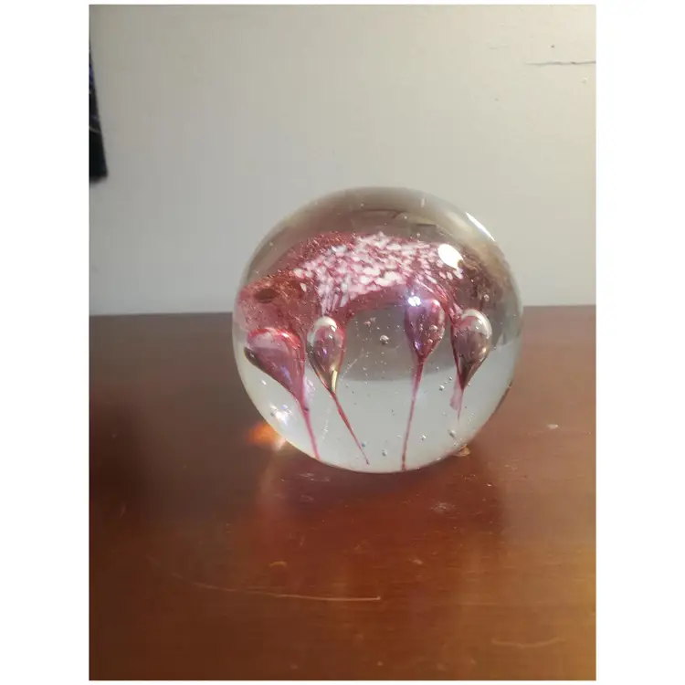 Glass Pink and White Paperweight Gently preowned 3 inches wide x 4 inches tall Unsigned Looks like a flower or some sort of fliral like design Very heavy