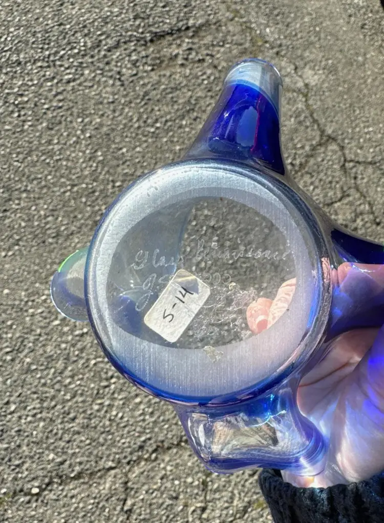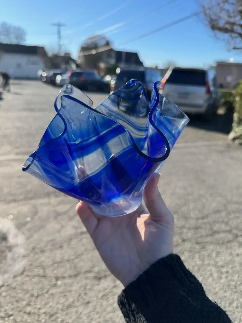Glass Renaissance handkerchief dish signed by JS cobalt swirl no chips or cracks