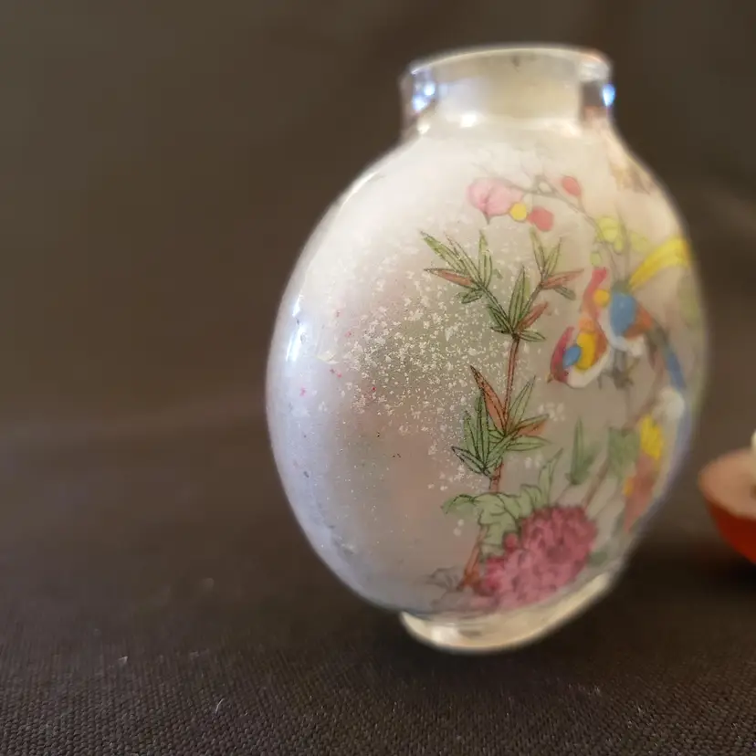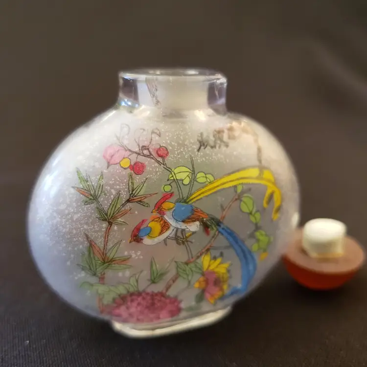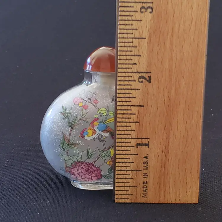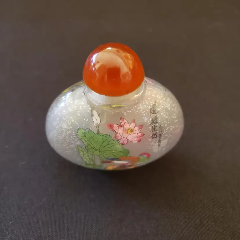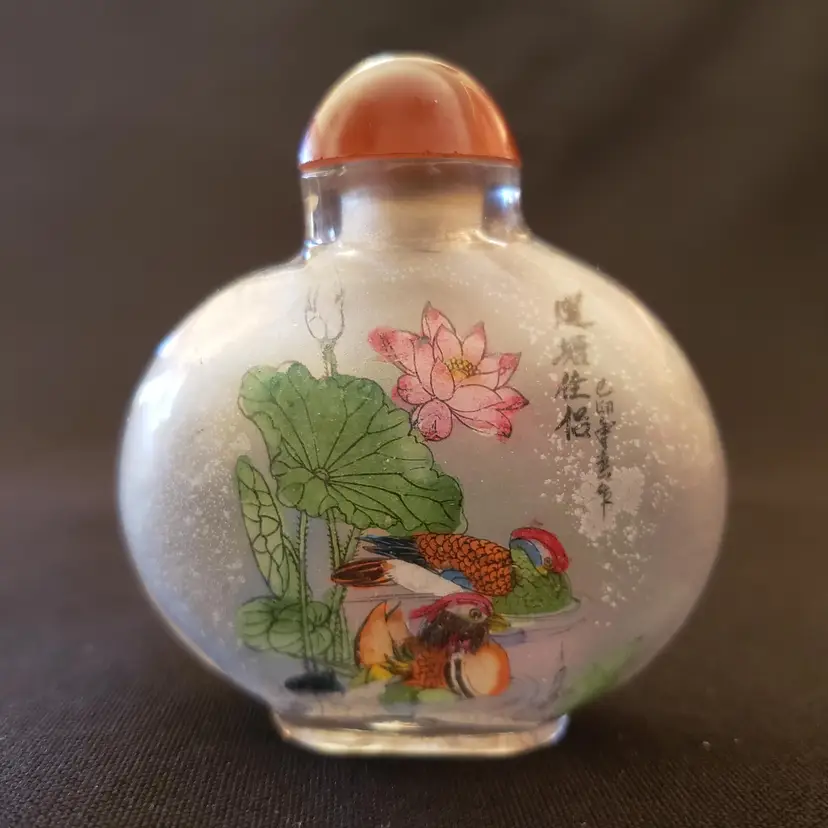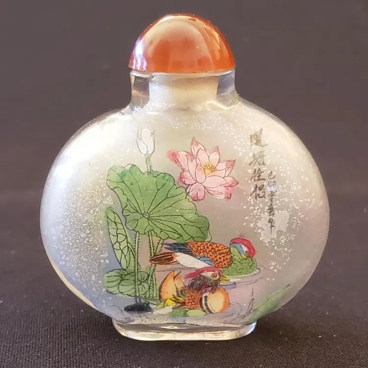 Glass Snuff Bottle Chinese Reverse Painted Scene with Lid 2⅜" Ducks, Birds, Lotus Flowers. Used condition with fleabites to glass, chips & cracks to mouth of bottle, nicks, scratches, water stains, fingerprints, to bottle and dirt, tarnish to lid. Please view all photos as they are part of the description and please ask questions prior to purchase if possible.