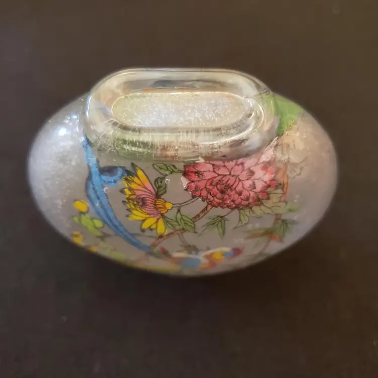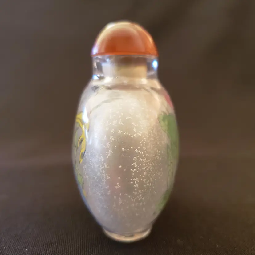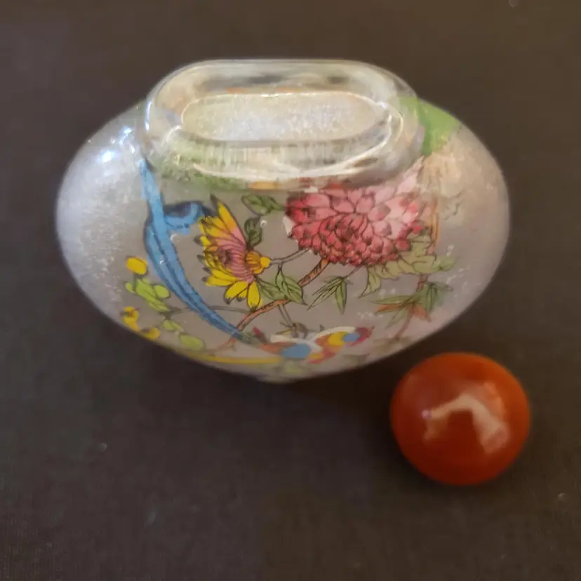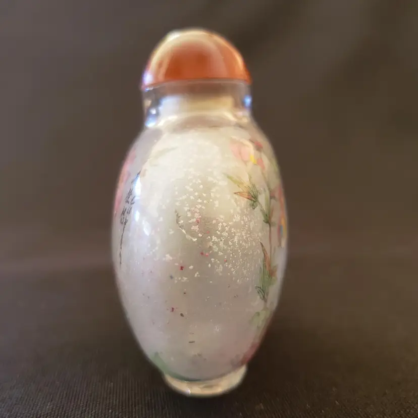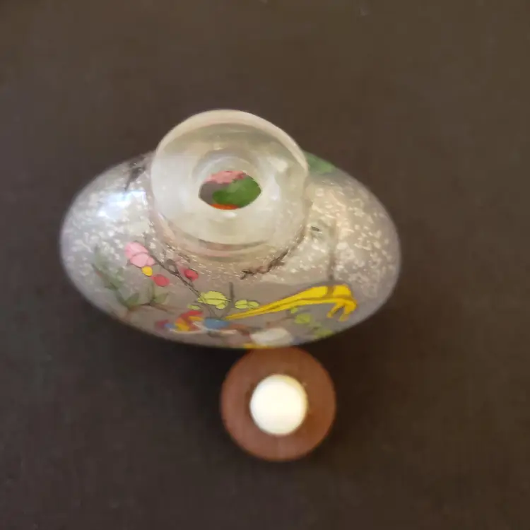 Glass Snuff Bottle Chinese Reverse Painted Scene with Lid 2⅜" Ducks, Birds, Lotus Flowers. Used condition with fleabites to glass, chips & cracks to mouth of bottle, nicks, scratches, water stains, fingerprints, to bottle and dirt, tarnish to lid. Please view all photos as they are part of the description and please ask questions prior to purchase if possible.
