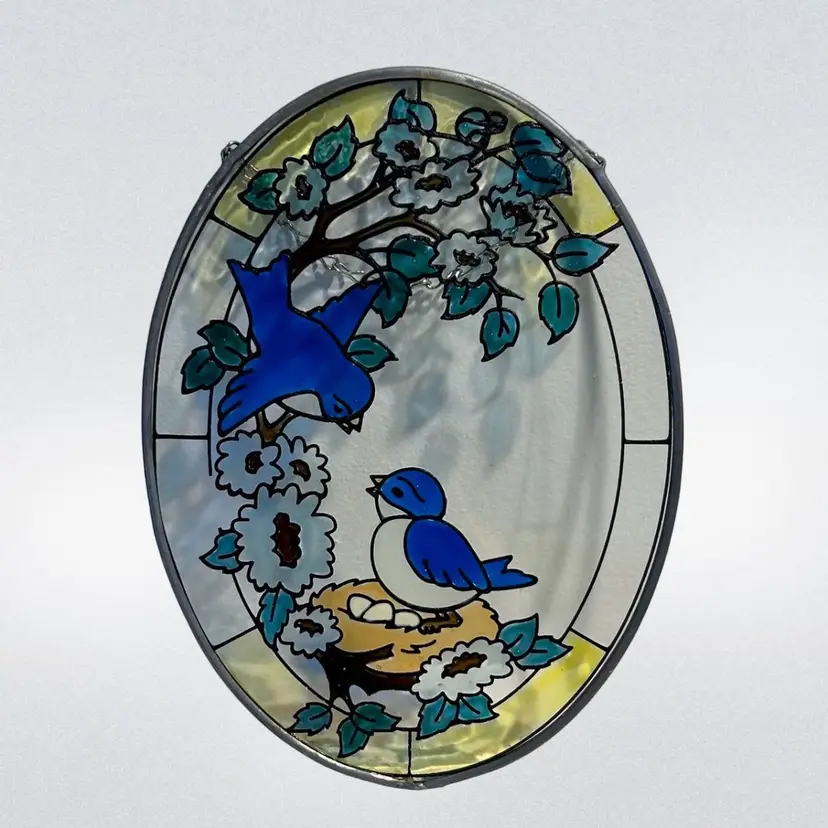 Oval painted glass sun catcher featuring a lovely design of sweet blue birds on a nest amidst flowers and leaves.