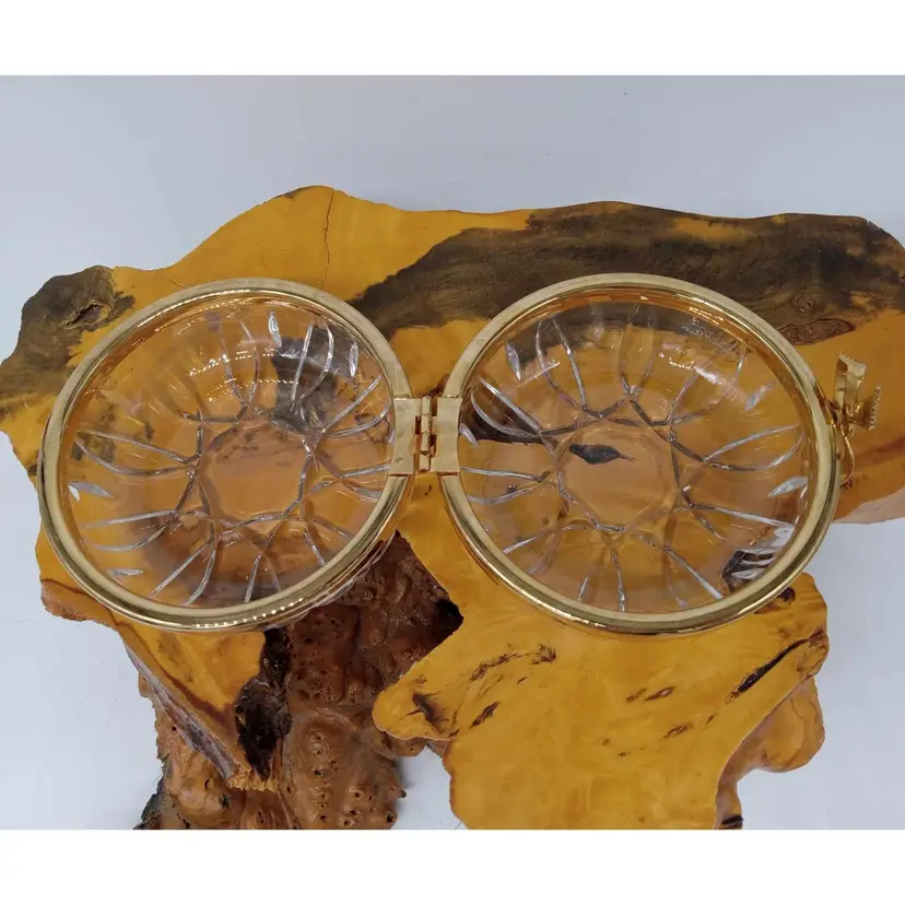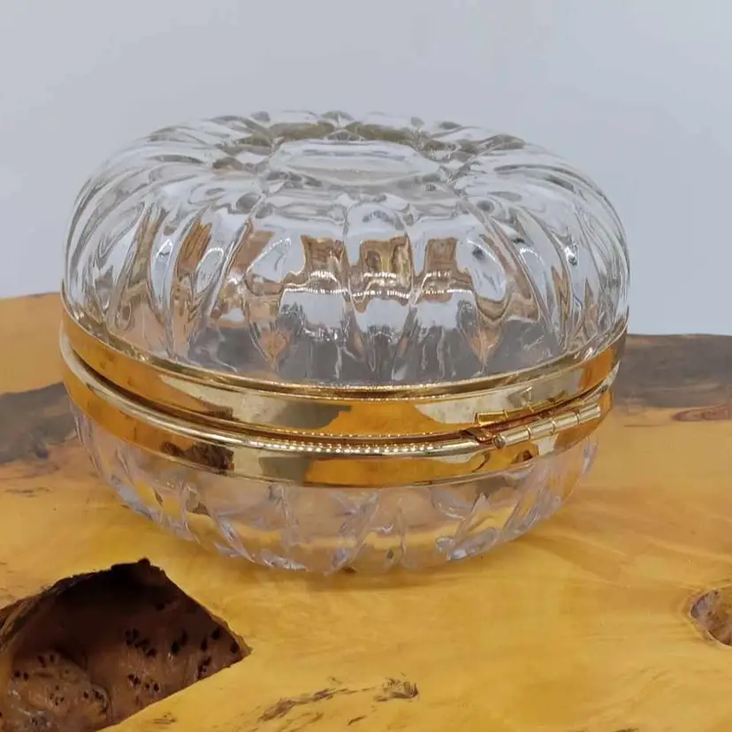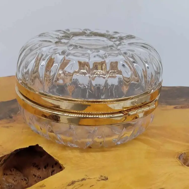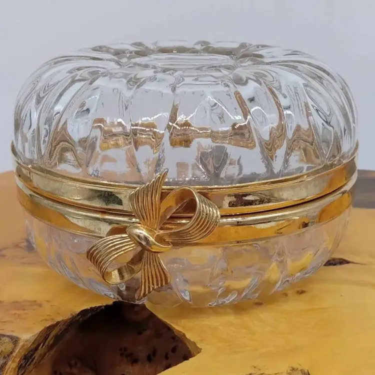 Here's a pretty glass box with a gold bow. It's 3 inches tall and 4.5 inches in diameter. There are no chips or cracks.
