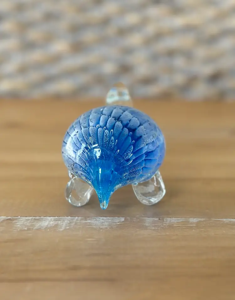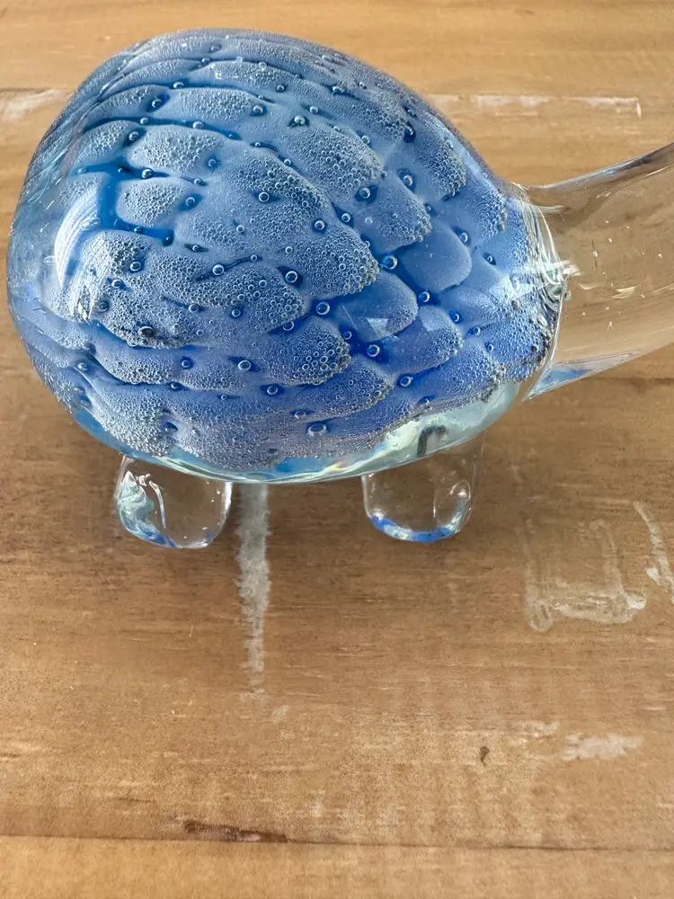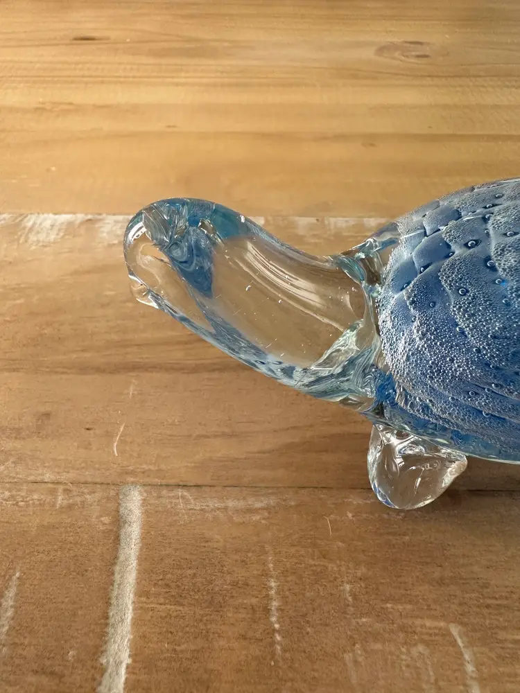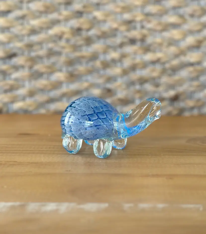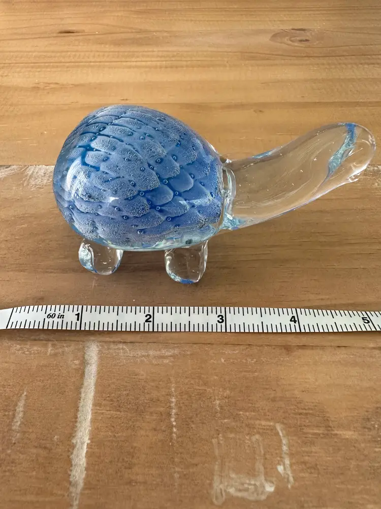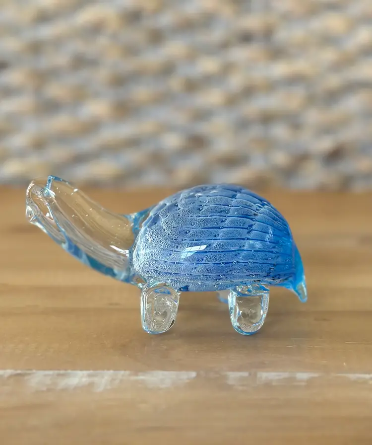 This glass turtle figurine paperweight is a stunning collectible piece with a blue and clear design, measuring approximately 4.75" long. Made from high-quality glass, this figurine is a unique and elegant addition to any collection. The intricate details and vibrant colors make it a standout piece, perfect for animal lovers and collectors alike. Whether used as a paperweight or displayed as a decorative accent, this glass turtle figurine is sure to be a conversation starter in any space.