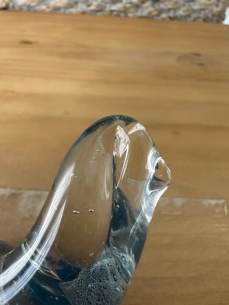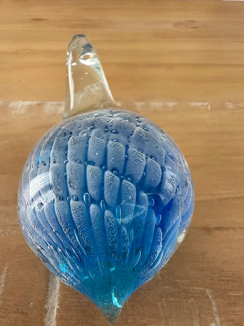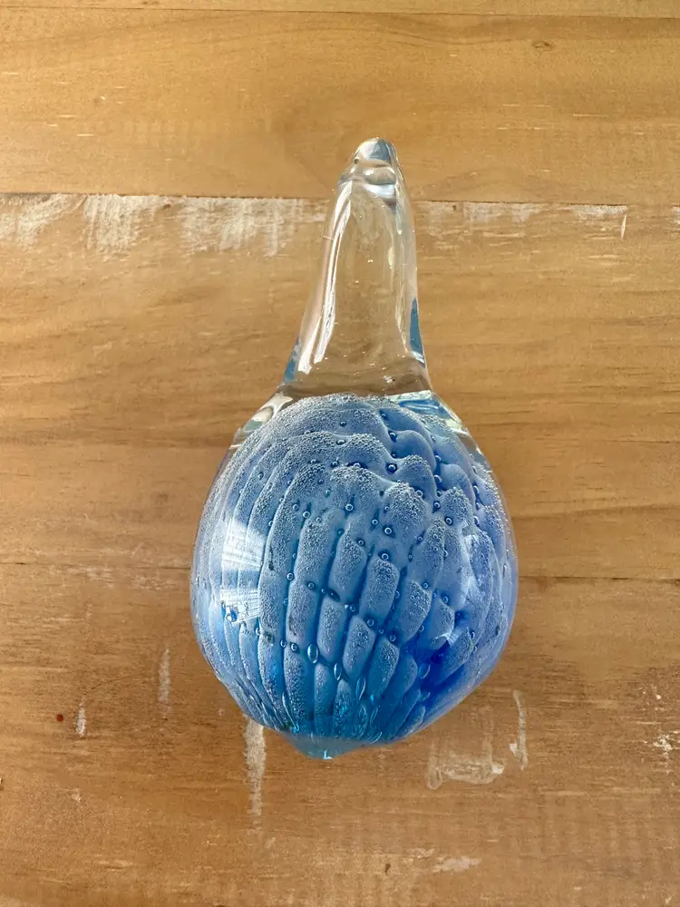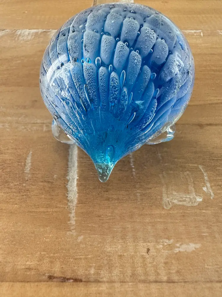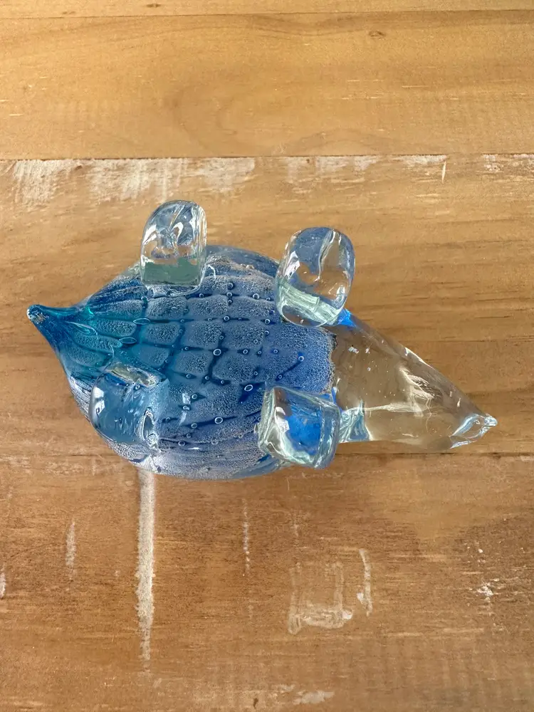 This glass turtle figurine paperweight is a stunning collectible piece with a blue and clear design, measuring approximately 4.75" long. Made from high-quality glass, this figurine is a unique and elegant addition to any collection. The intricate details and vibrant colors make it a standout piece, perfect for animal lovers and collectors alike. Whether used as a paperweight or displayed as a decorative accent, this glass turtle figurine is sure to be a conversation starter in any space.