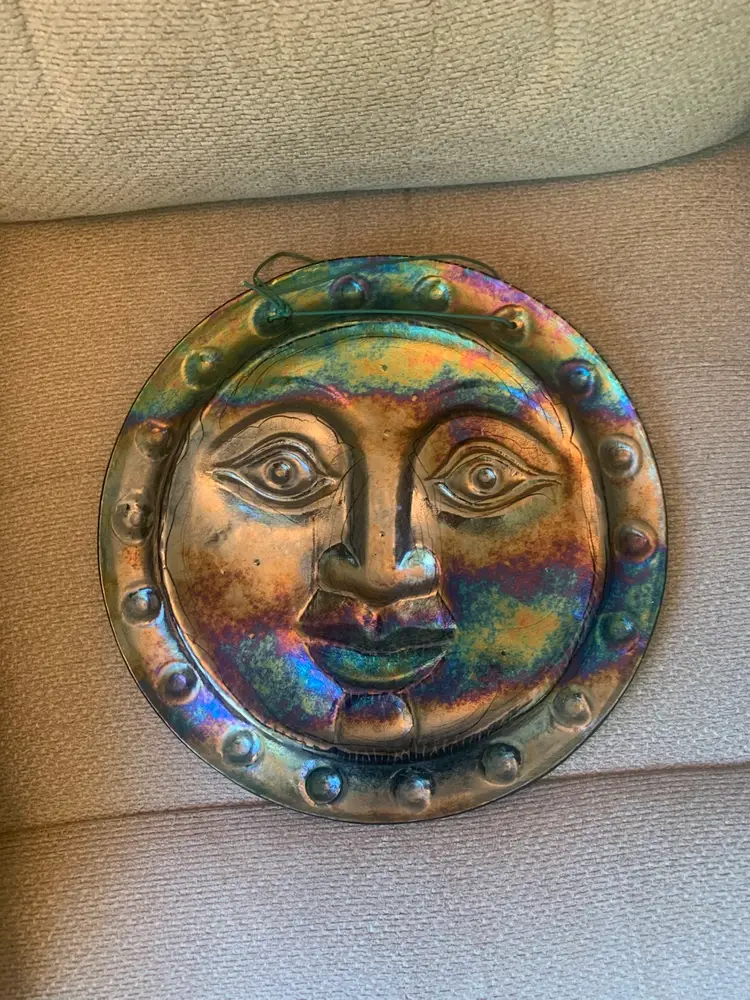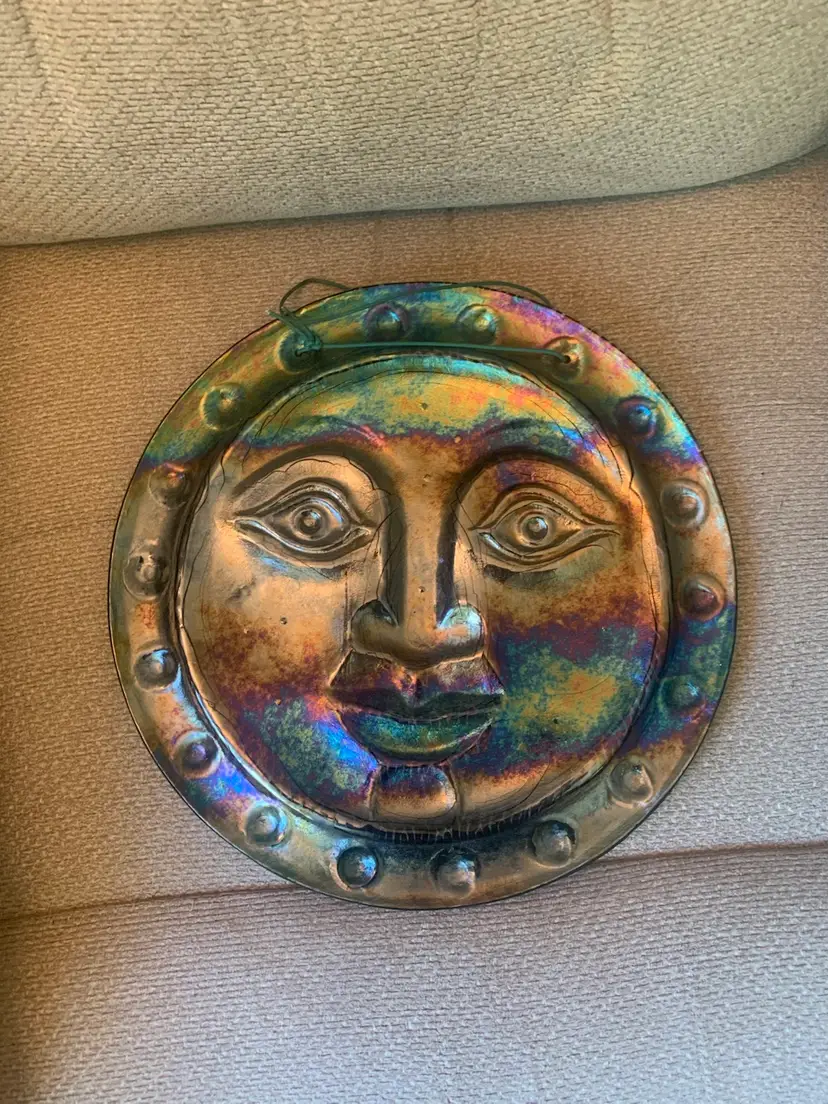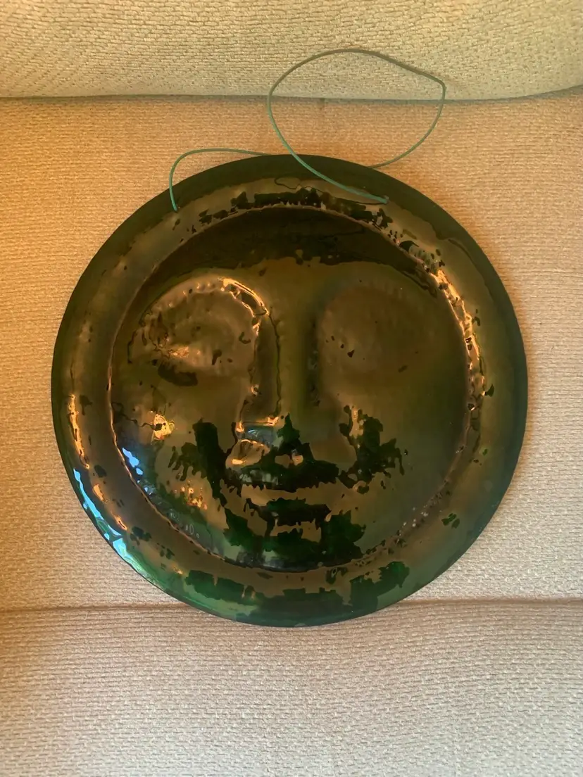 No chips or cracks. Unmarked. Made of glass, carnival glass on the front and green on back. 11 inches