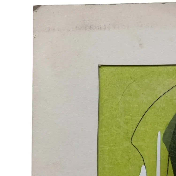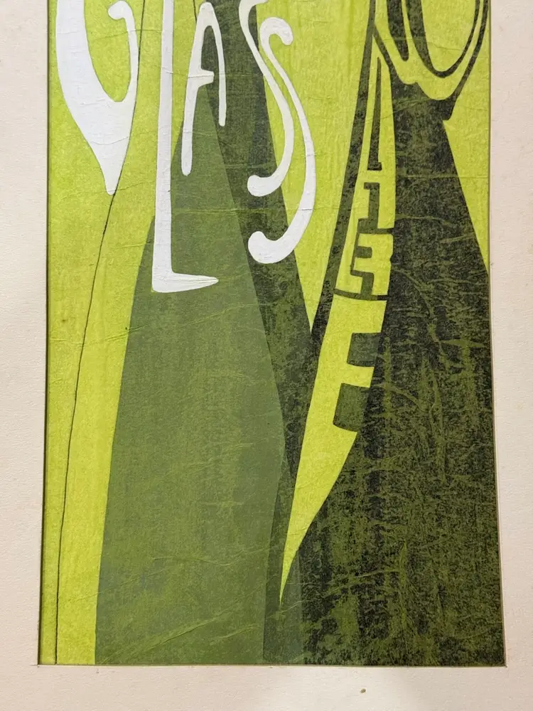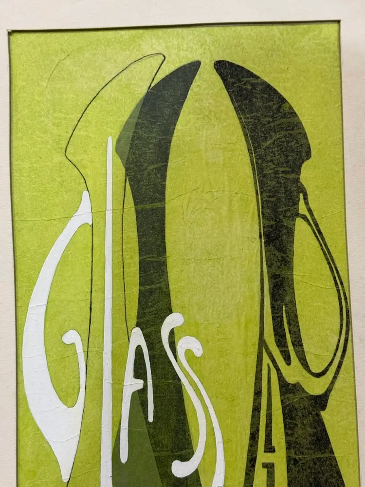 GLASS WARE Very groovy!! From the 50-60. Maybe used in a department store This has fabric, screen printing, and hand painting. It is signed on the back John something. Matted 20x11 Just saw something similar on the antique road show from a Howard university student and it valued over $1000. Who knows if the mark is under the matting. It would be up to the buyer to take it apart and see if there is a stamp or signature. Your gain could be my loss. It’s a fun piece for all you glass collectors.
