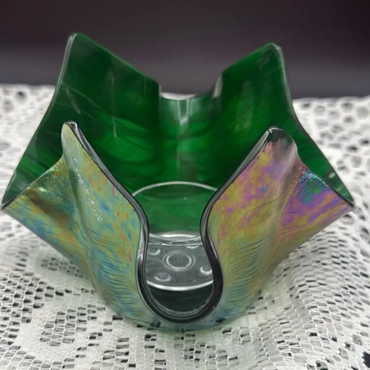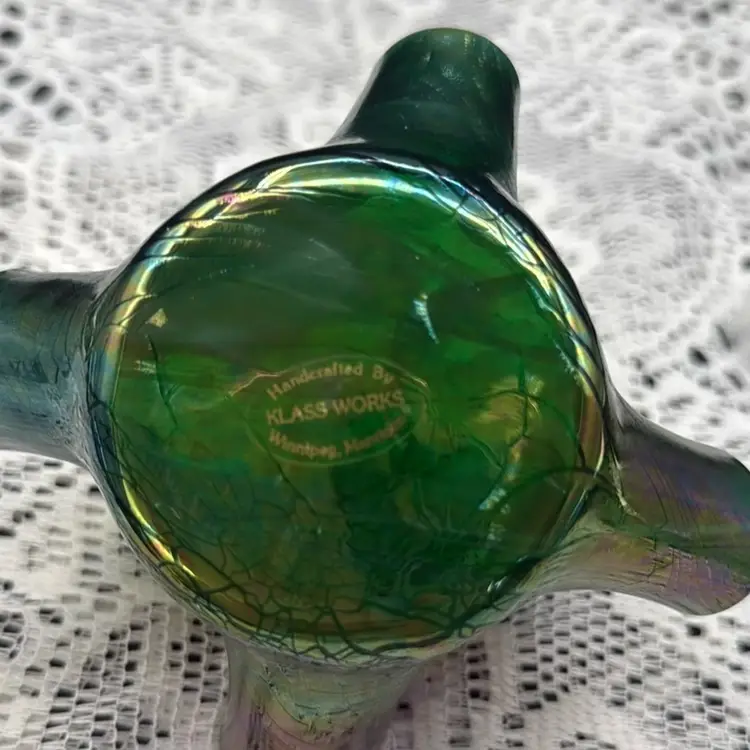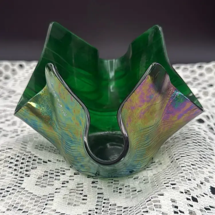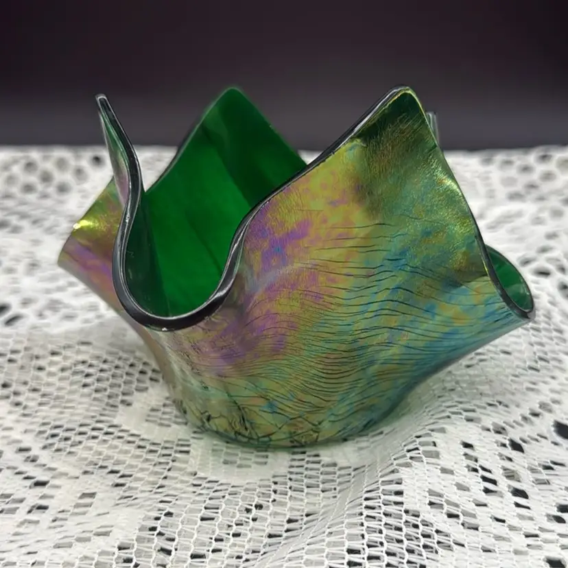 Glass Works Iridescent Oil Slick Hankie Dish Candle Holder made by Klass Works in Winnipeg Manatoba No chips or cracks Measures 4” x 3.5”