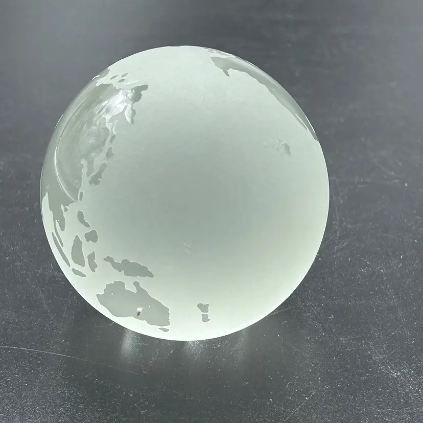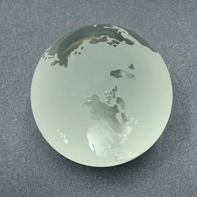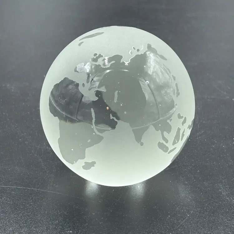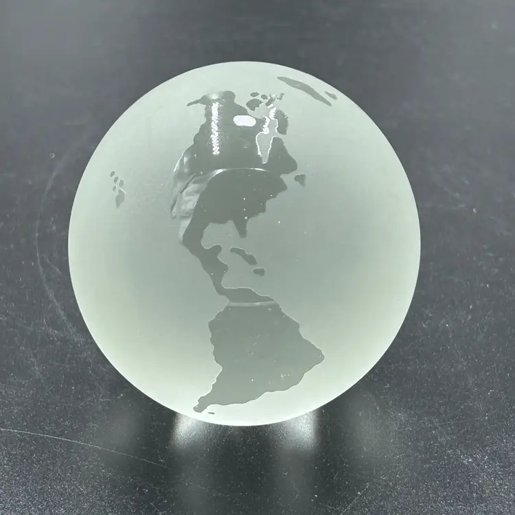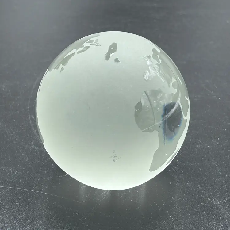 This vintage glass globe paperweight is a beautiful addition to any collection. The frosted glass world continents design adds a touch of elegance to any room. Made of high-quality glass, the paperweight is both durable and unique. The clear color allows for versatility in placement. Perfect for collectors of paperweights, decorative collectibles, or anyone looking for a unique and stylish home decor item. Excellent condition. Approximate size: 3" diameter x 3" high Please see photos for more details.