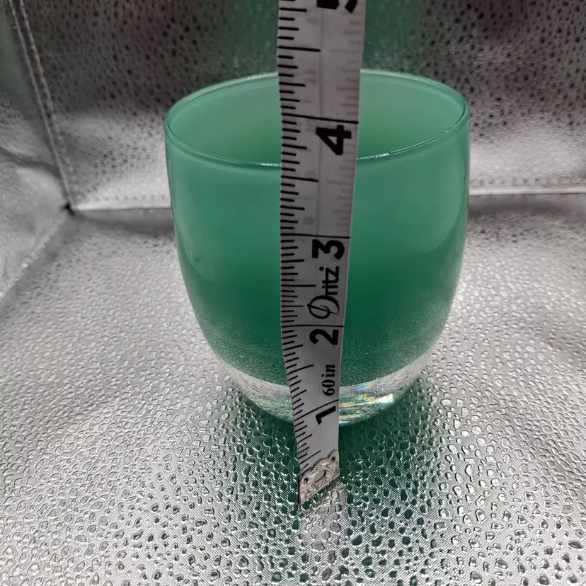 • Hand-blown glass construction • Soft teal to clear gradient • Approximately 3.5" tall, 3.5" wide • Weighted base for stability • Ideal for tea lights or small candles