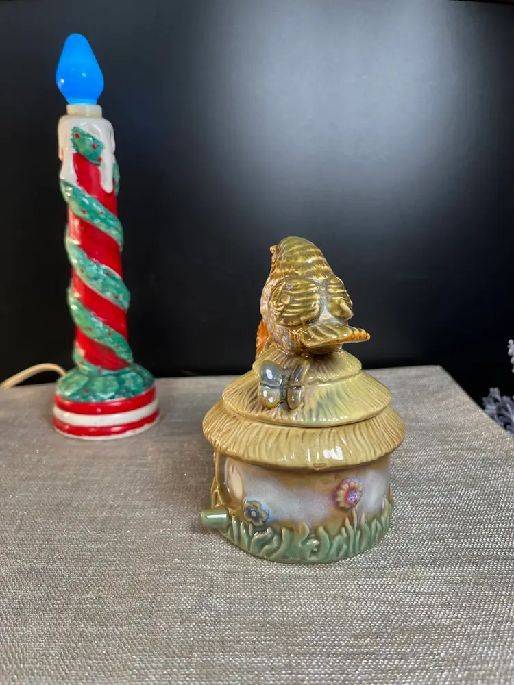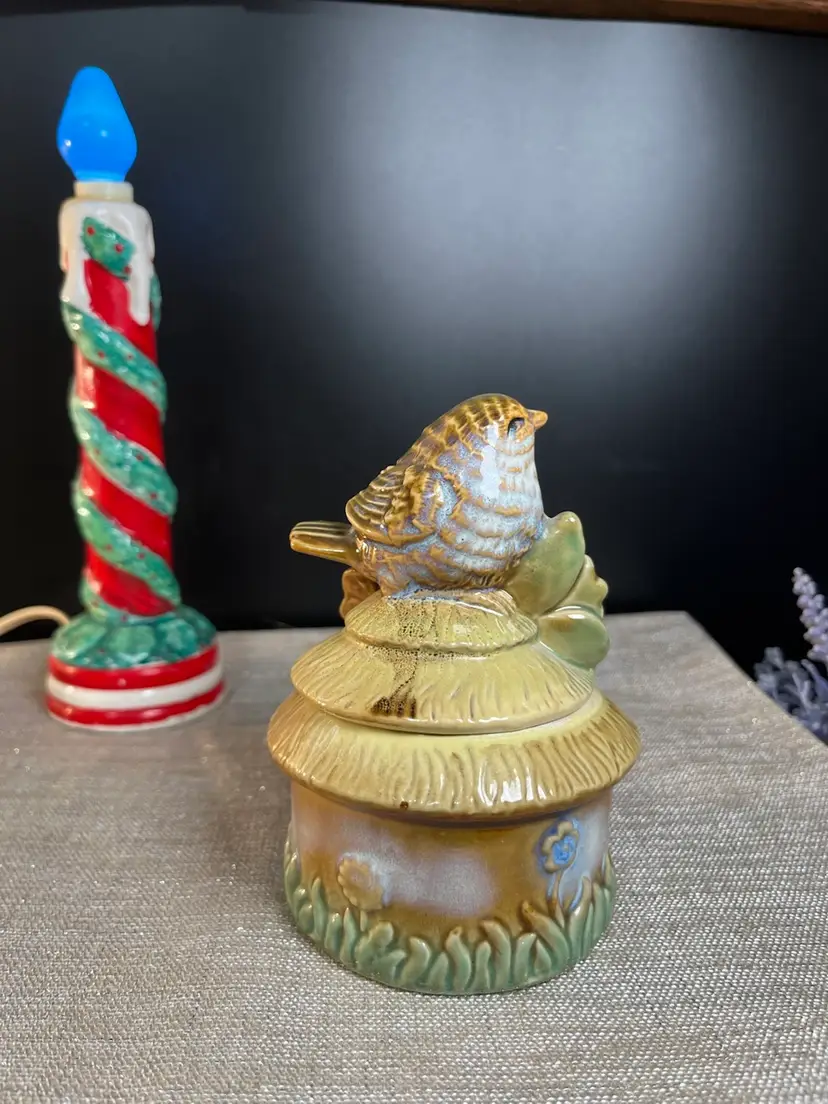 This has no makers mark. I love the subdued colors. He appears to be a happy and content lil bird. There are no call outs on this dude. there are no chips, cracks or bruises. It measures approx 5.5"H, 3.5" Diameter, 9.8 Oz.