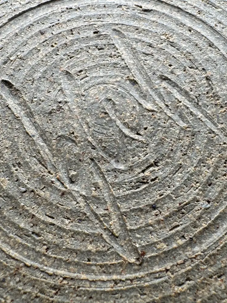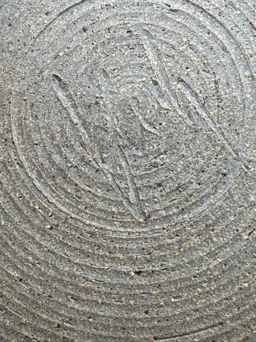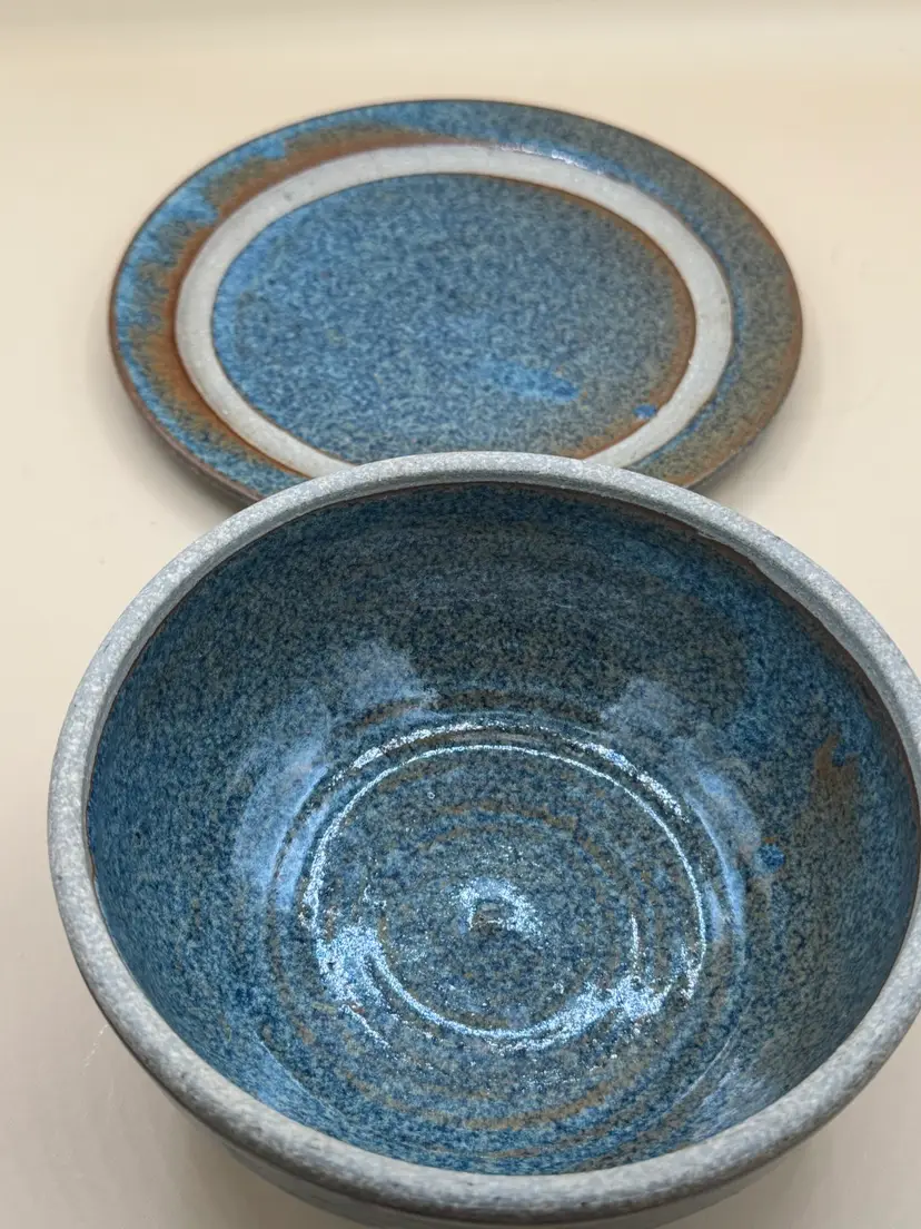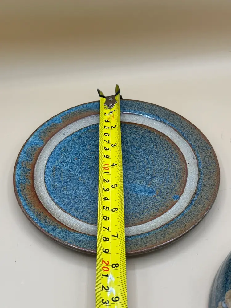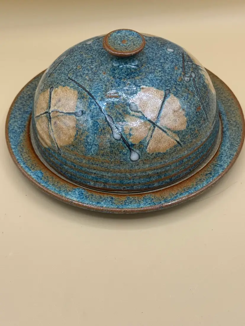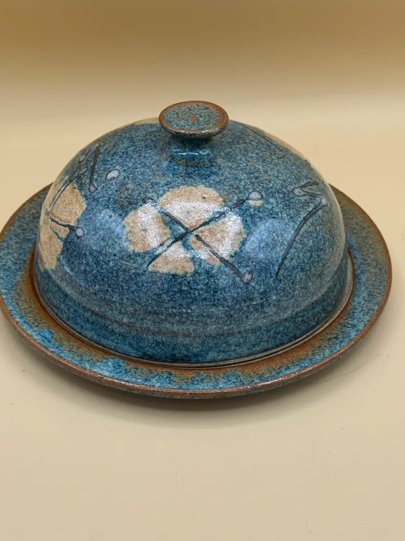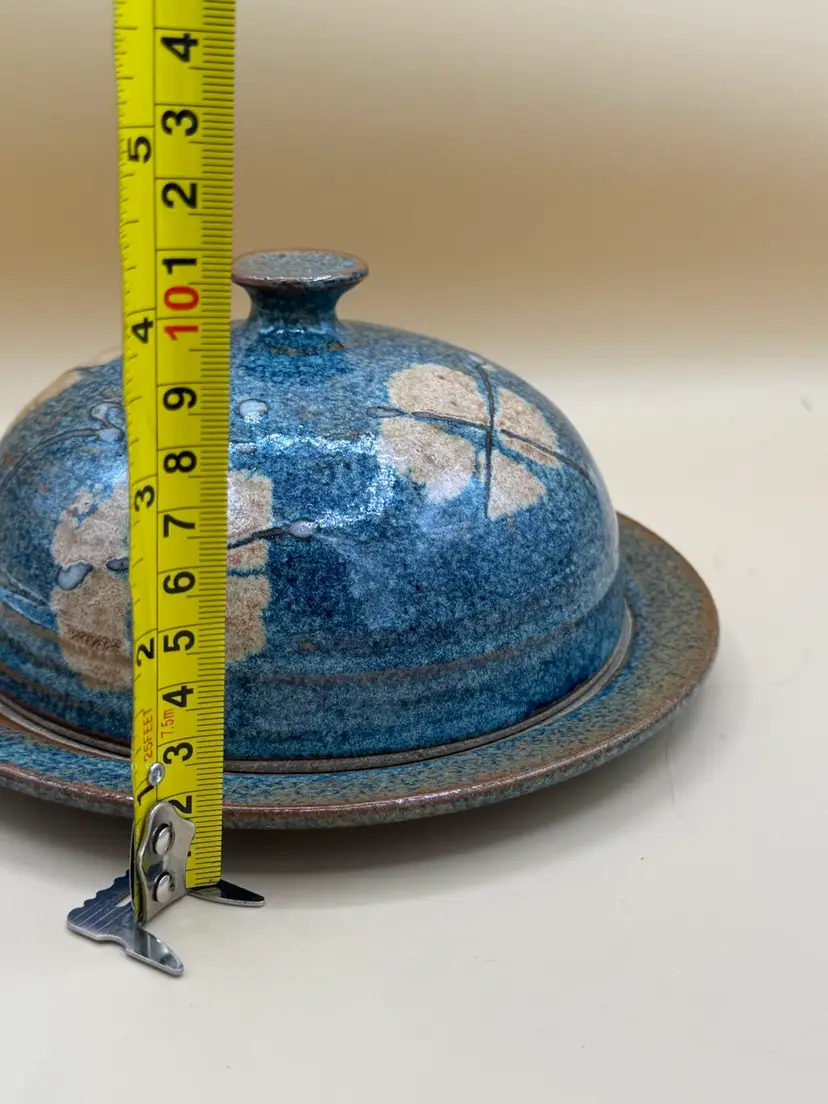 This pretty cloche features a distinctive blue and brown glaze with stylized foliage details, possibly using sgraffito technique. It measures a 7 1/2” diameter and about 4” tall. Excellent condition abd signed on bottom.