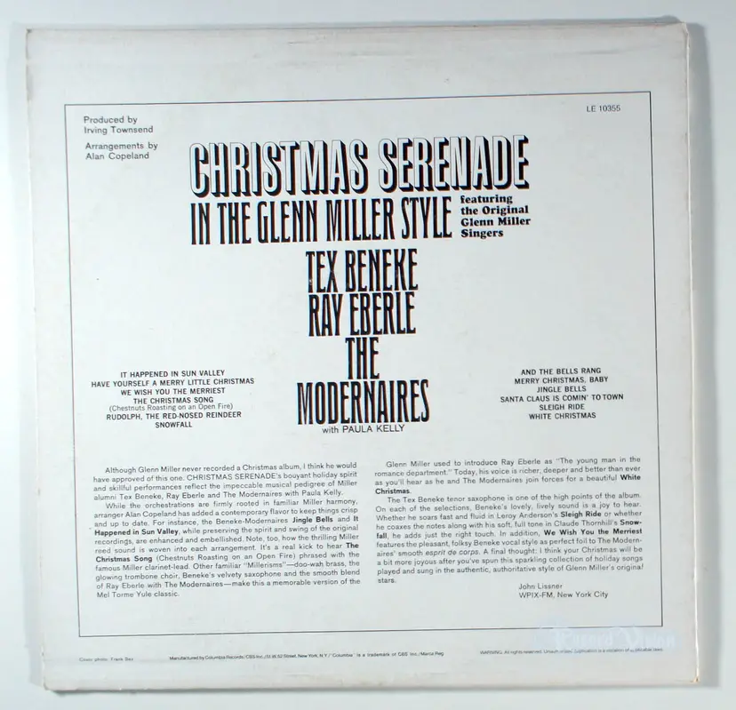 Although Glenn Miller never recorded a Christmas album, he would have approved of this one. Christmas Serenade's bouyant holiday spirit and skillful performances reflect the impeccable musical pedigree of Miller alumni Tex Beneke, Ray Eberle and The Modernaires with Paula Kelly. While the orchestrations are firmly rooted in familiar Miller harmony, arranger Alan Copeland has added a contemporary flavor to keep things crisp and up to date. The Tex Beneke tenor saxophone is one of the high points of this album. On each of the selections, Beneke's lovely, lively sound is a joy to hear. Whether he soars fast and fluid in Leroy Anderson's Sleigh Rider or whether he coaxes the notes along with his soft, full tone in Claude Thornhill's Snowfall, he adds just the right touch. In addition, We Wish You the Merriest features the pleasant folksy Beneke vocal style as perfect foil to the Modernaires' smooth esprit de corps. A final thought: your Christmas will be a bit more joyous after you've spun this sparkling collection of holiday songs played and sung in the authentic, authoritative style of Glenn Miller's original stars. (John Lissner, WPIX-FM, NYC)