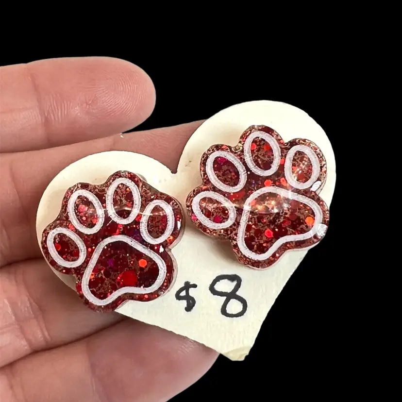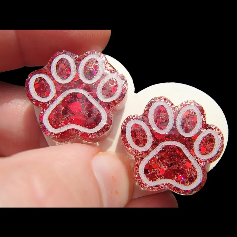 These adorable paw print earrings are perfect for any dog cat pet lover. Made with epoxy resin and filled with super ruby red glitter for a sparkling effect. Stainless steel posts.