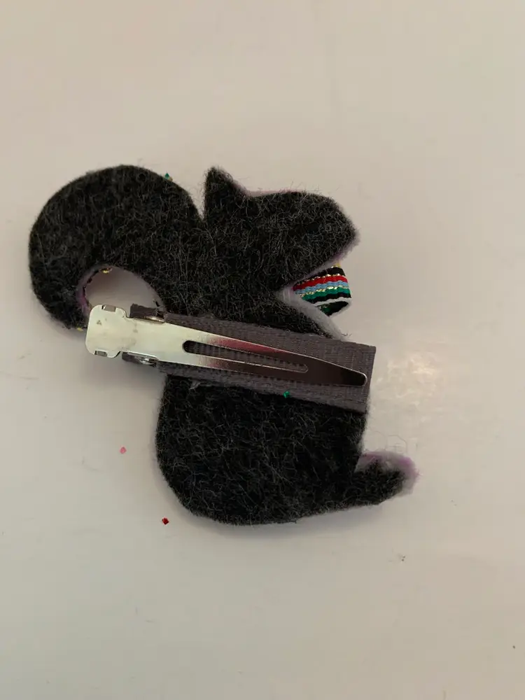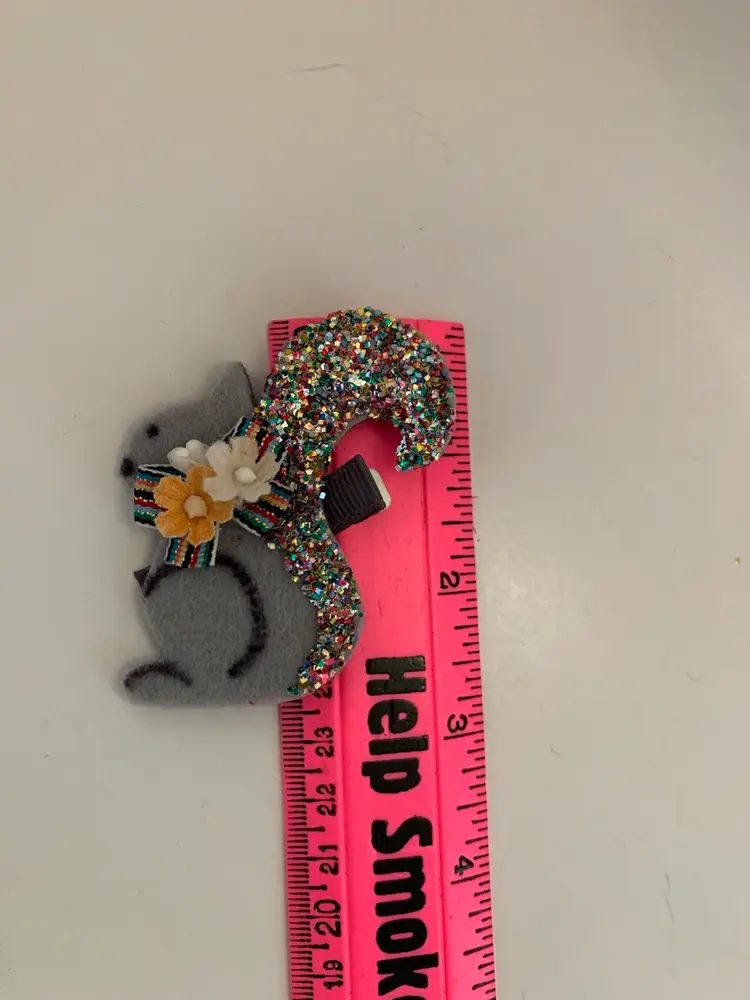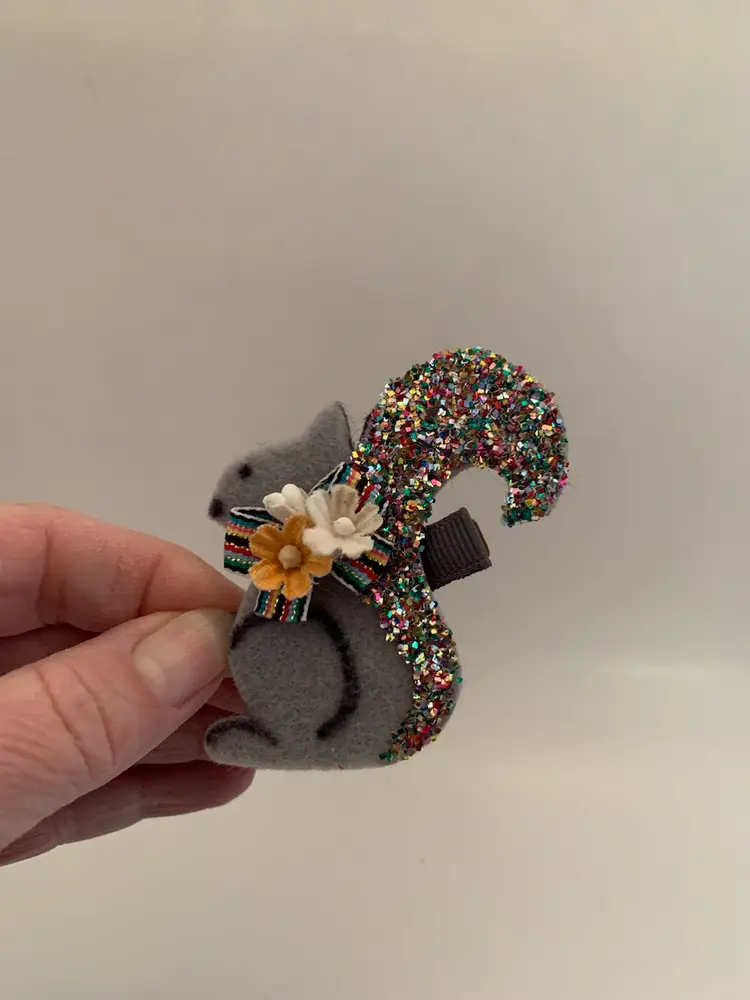 Handmade and designed by me, glittered felt squirrel hair clip. Made from gray felt, vintage multicolor glitter, vintage rainbow striped ribbon and vintage forget-me-nots. 2 1/2” in height. A uniquely fun accessory!