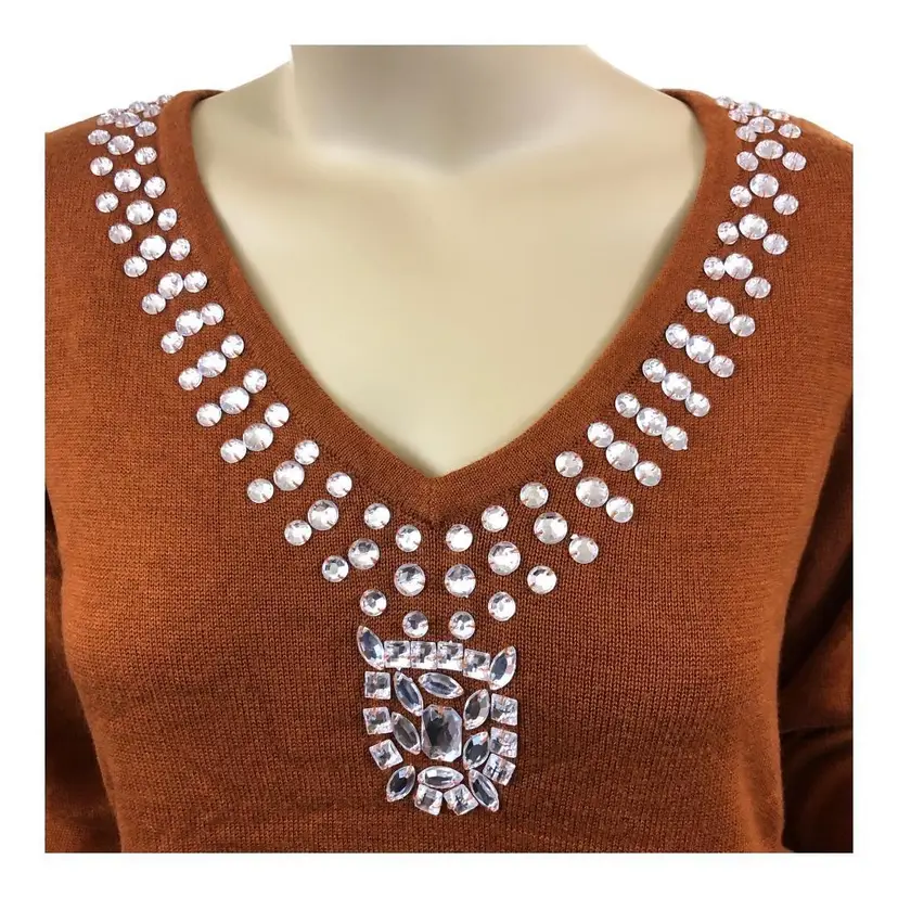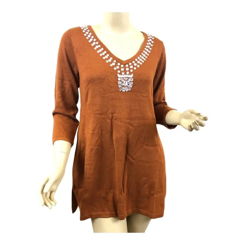 Featuring: — Clear faux gemstone beads — Pullover Style — V-neck neckline — 3/4 length sleeves