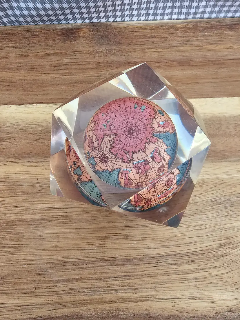Charming Globe Lucite paperweight perfect for adding a touch of worldly elegance to your desk or bookshelf. A great find for collectors and travel enthusiasts.