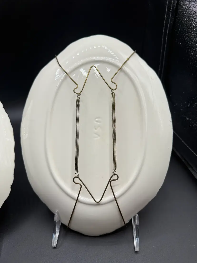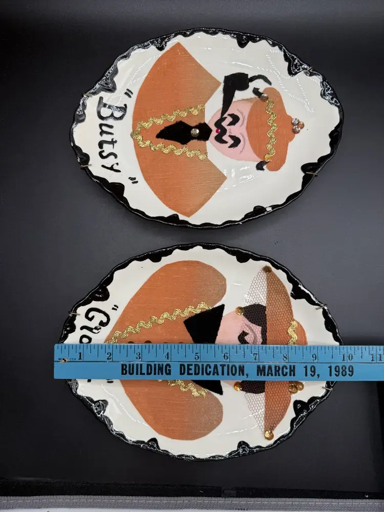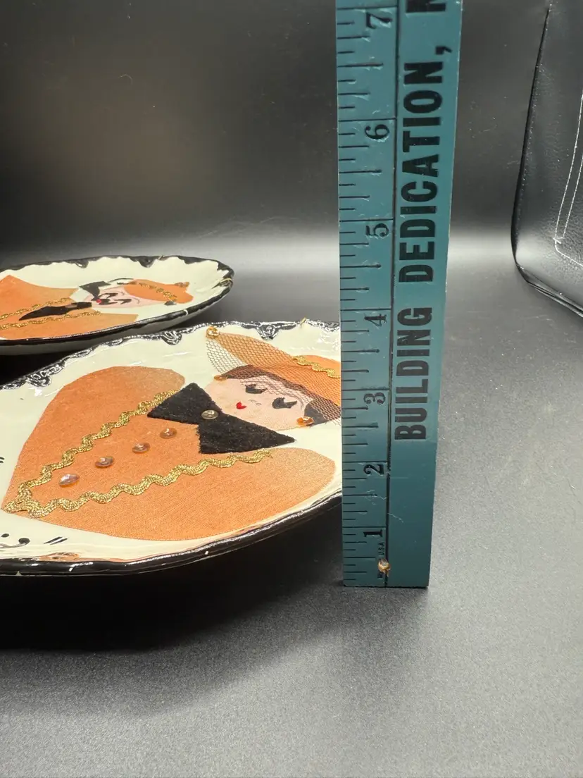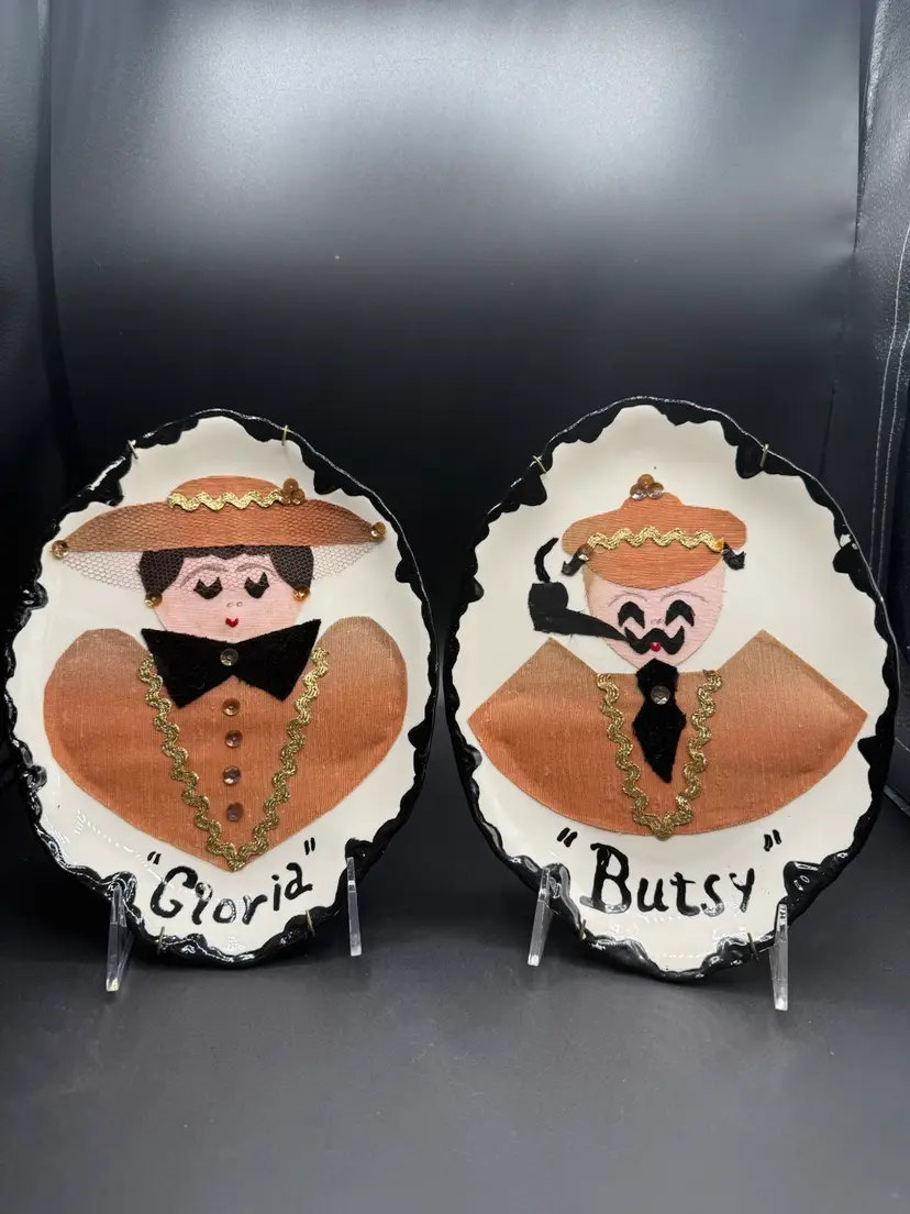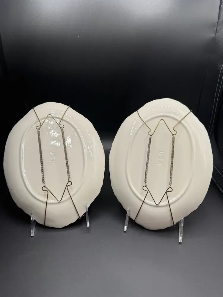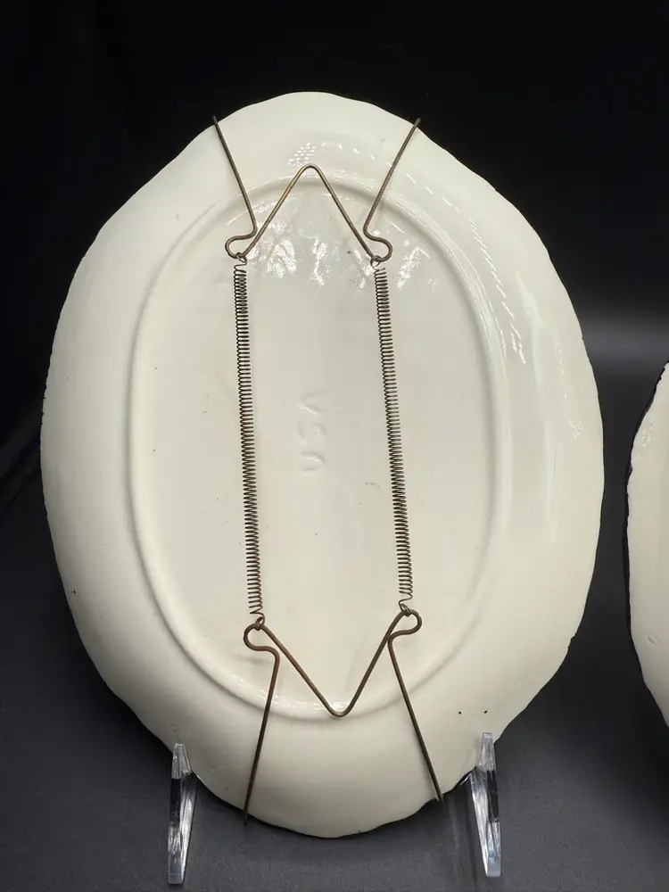 Condition: There is wear to the cold paint, it is missing in places on both plates. There is fading to the fabric on both pieces. There is wear to the metal plate holders that are attached to the back of both pieces. There are no chips or cracks to either piece.