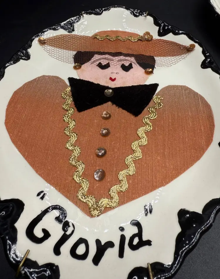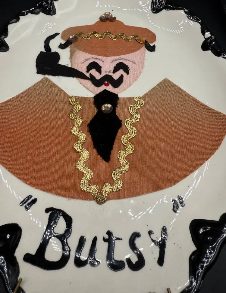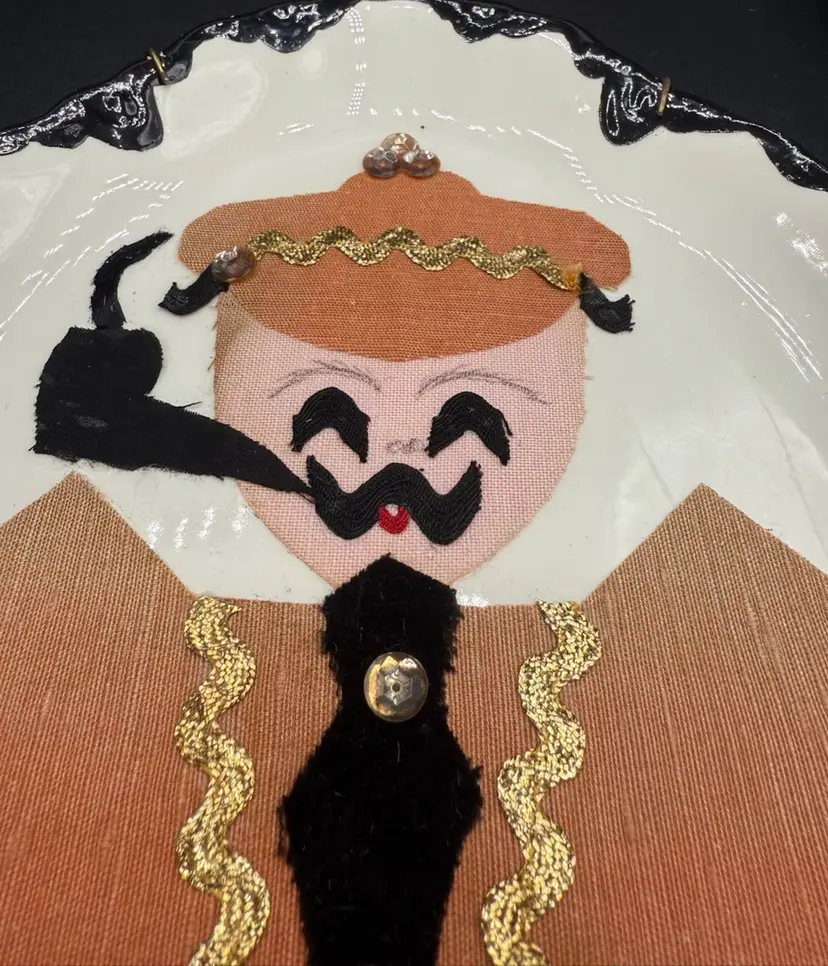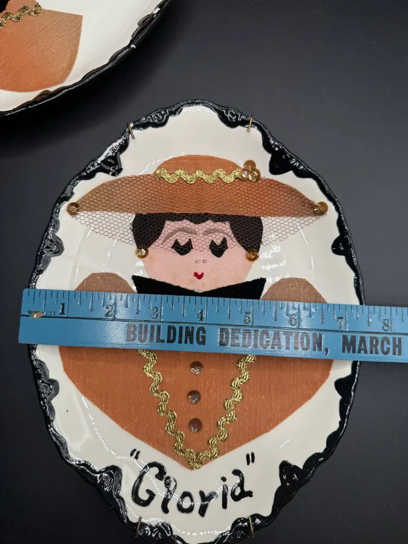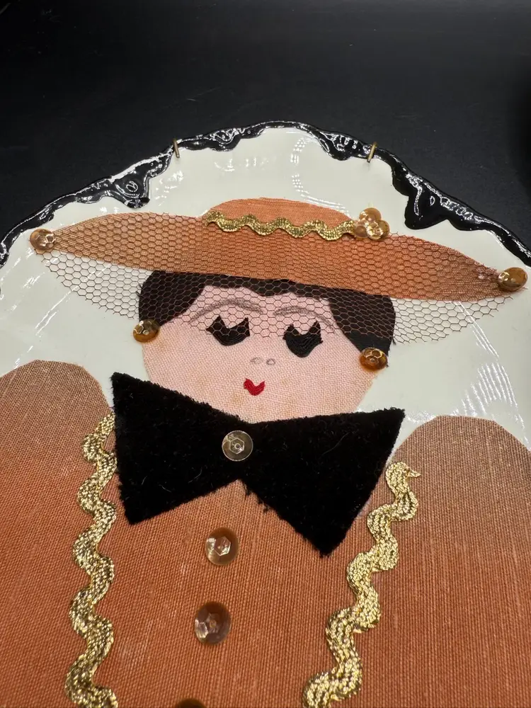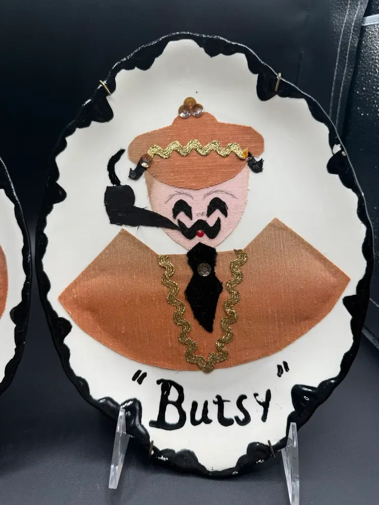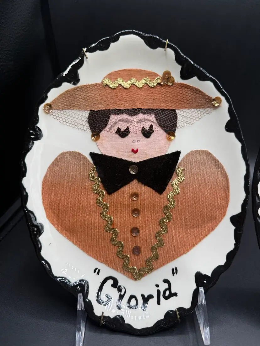 Condition: There is wear to the cold paint, it is missing in places on both plates. There is fading to the fabric on both pieces. There is wear to the metal plate holders that are attached to the back of both pieces. There are no chips or cracks to either piece.
