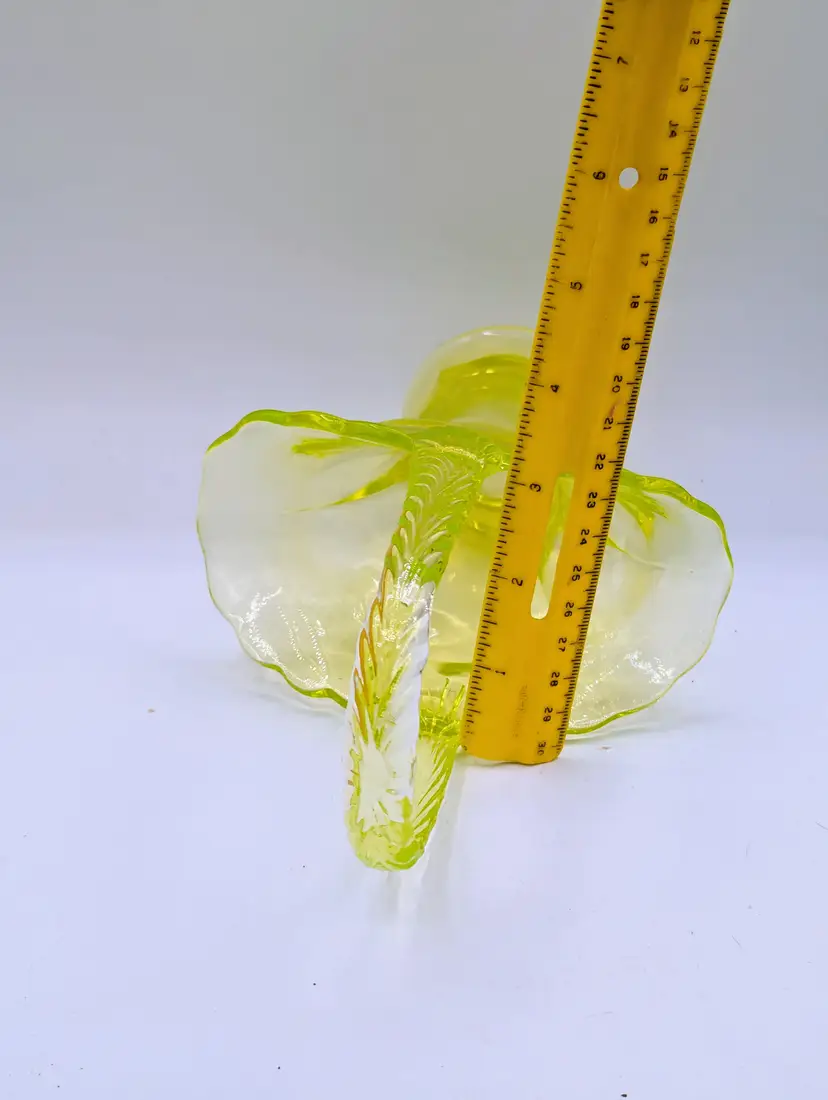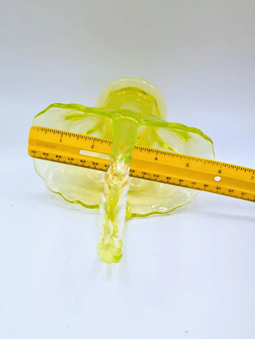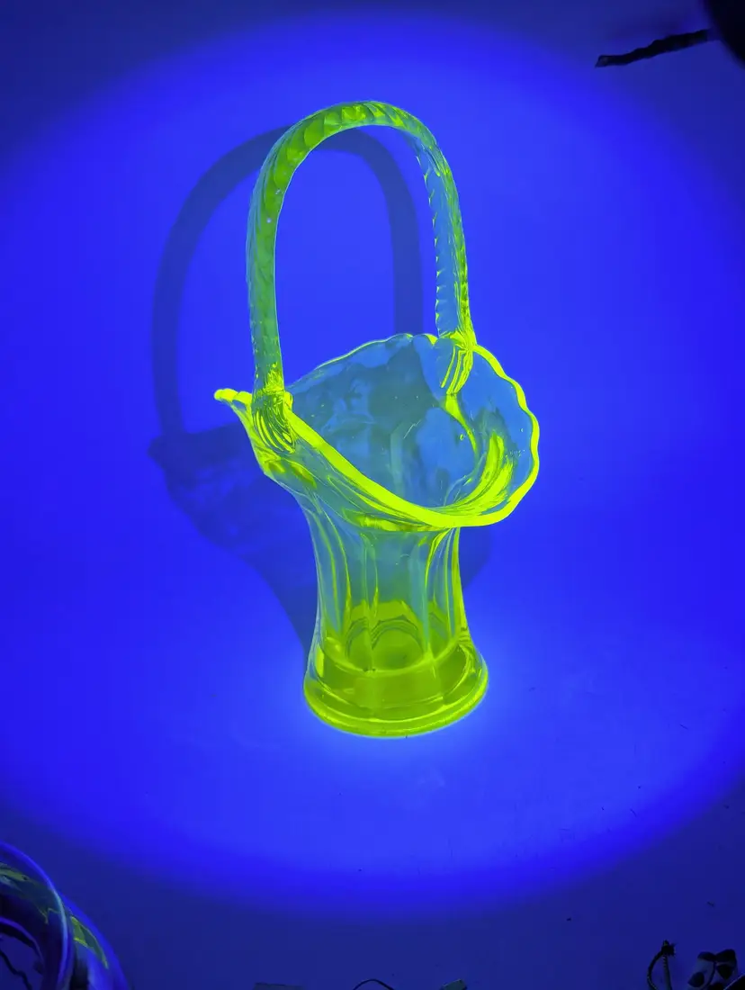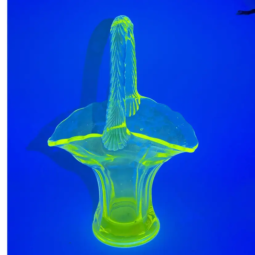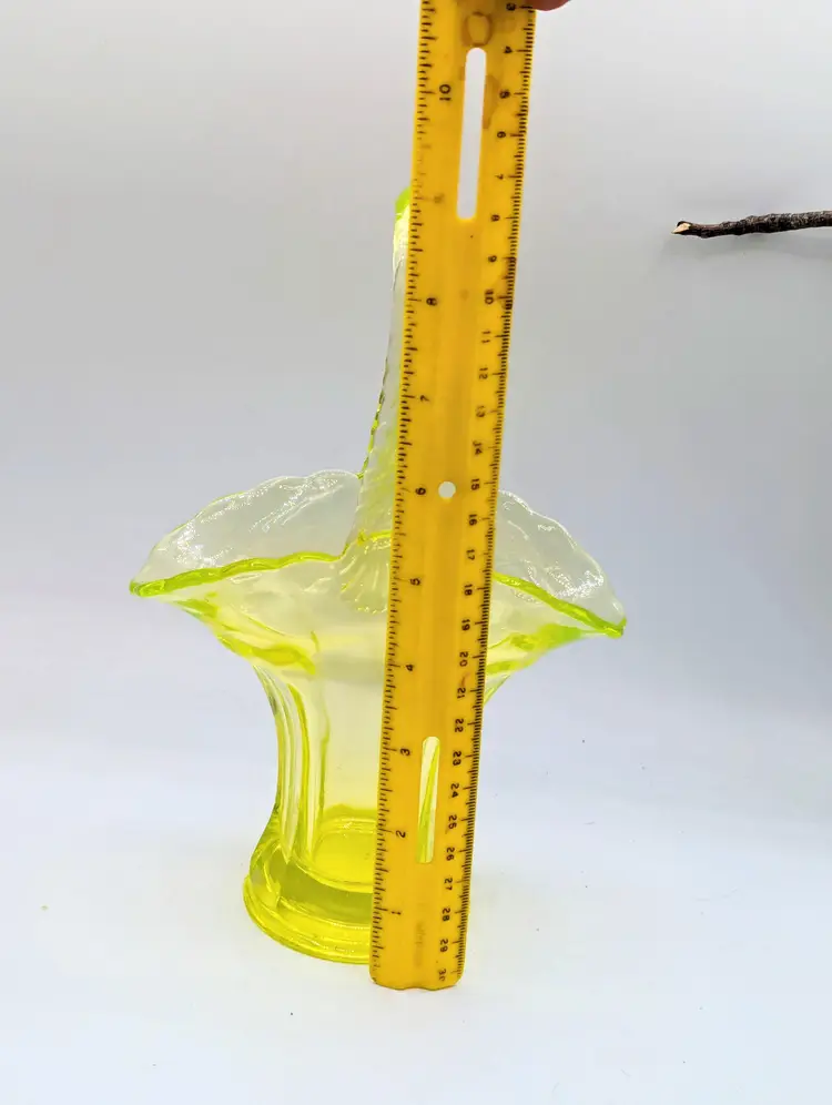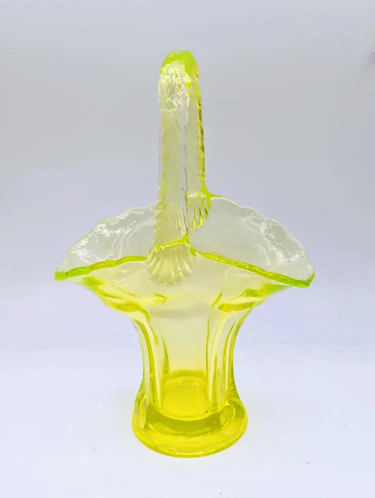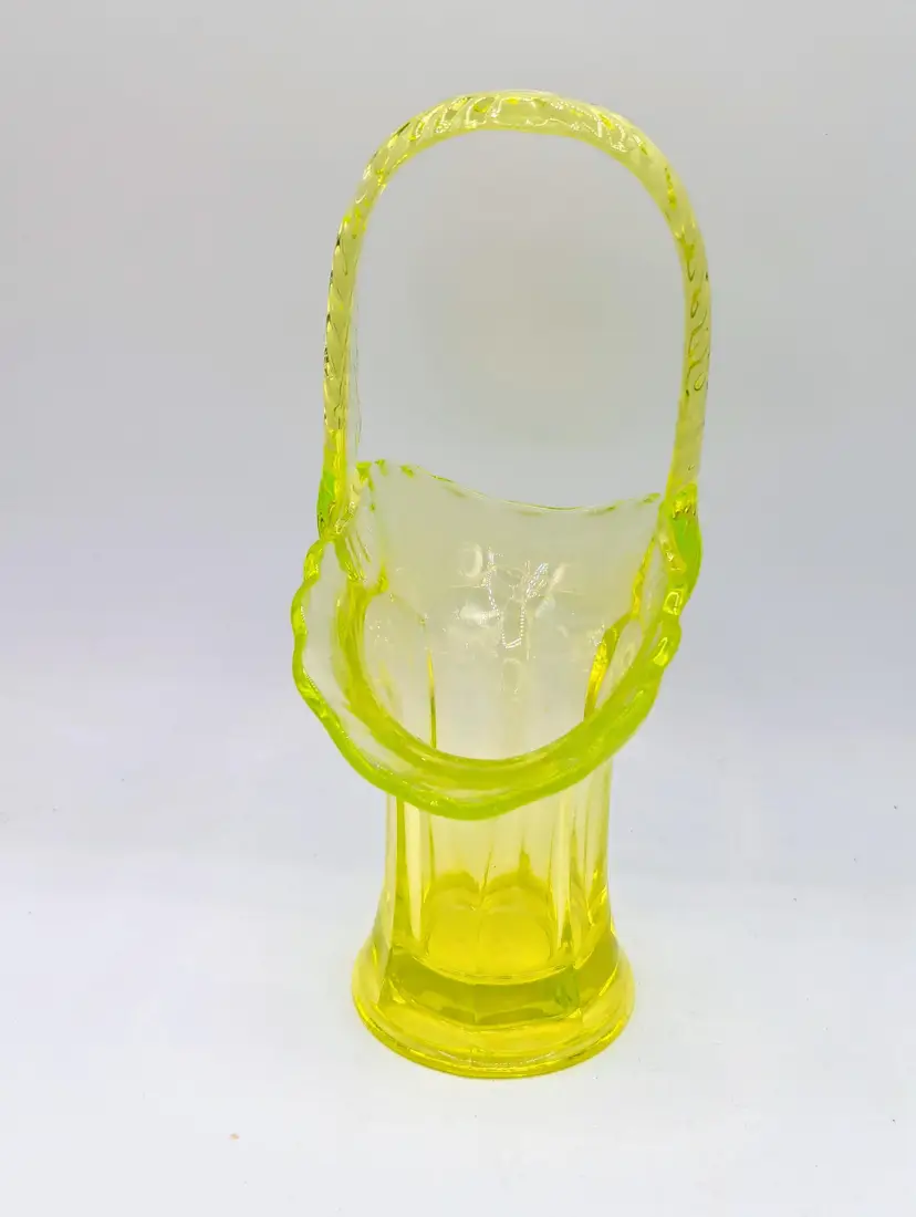 Here's a pretty tall handle basket attributed to Duncan & Miller. The color is Canary Yellow Vaseline and was made ca. 1930's. No Chips or Cracks. The color is so bright. It practically glows without a UV light. Ch102824