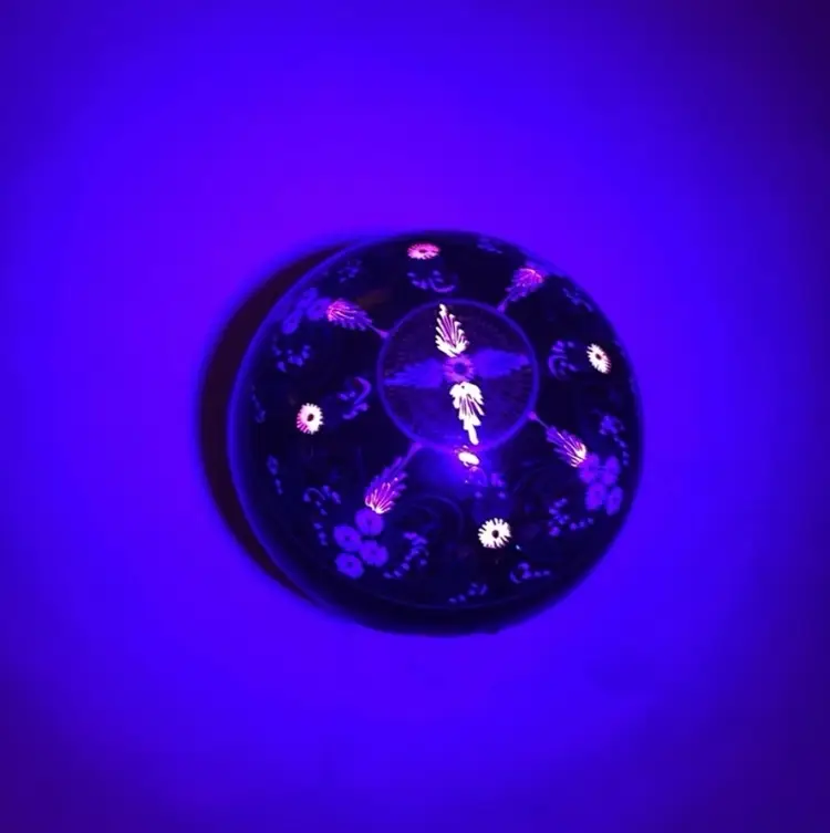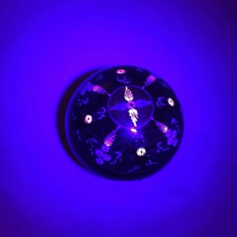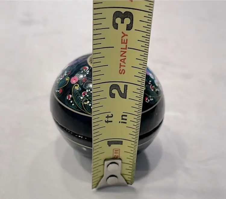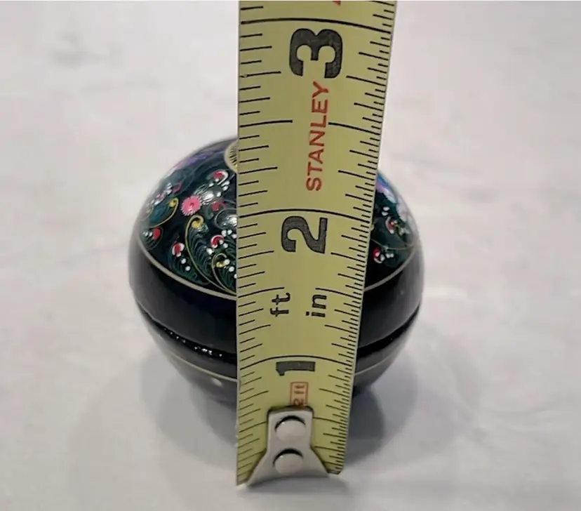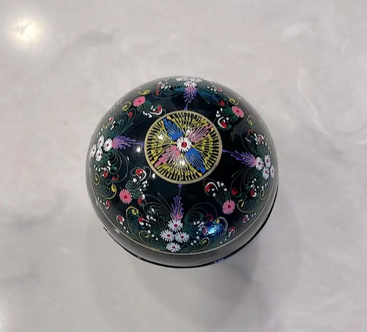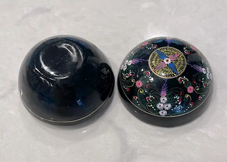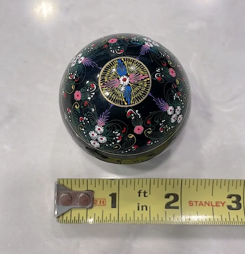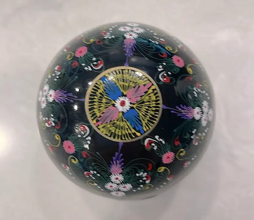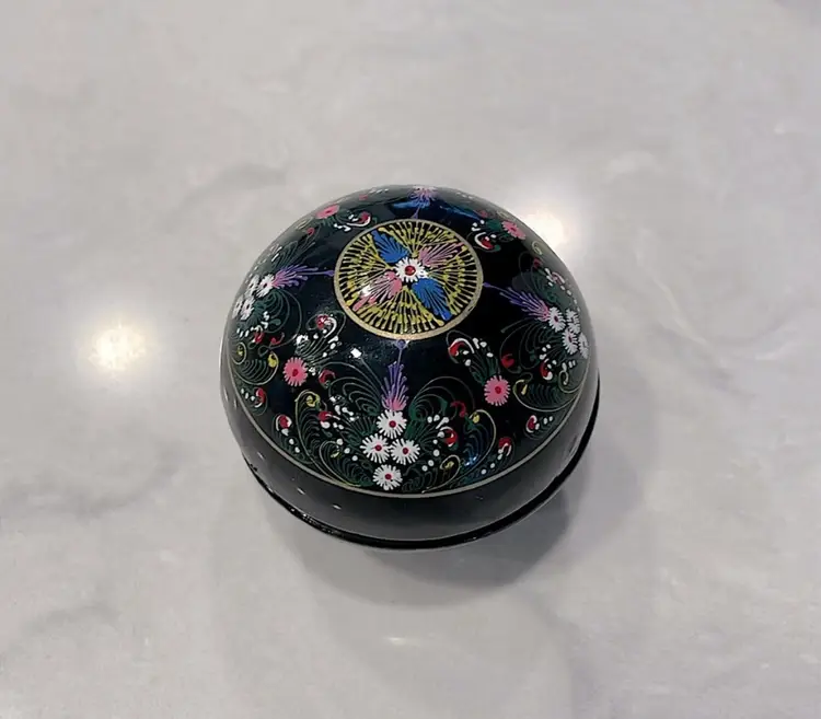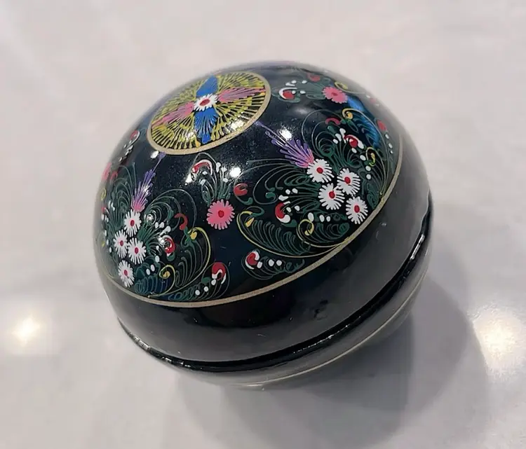 Glows! Round black lacquer ball/box, intricately decorated. Black light tested! Measures 2” in diameter.