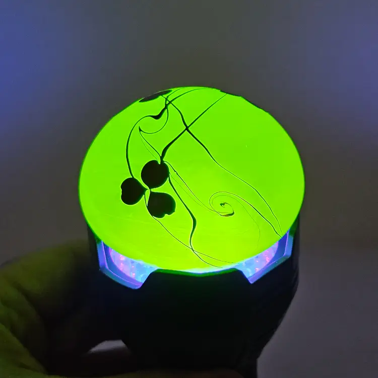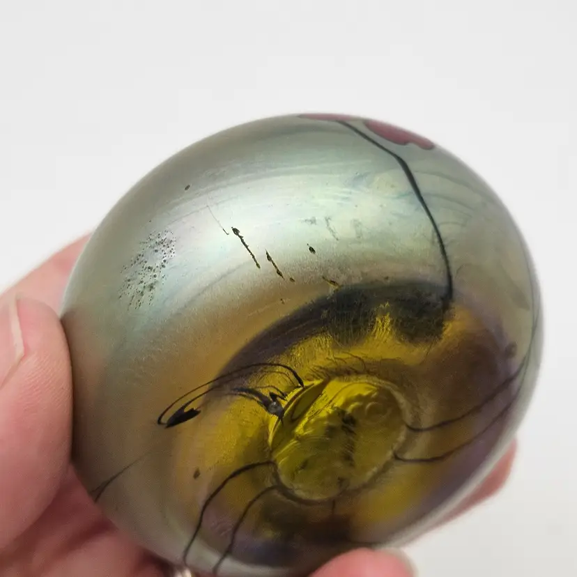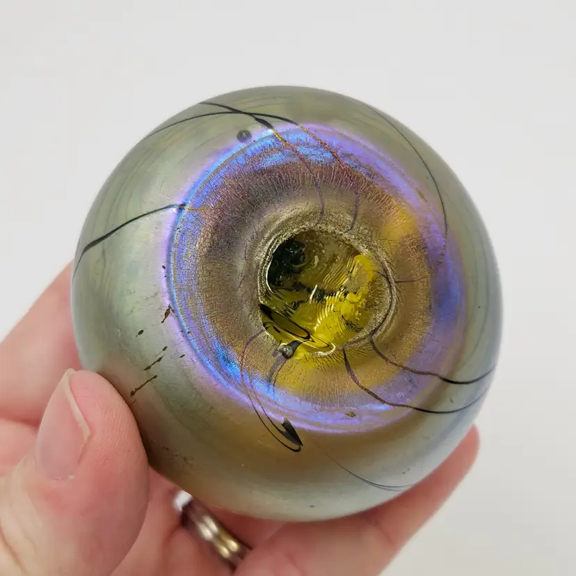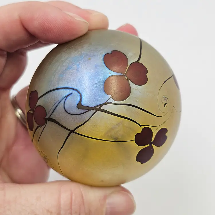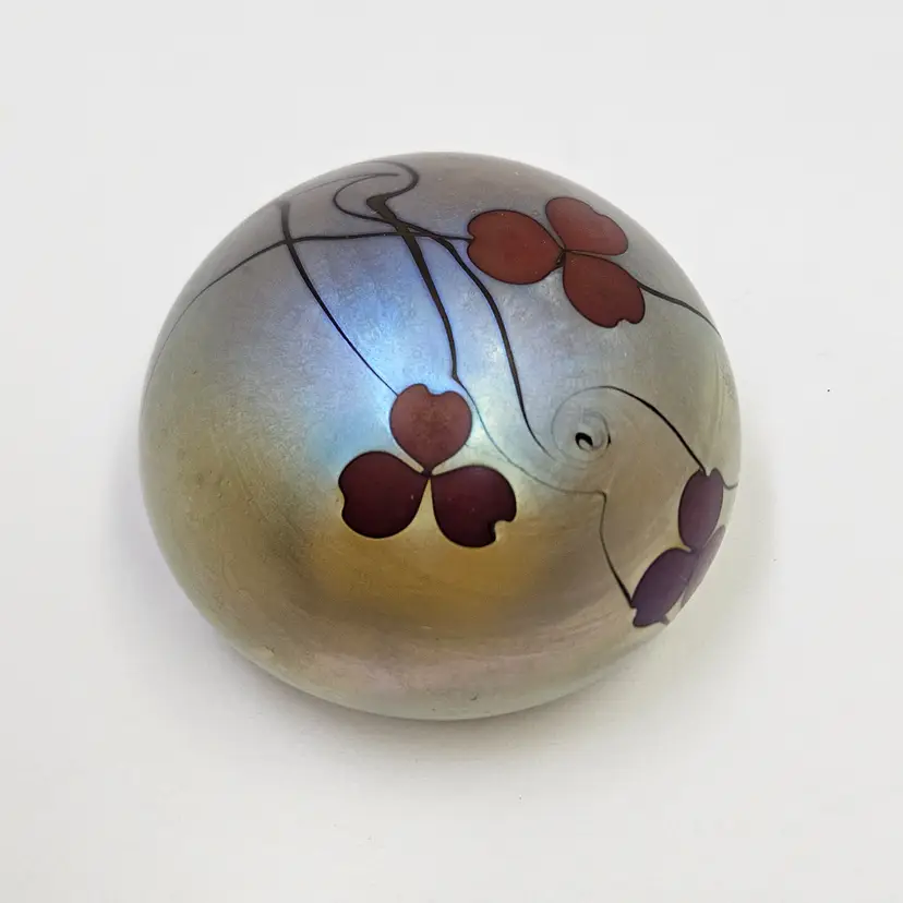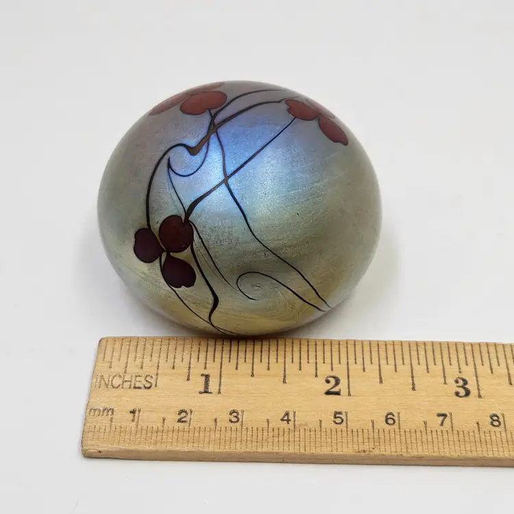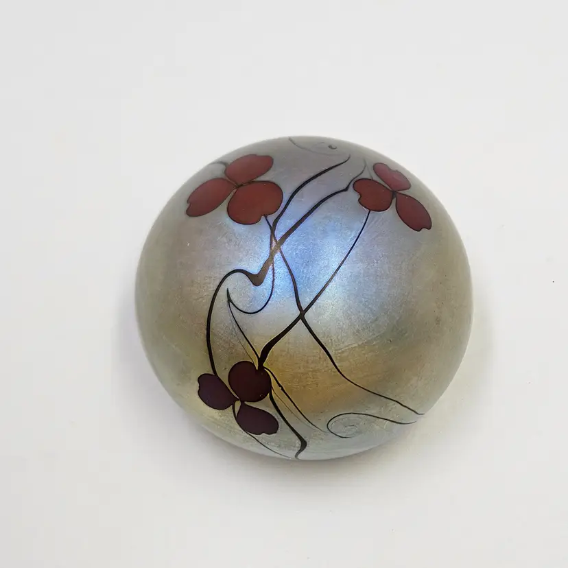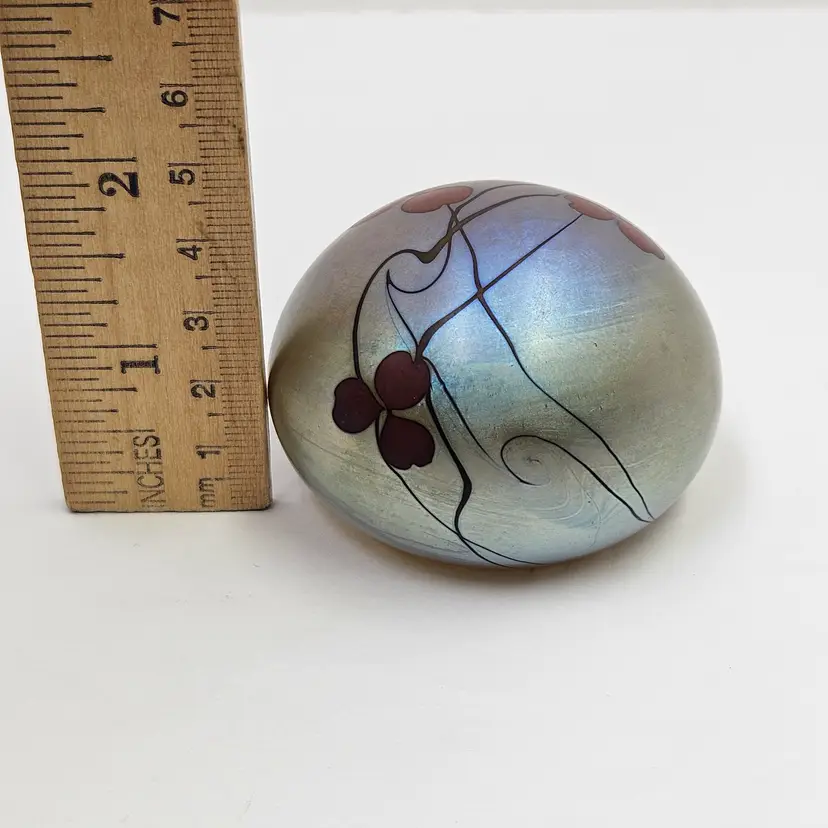 Amazing glass paperweight, glowy, iridescent/aurene finish with flower & Vine, unsigned, 1.75"x2.5", no chips or cracks, light scuff in finish near base.