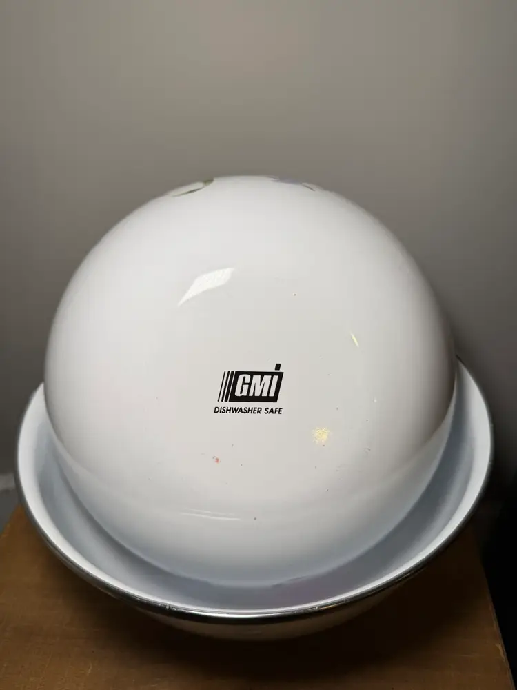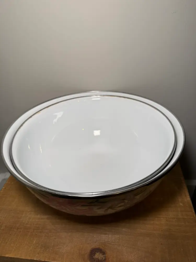 Vintage GMI White Enamel Nesting Mixing Bowls, Set of 2 — Featuring a delicate pink and purple Iris floral pattern. These charming retro bowls are perfect for both food preparation and vintage-themed kitchen decor.