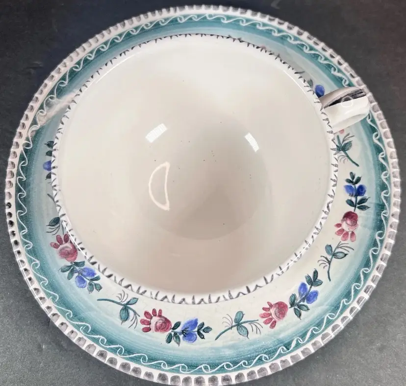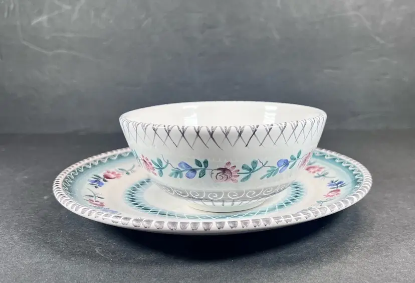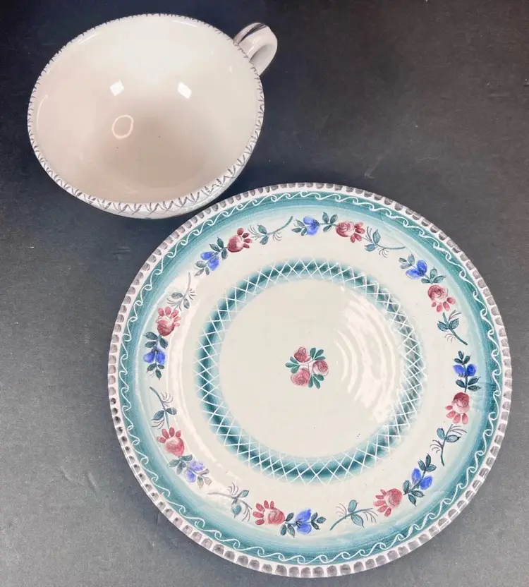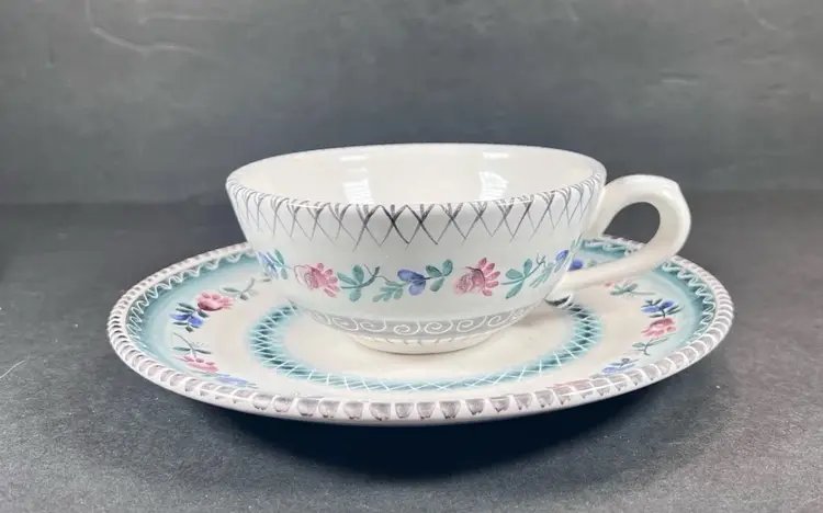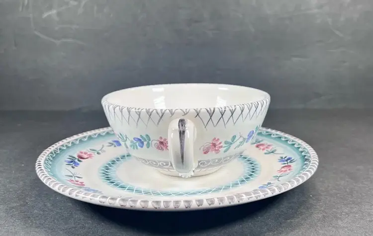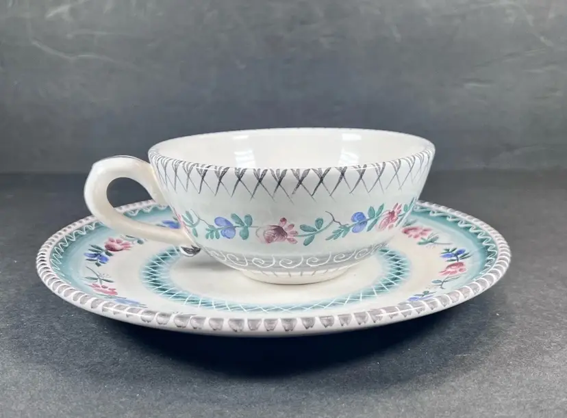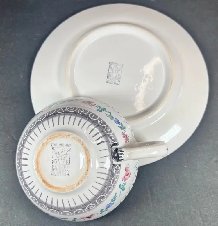 This GMunder Keramik teacup and saucer set features a beautiful hand-painted floral design on ceramic material. The set includes a saucer and the teacup has an unknown capacity. It was produced in Austria in the 1980s using art pottery production style and pottery techniques. The vintage set is perfect for tea enthusiasts and collectors alike, and its multicolor floral pattern adds a touch of elegance to any setting. It is an original piece and is ideal for both teens and adults. Add this beautiful GMunder Keramik Austria teacup and saucer set to your collection today!