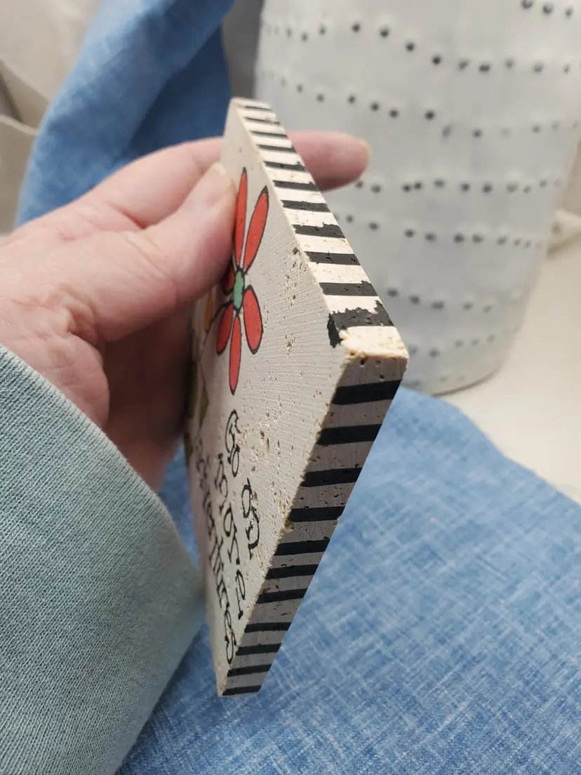 4" x 4" natural stone tiles wall art. Painted with India inks. Each is Handpainted by me in my Northern Illinois Home Studio. I enjoy painting on natural stone as their variations help to create one of a kind look!