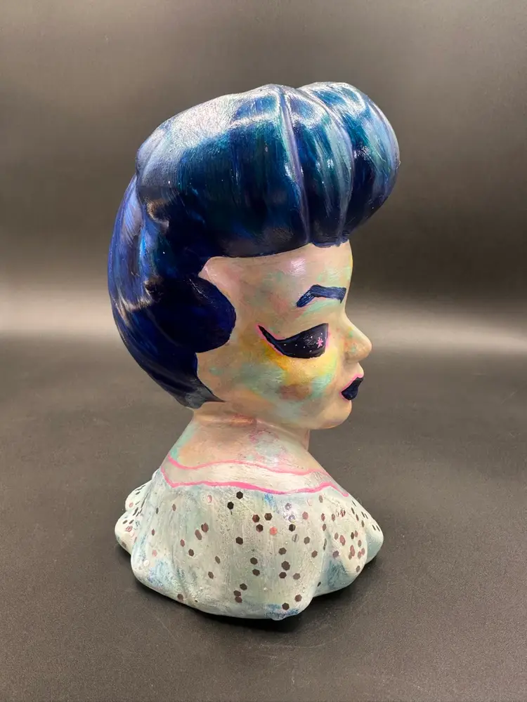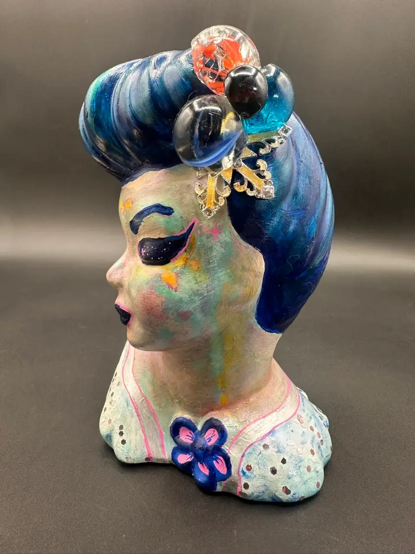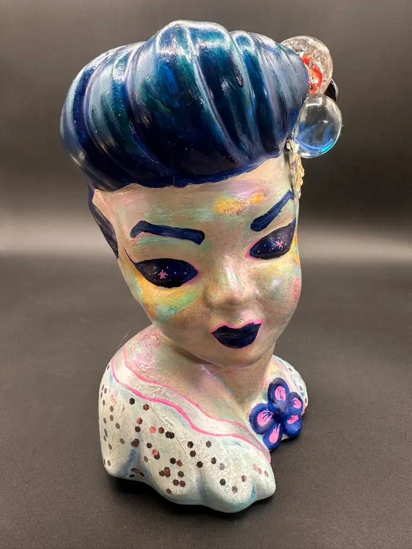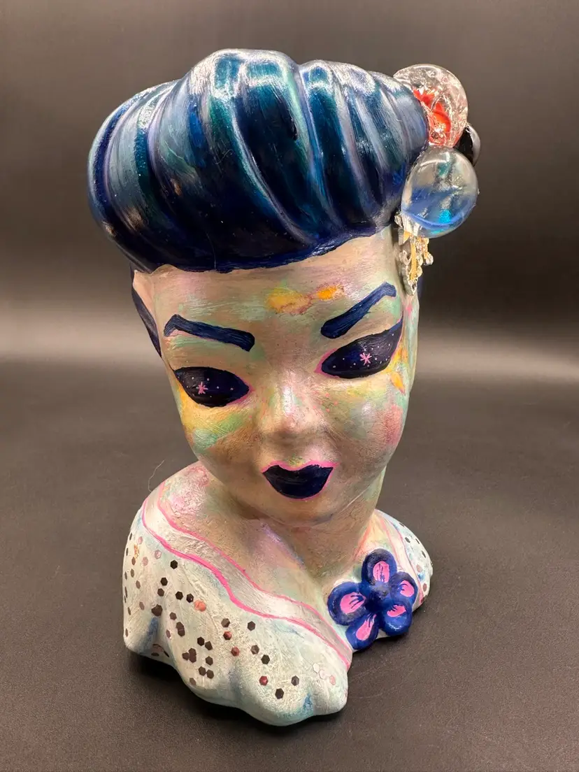 Vintage bombshell headvase reimagined as an ethereal Goddess of the Universe! Handpainted and sealed, signed and dated on the base.