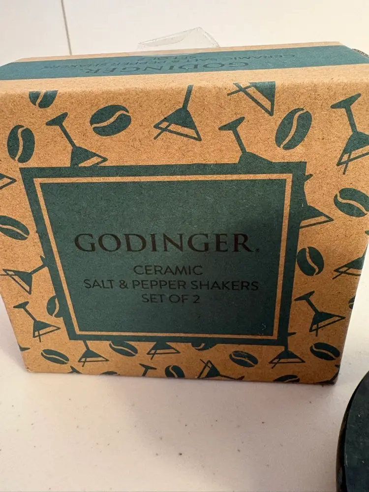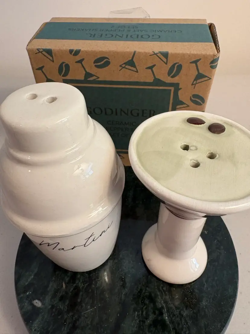 The Godinger Martini Salt and Pepper Shakers Set of 2 by Godinger Co. is a novelty kitchen accessory featuring a unique martini shaker design. Made of ceramic, this set includes a salt and pepper shaker in the shape of a martini shaker and glass. Perfect for all occasions, this set adds a touch of fun and style to your dining table or kitchen decor. The quirky and eye-catching design makes it a practical yet decorative piece for your home. In its original box