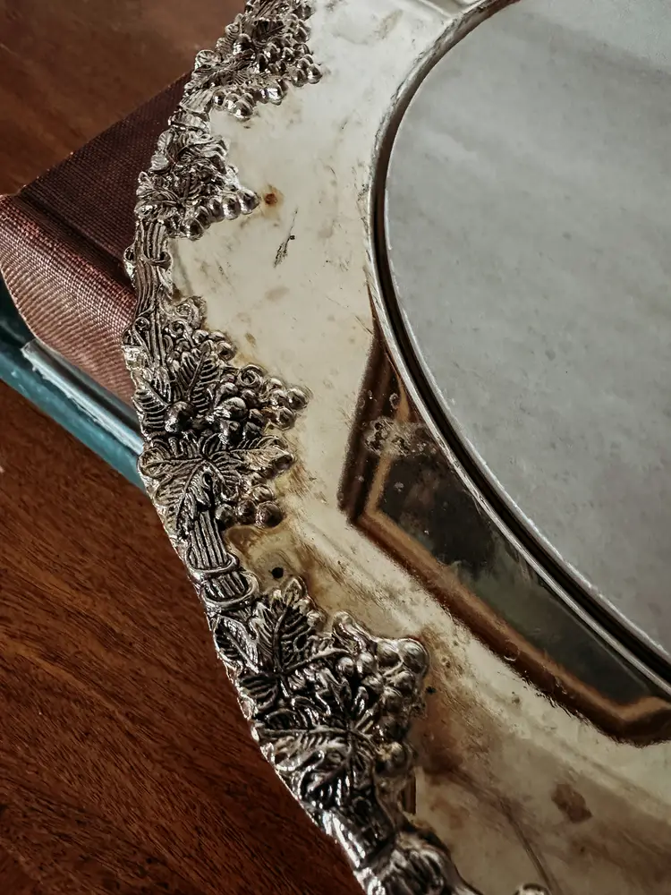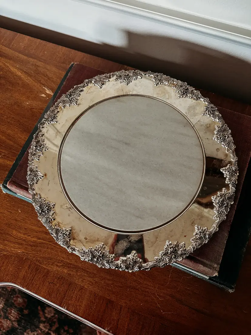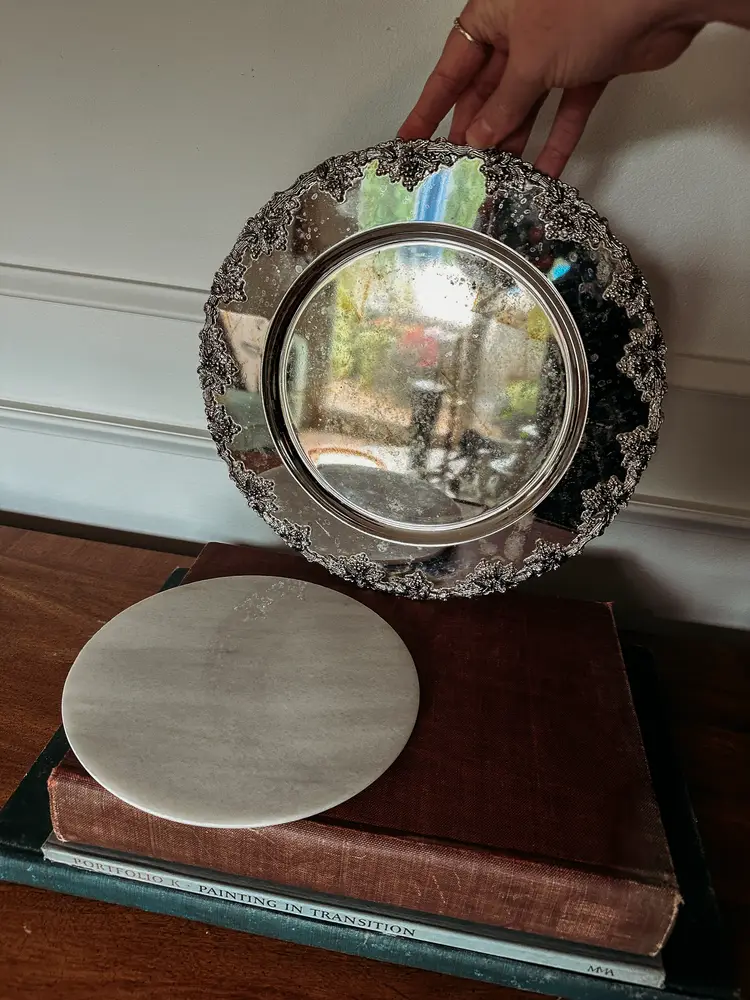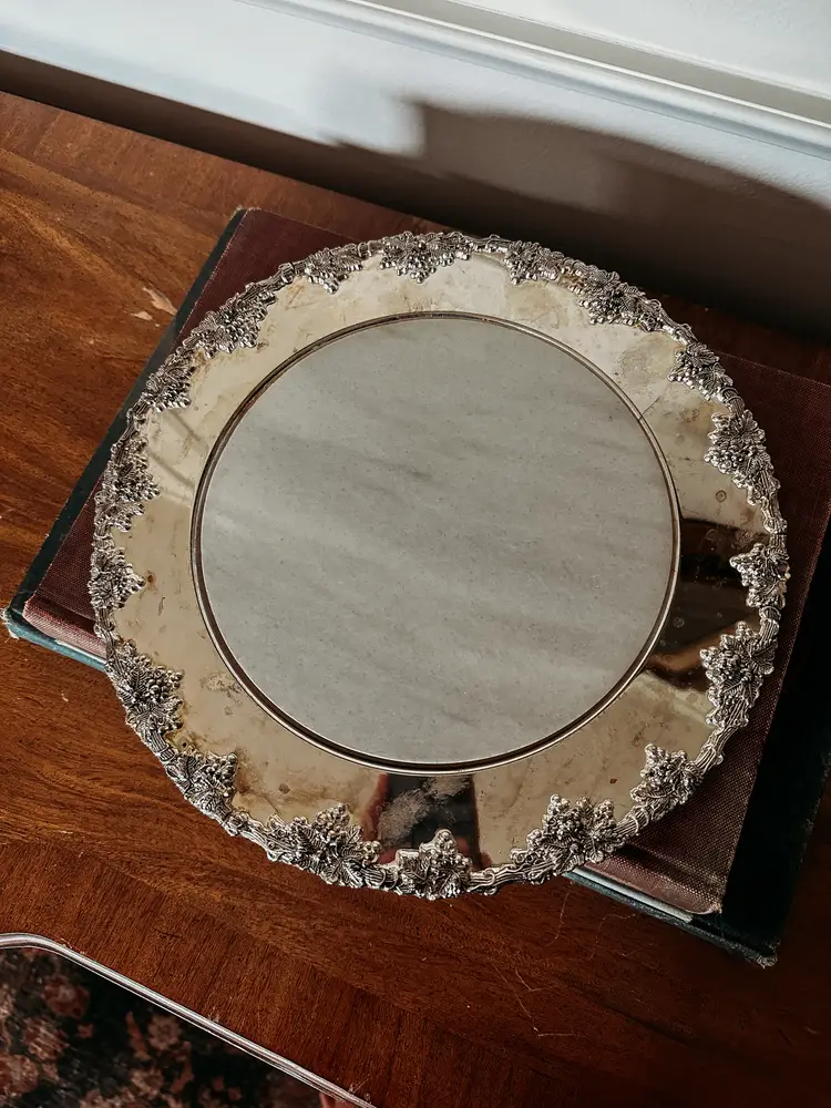 This is a beautiful Godinger silver plated cheese dish with a marble center. The plate measures 12 inches across and the marble center is 8 inches across. The edge of the plate is decorated with an ornate raised grape design.