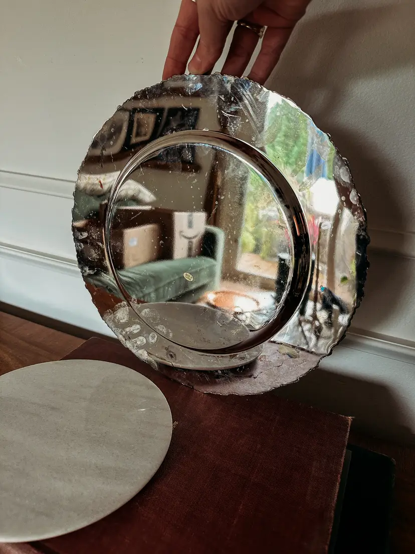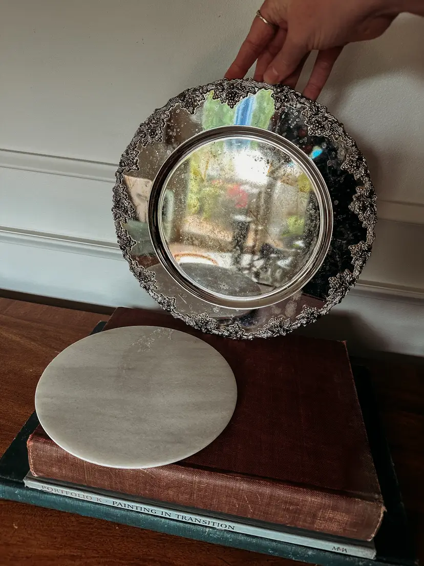 The bottom of the marble center is cork board. Really nice for entertaining. Piece shows some tarnish but can be easily polished to a high shine!