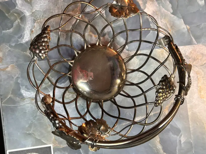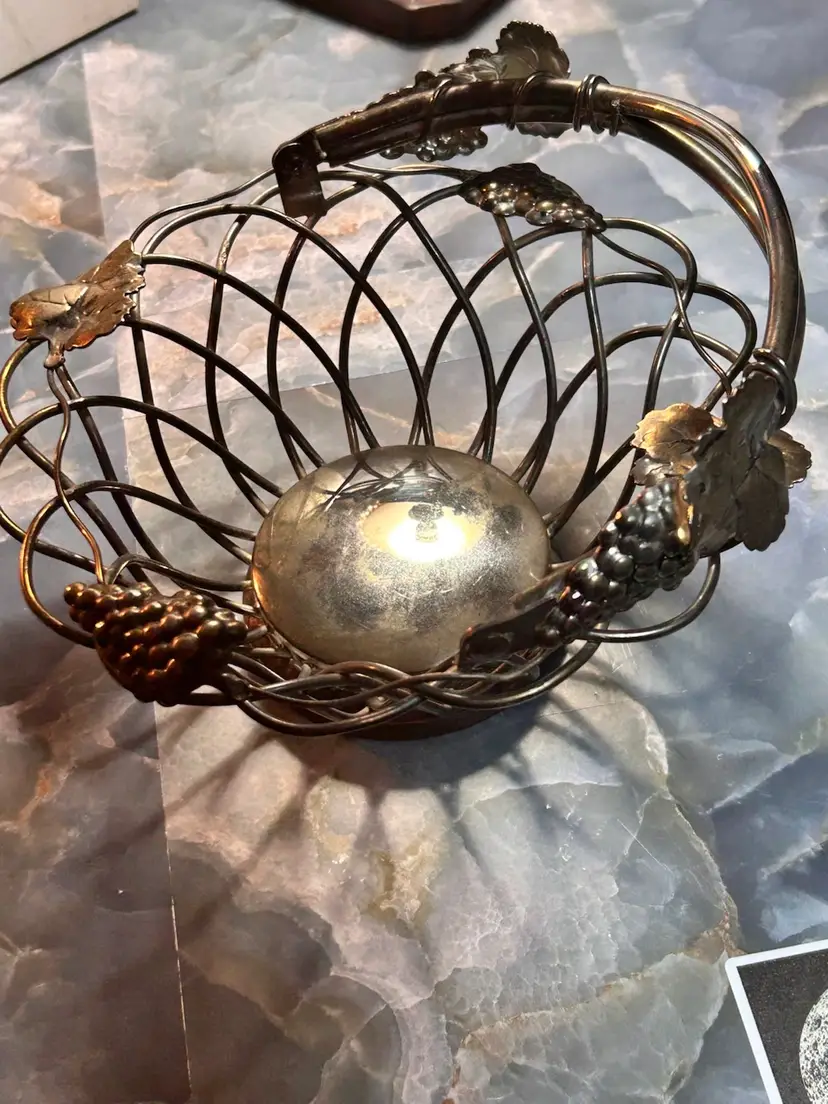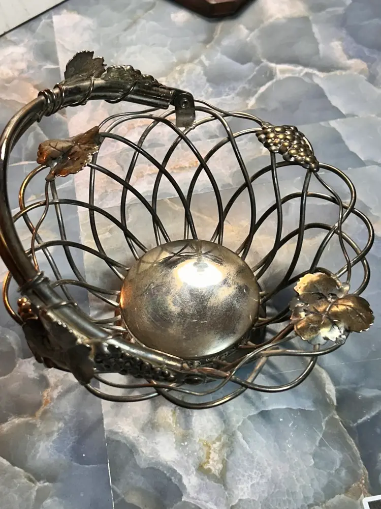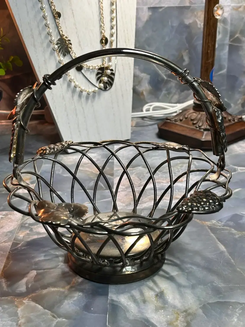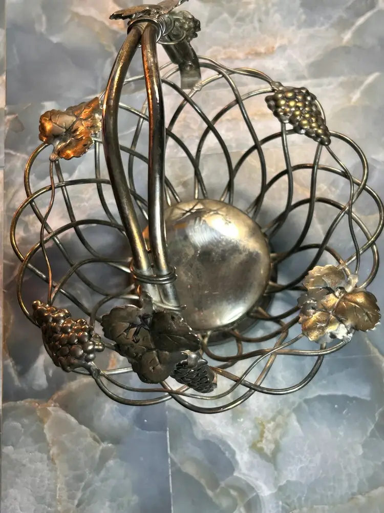 This swing handle wire basket with grapes and leaves is made by Godinger Silver Art. Has patina from age but will clean off with polish. It is a very nice vintage piece. All structurally sound with no breaks or nicks. Please see photos as they are part of the description. Thank you for looking!