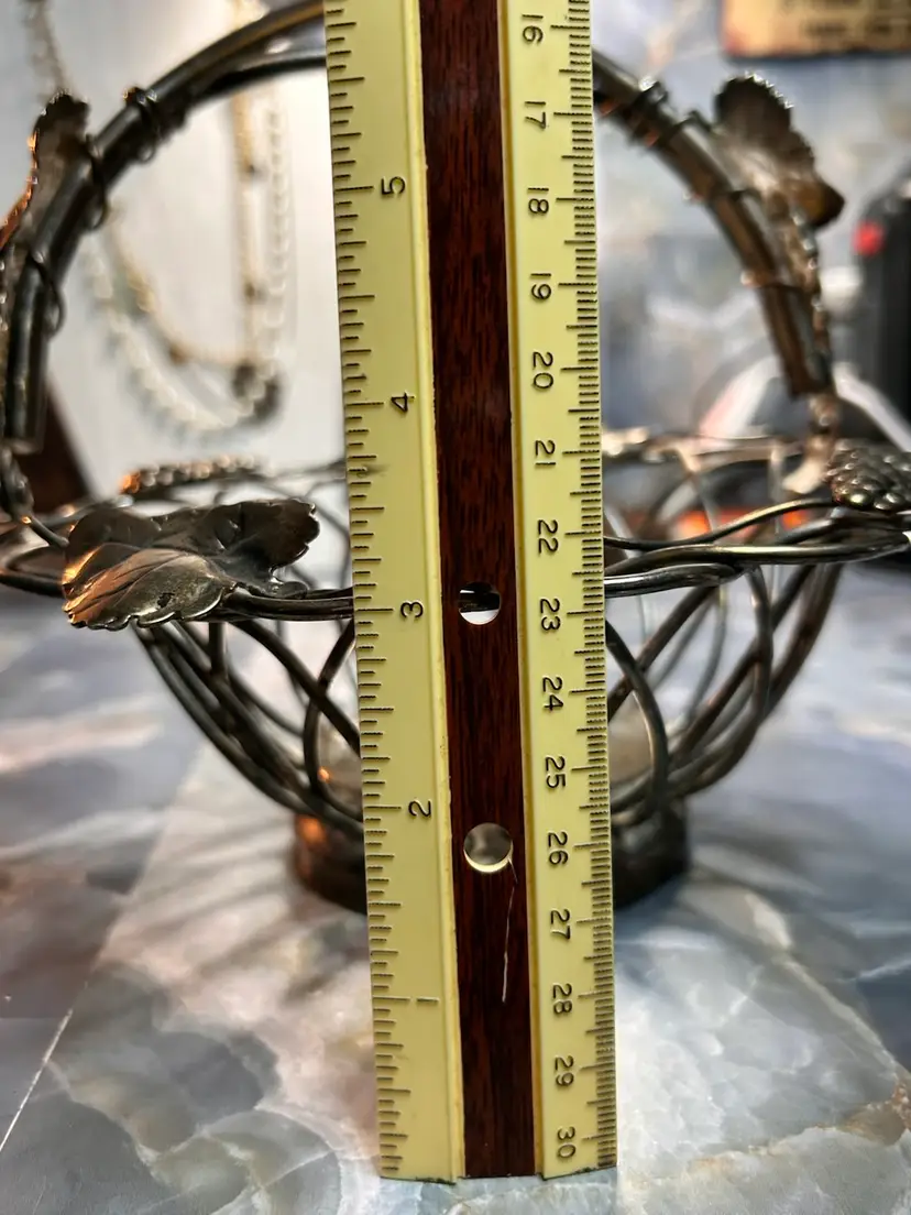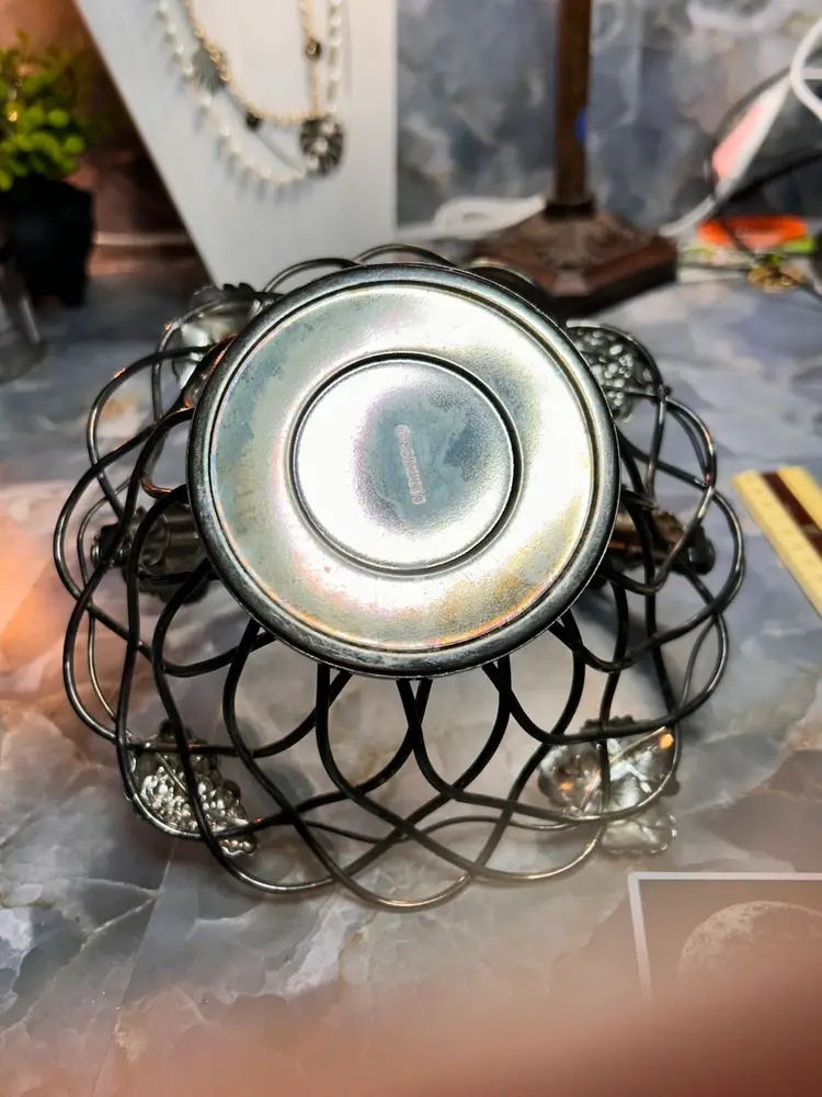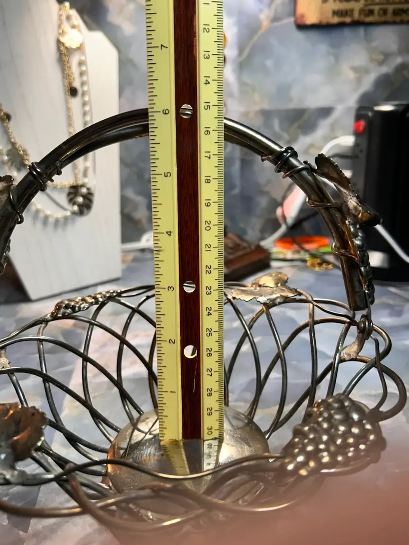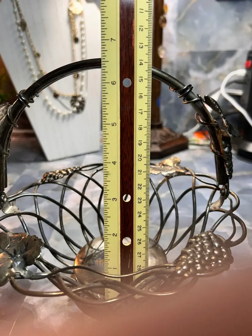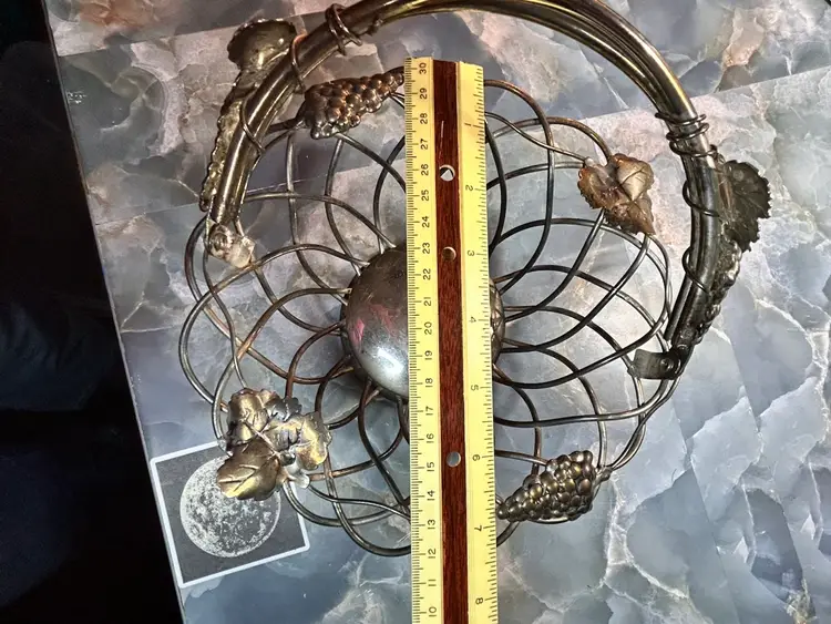 This swing handle wire basket with grapes and leaves is made by Godinger Silver Art. Has patina from age but will clean off with polish. It is a very nice vintage piece. All structurally sound with no breaks or nicks. Please see photos as they are part of the description. Thank you for looking!